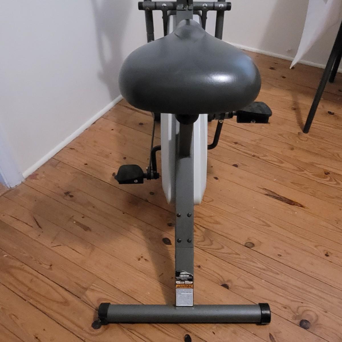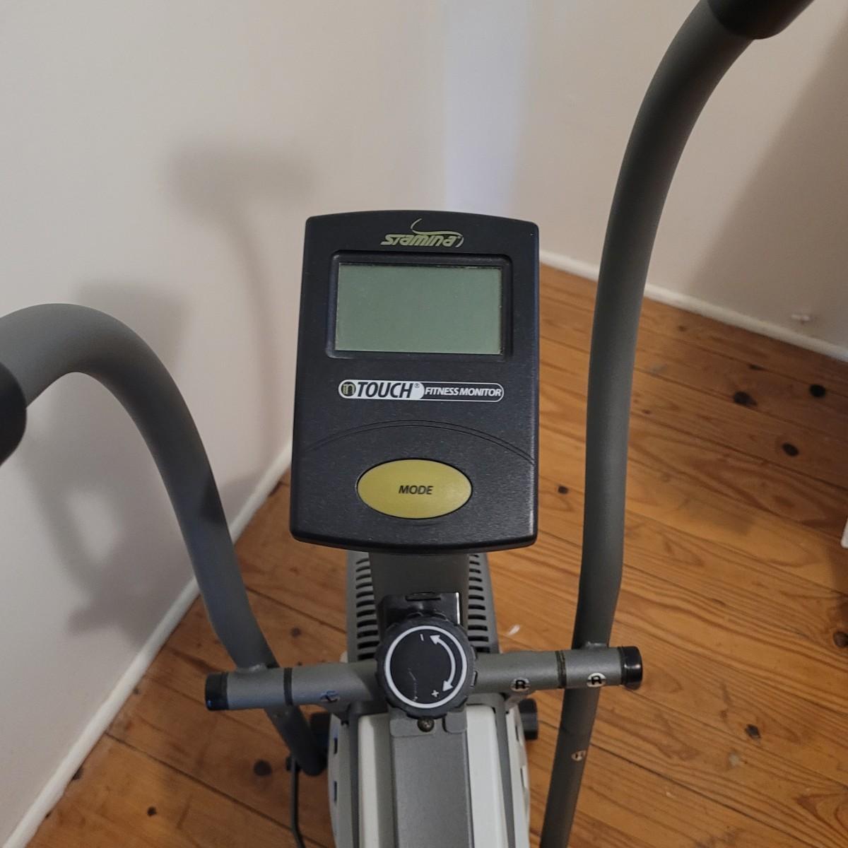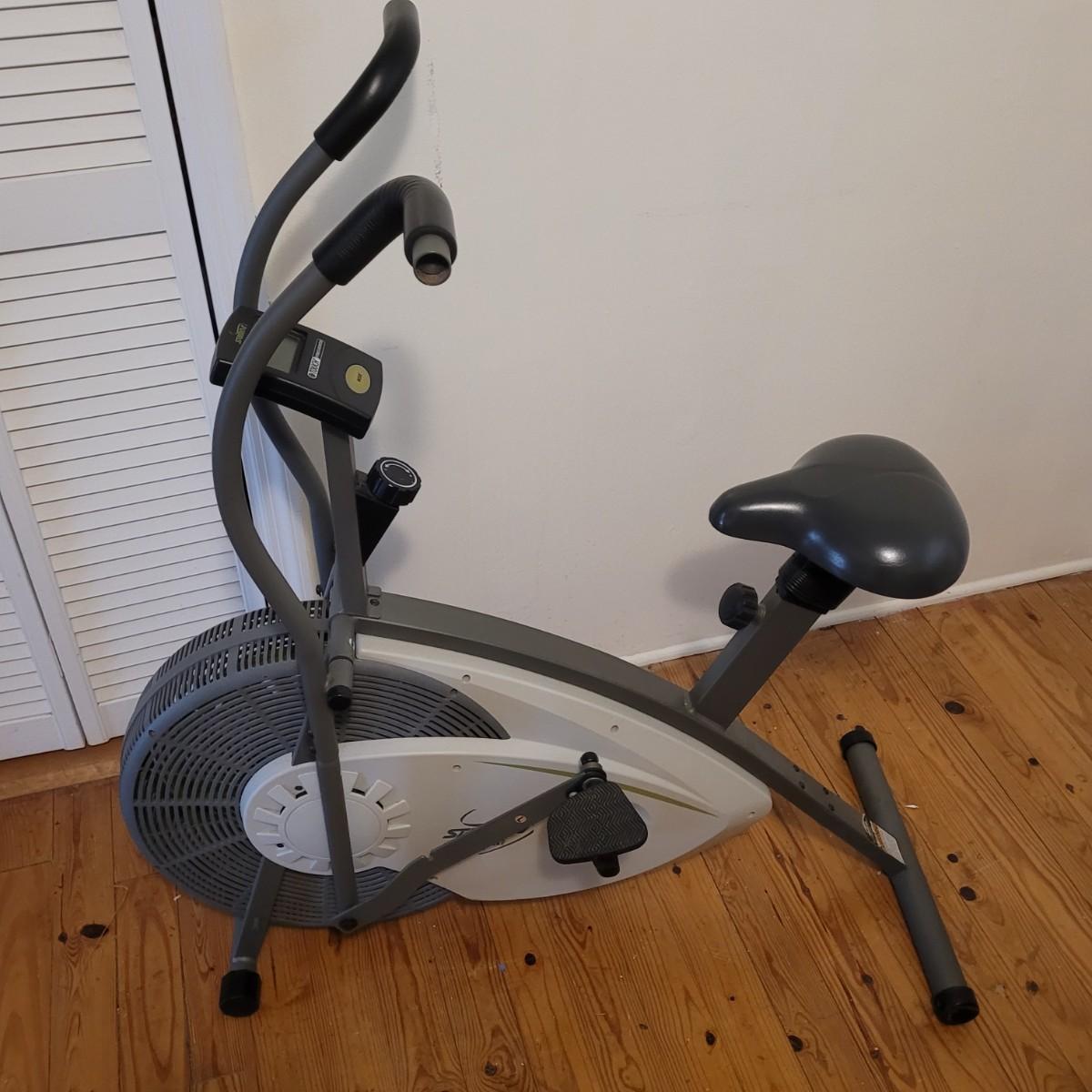Stamina UX2 air bike with attached fitness monitor. Also includes six dumbbells, BodyBlade, walking sticks, strap on fitness monitor, and traction cleats. Bike includes original paperwork. Four dumbbells are metal and two are sand filled. Strap on monitor is Manaflexx brand and appears to be new in box. Bike measures 22" x 42" x 46"H.