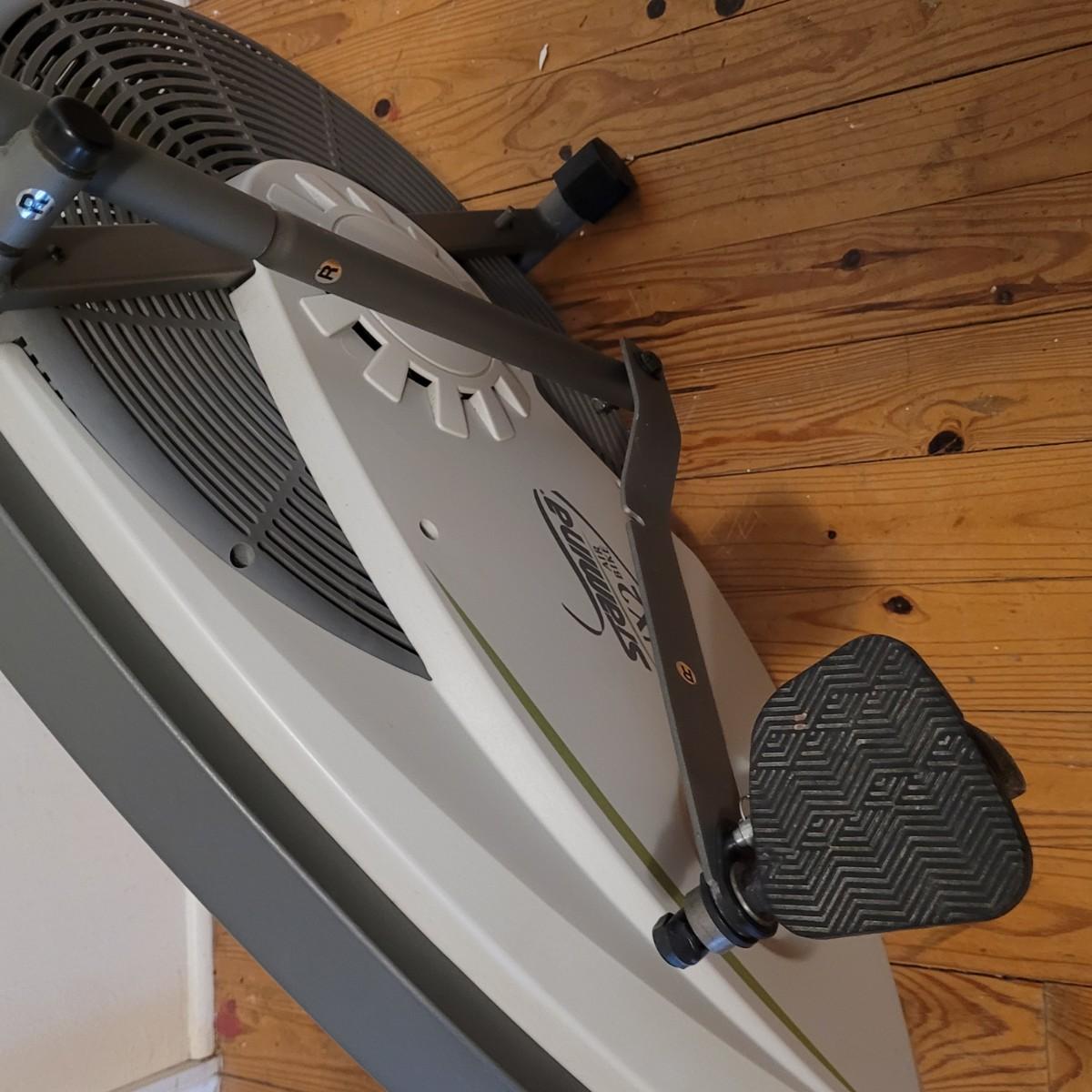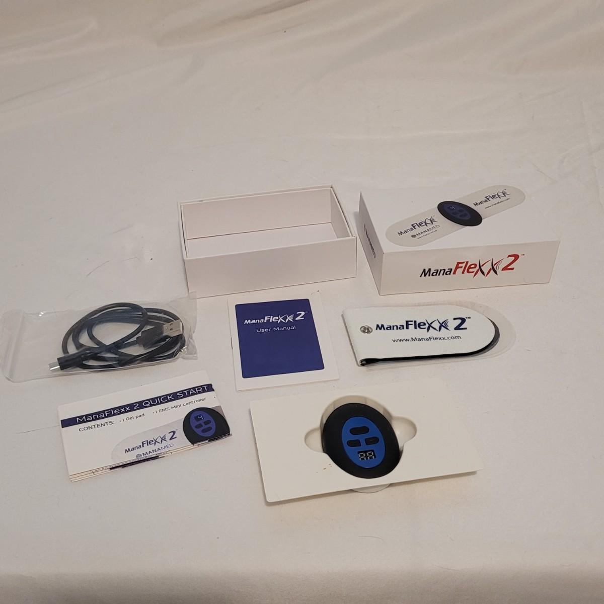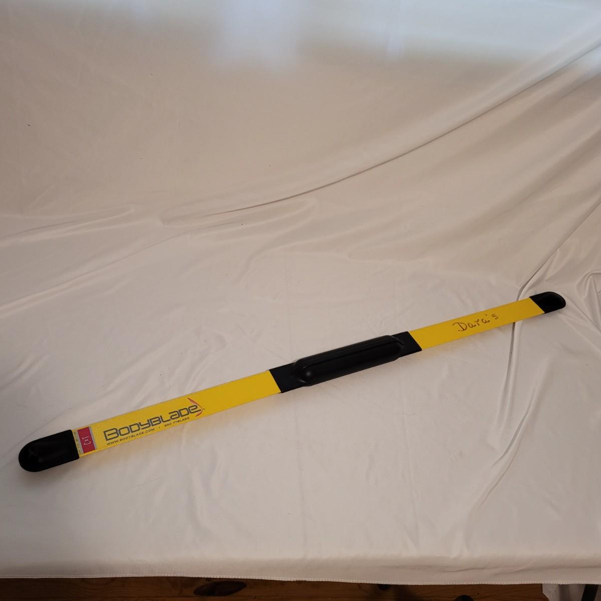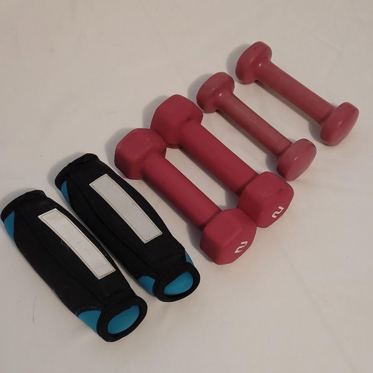 Stamina UX2 air bike with attached fitness monitor. Also includes six dumbbells, BodyBlade, walking sticks, strap on fitness monitor, and traction cleats. Bike includes original paperwork. Four dumbbells are metal and two are sand filled. Strap on monitor is Manaflexx brand and appears to be new in box. Bike measures 22" x 42" x 46"H.