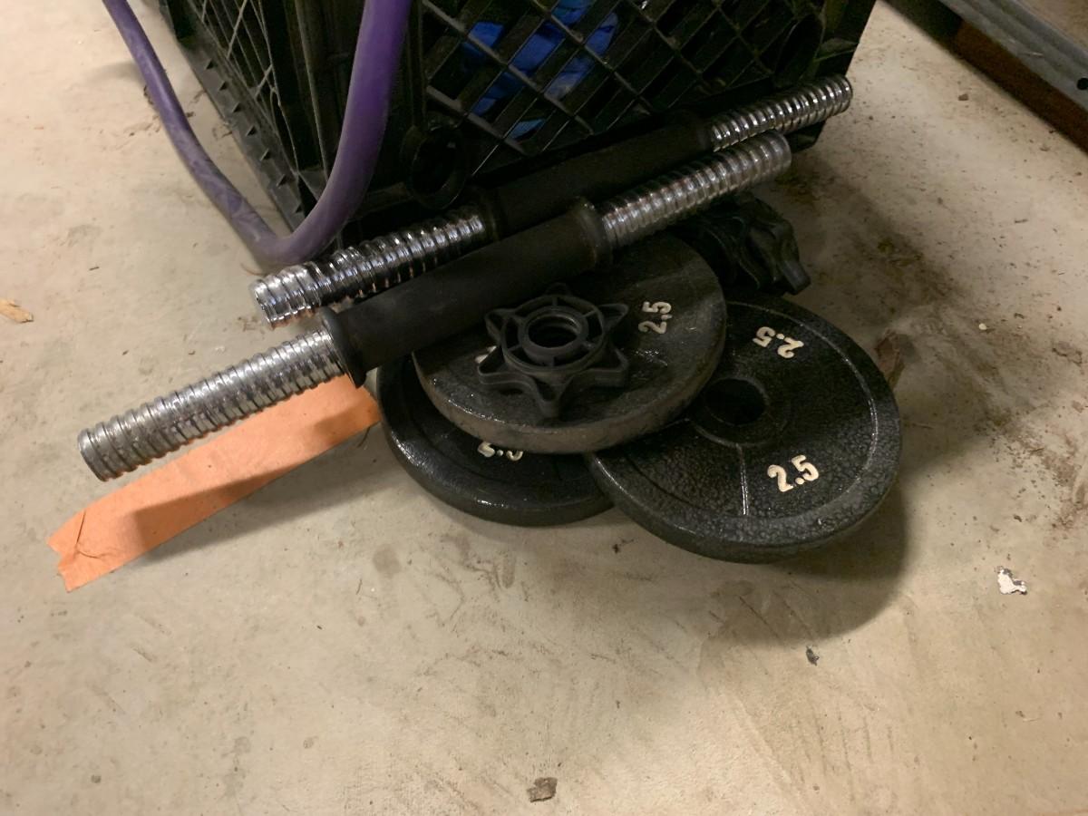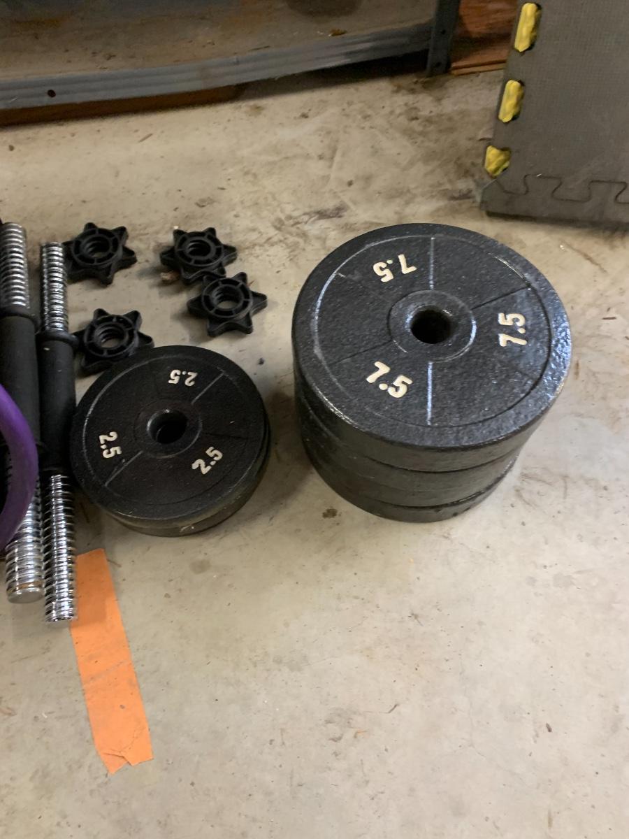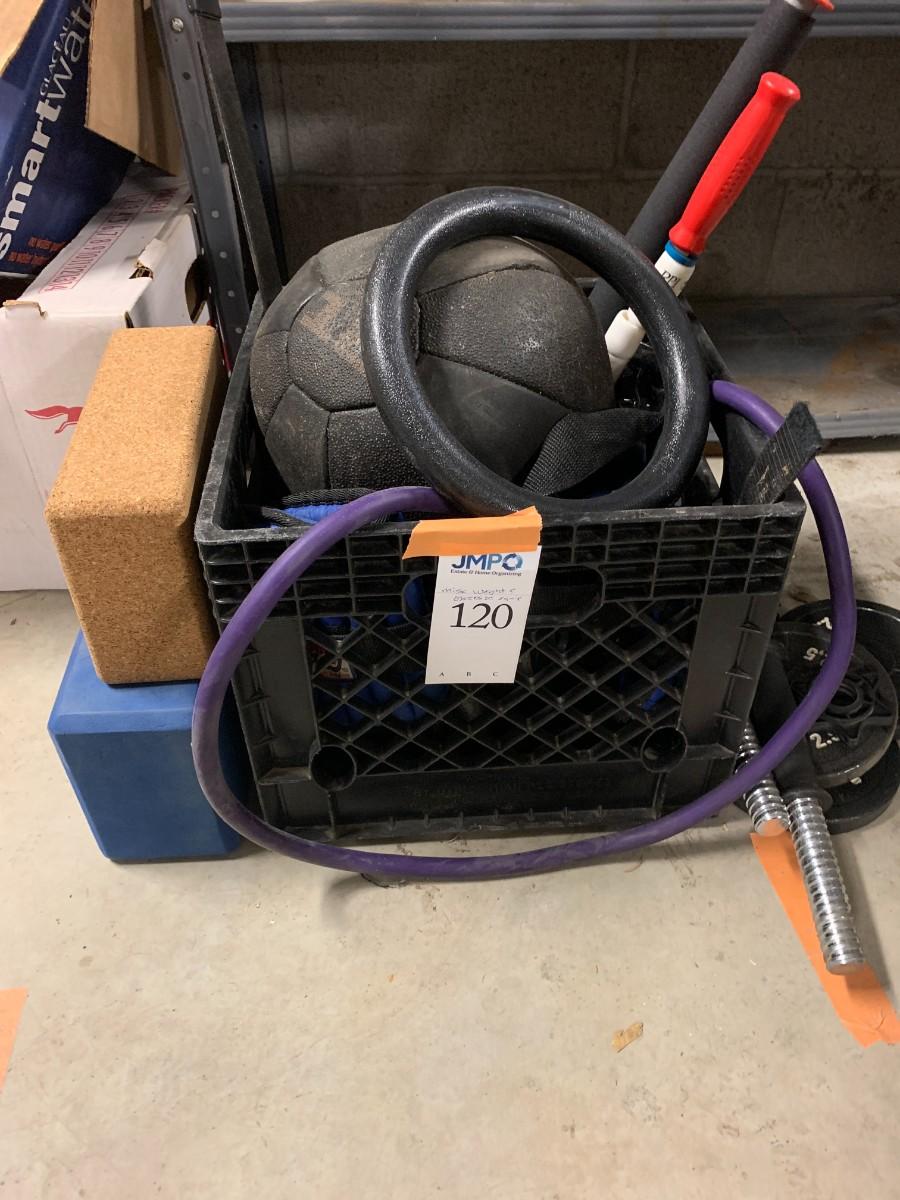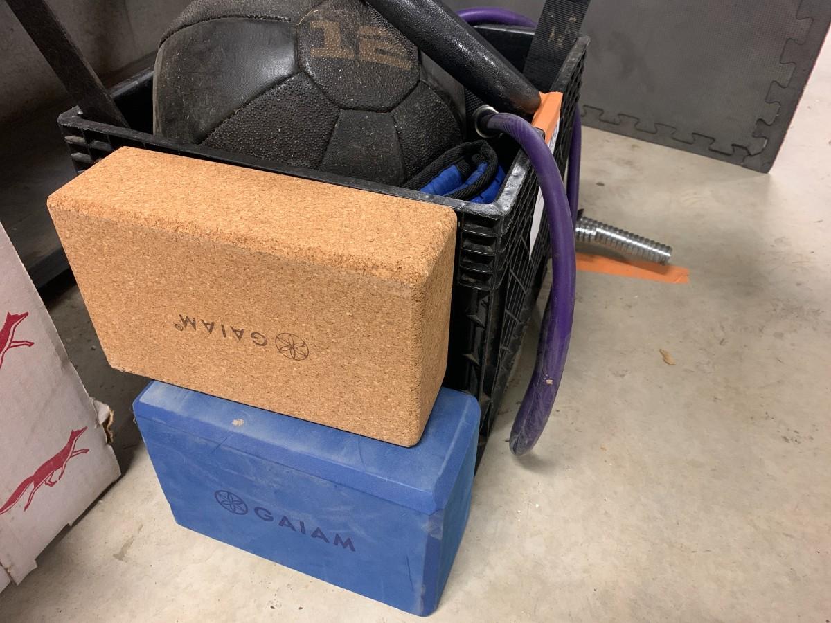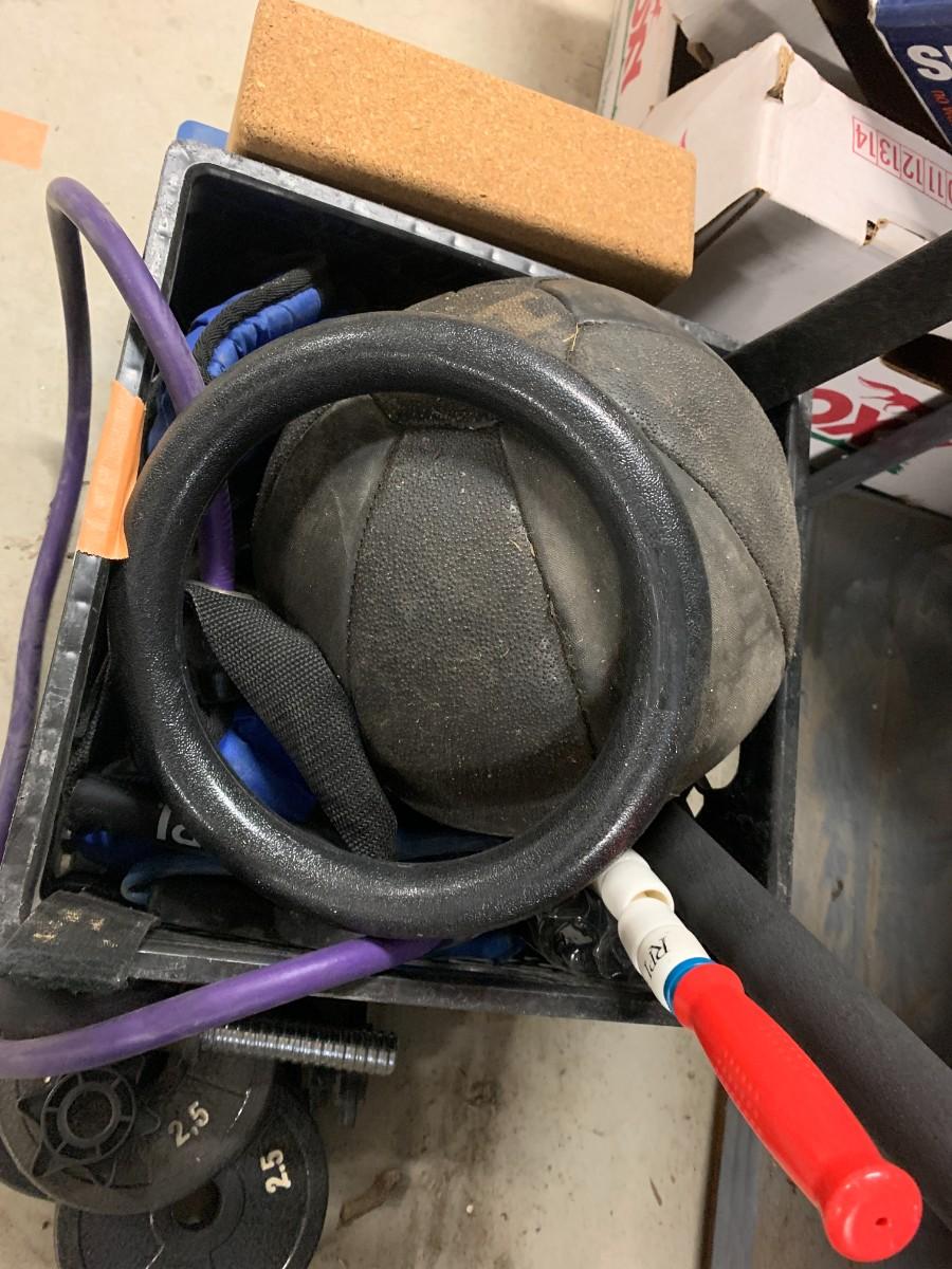 Dumbbell bars and weights. Medicine ball, yoga blocks, tension band, cramp roller