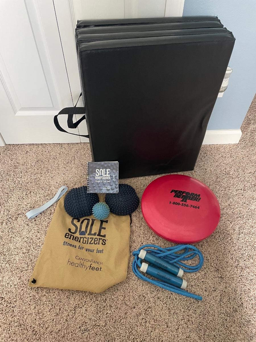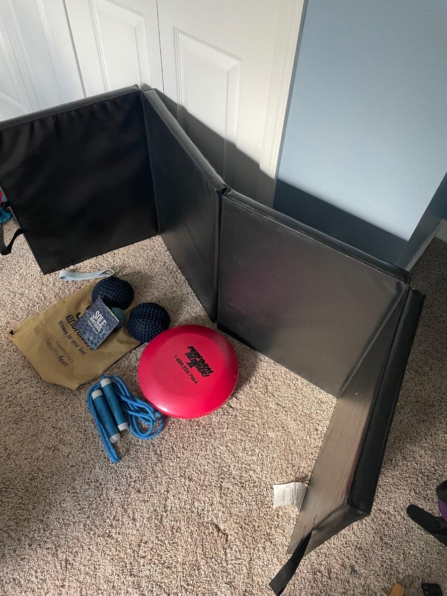 Black, vinyl folding exercise mat, balance pad, jump rope and a set of Sole Energizers, foot exercise system