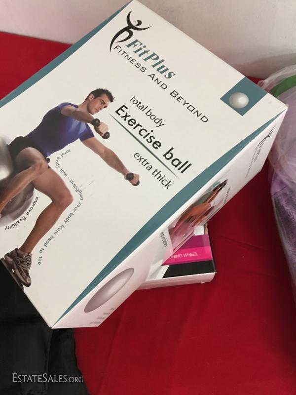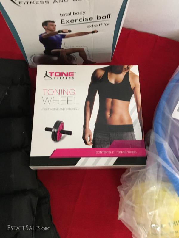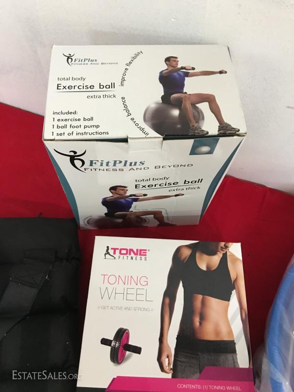 10 pound ankle weights, toning wheel, 2 exercise balls w/pump.