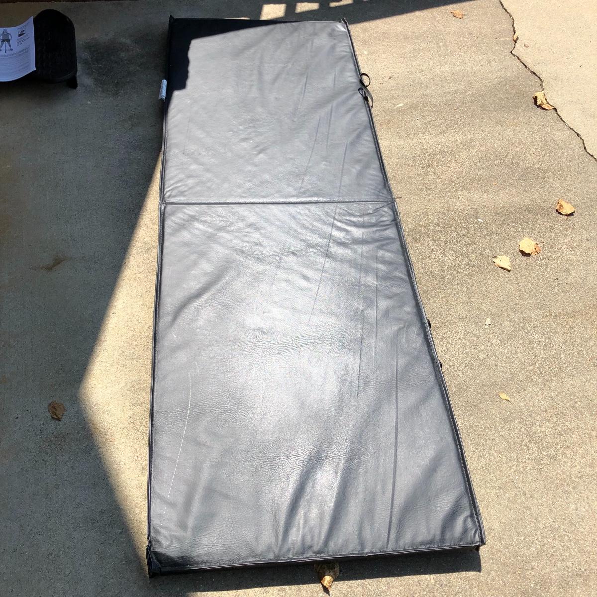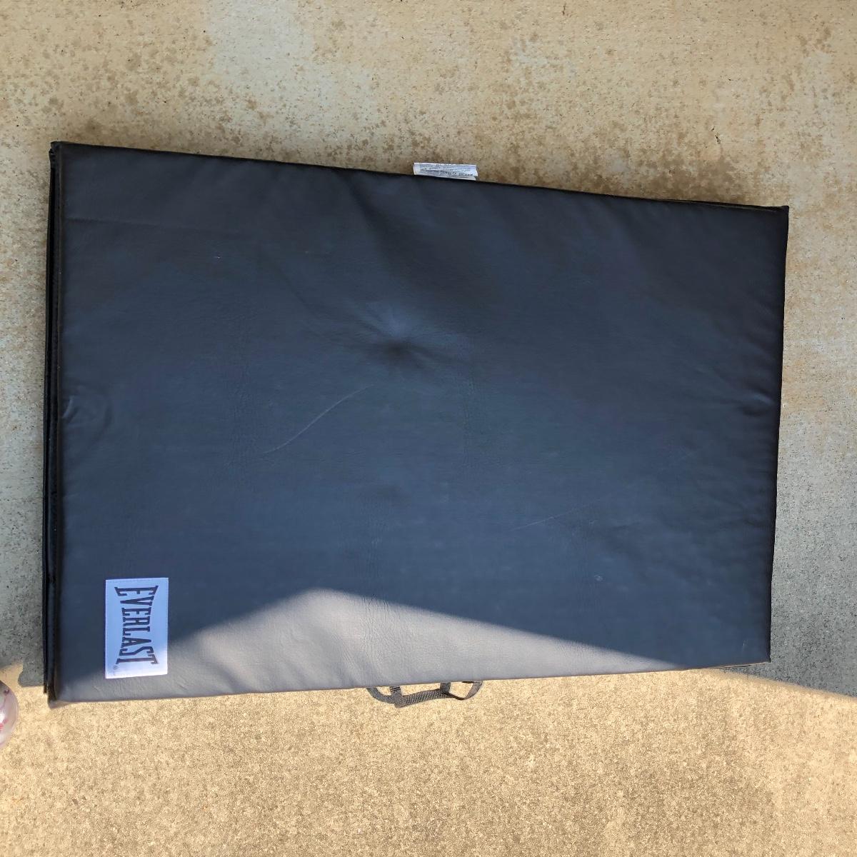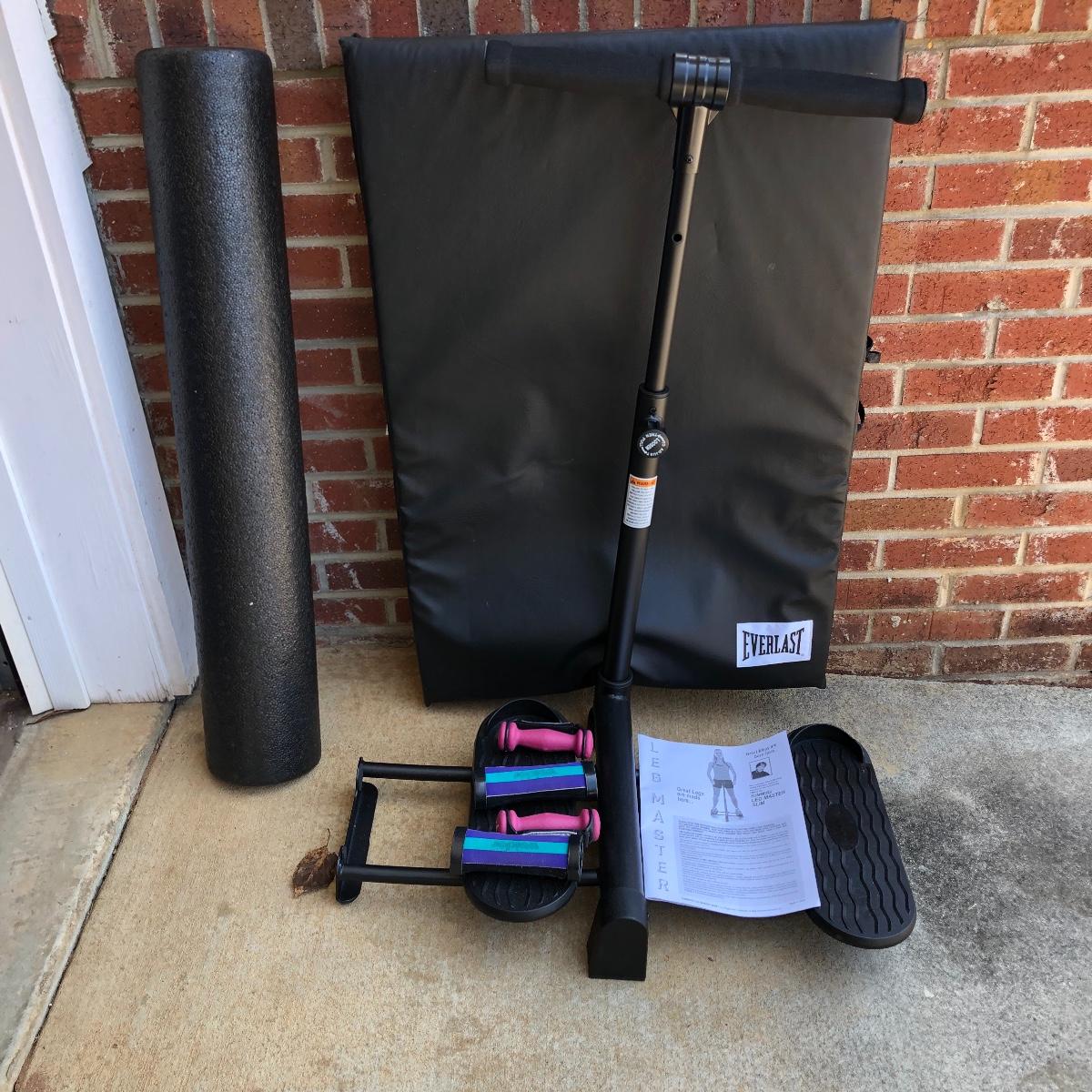 Lot includes Everlast padded folding mat that measures 24” x 72” x 2”, two 2lb and 1lb dumbbells and a Leg Master exercise machine.