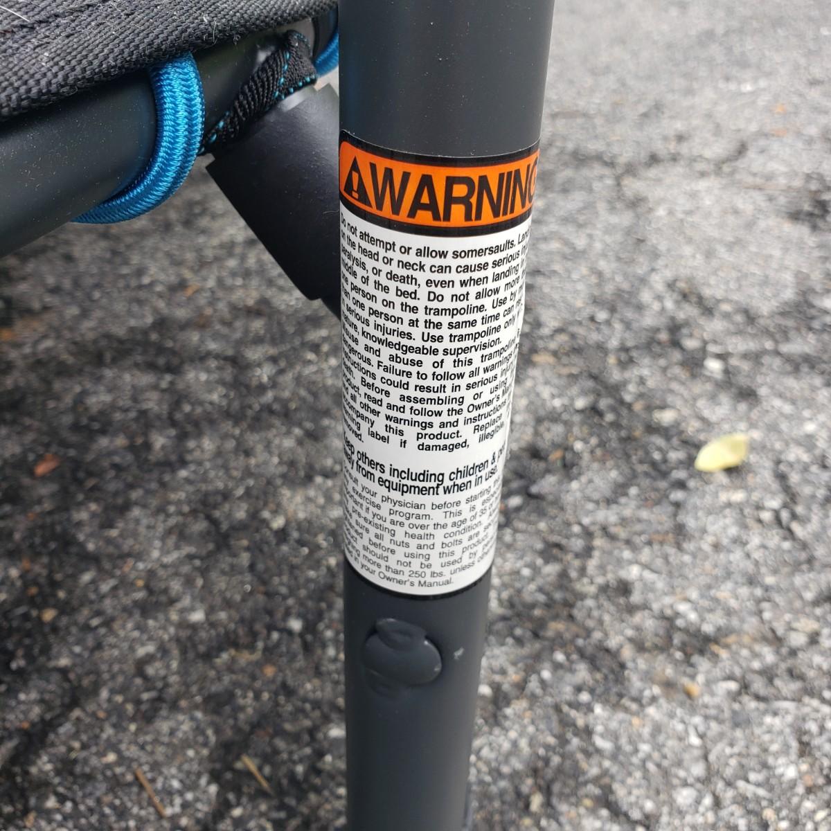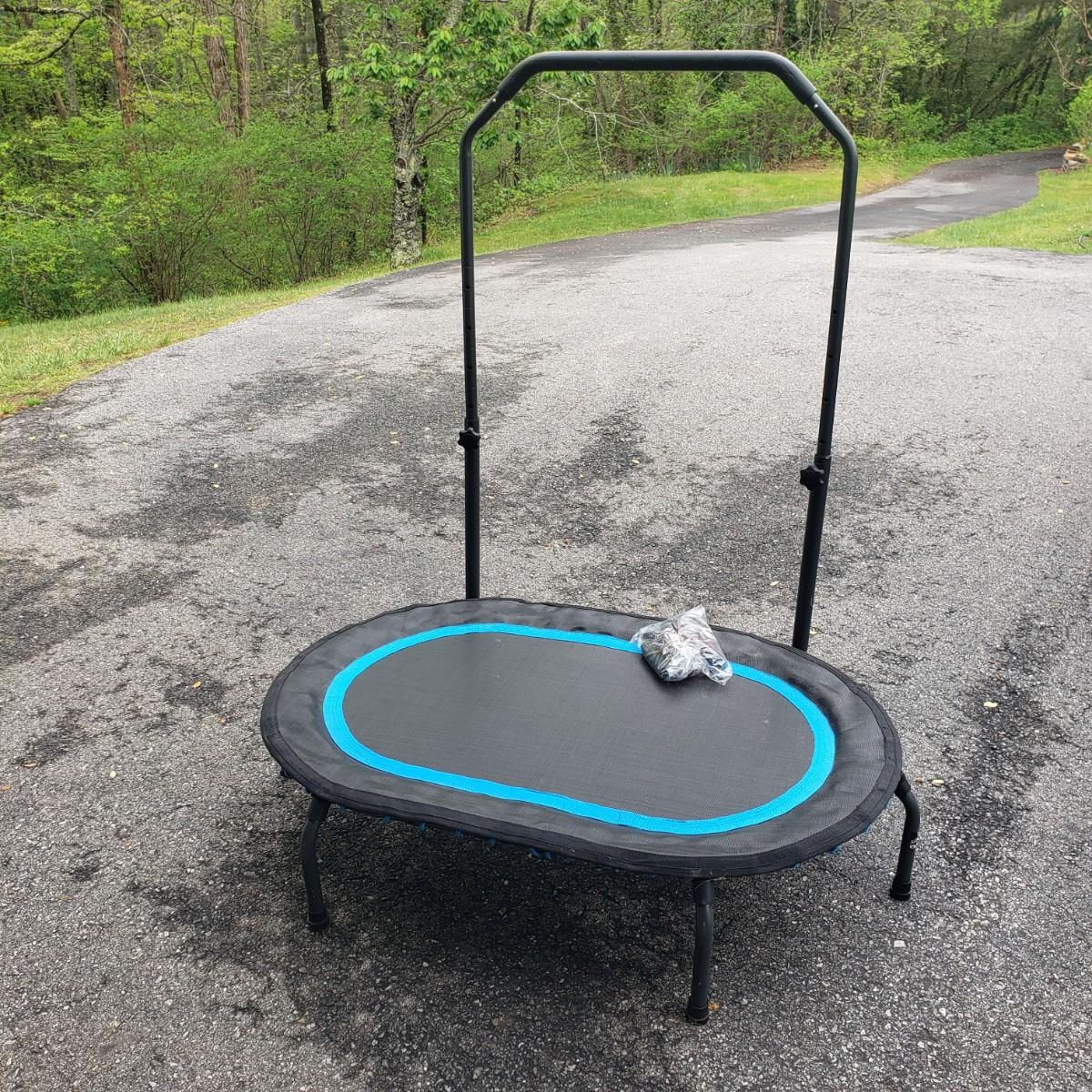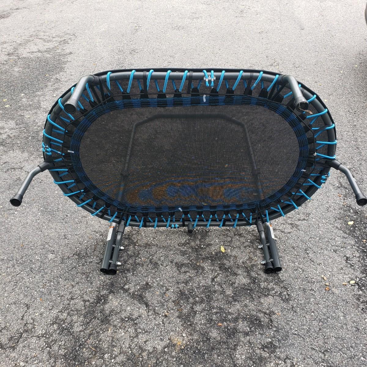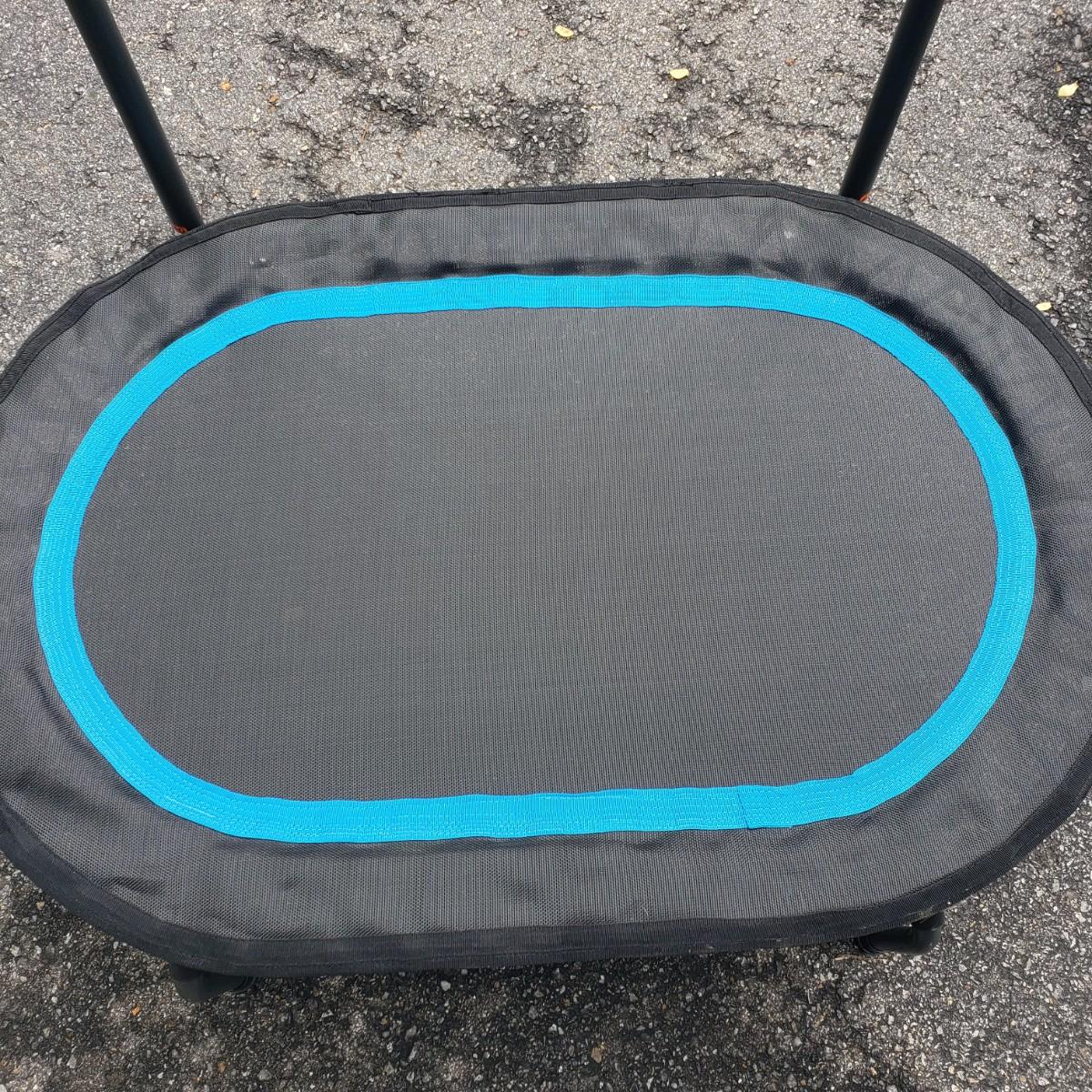 This appears to be a barely used mini exercise trampoline. It measures 46" x 30" x 46"H, although the height is adjustable. The bar for the height has various holes to adjust to proper height. Comes with NIB elastic handles that clip into the base.
