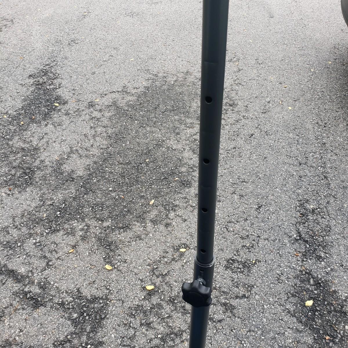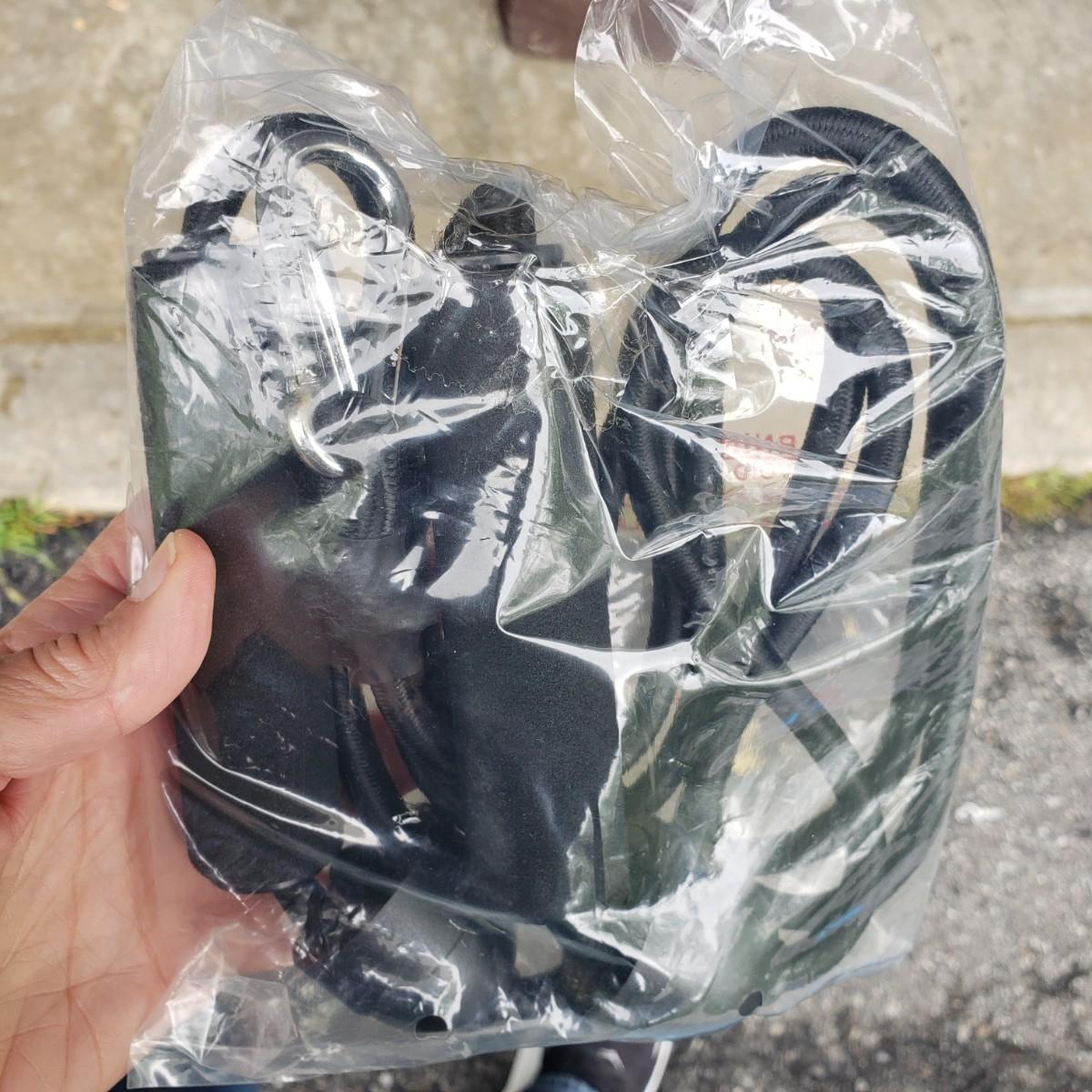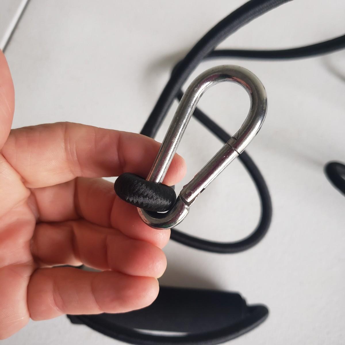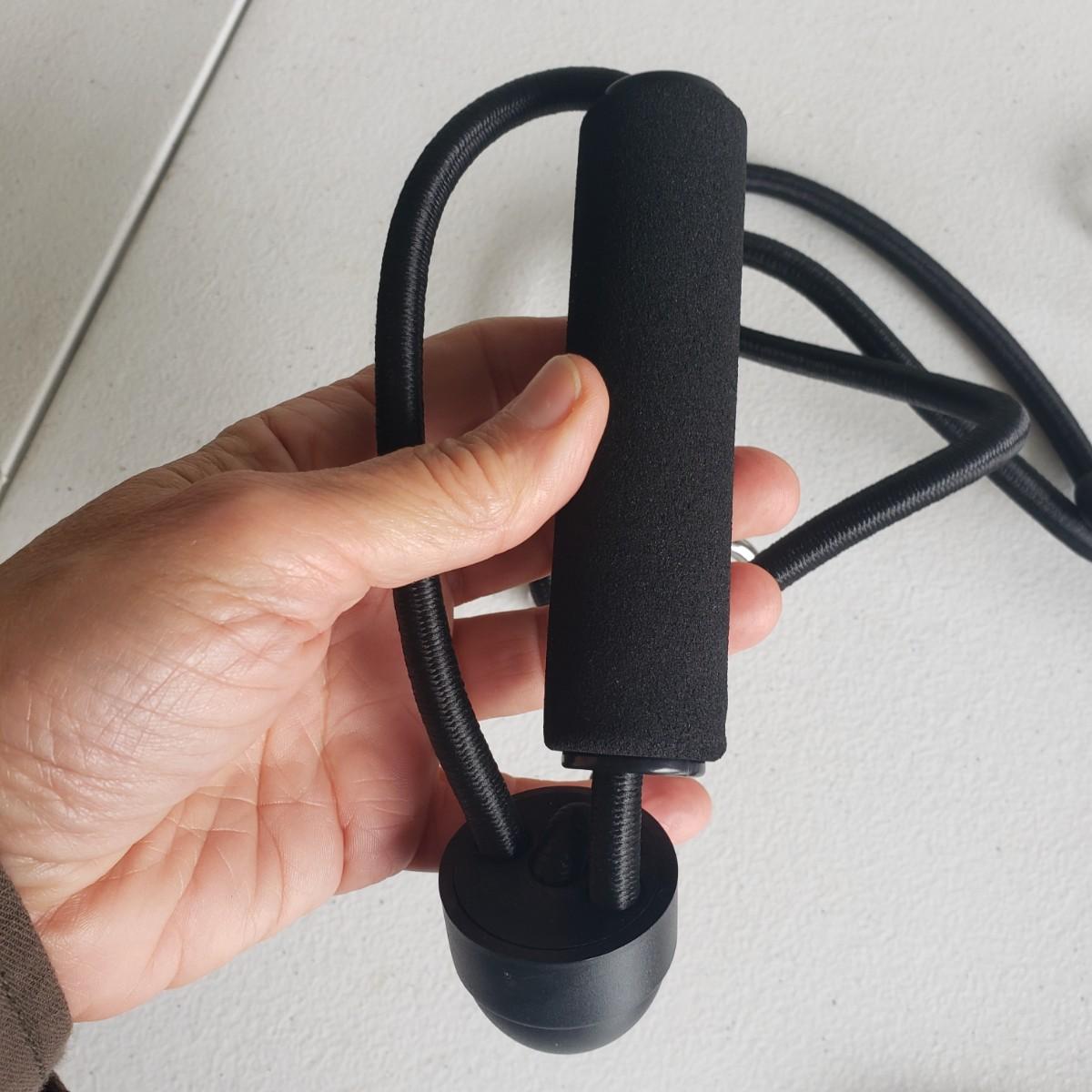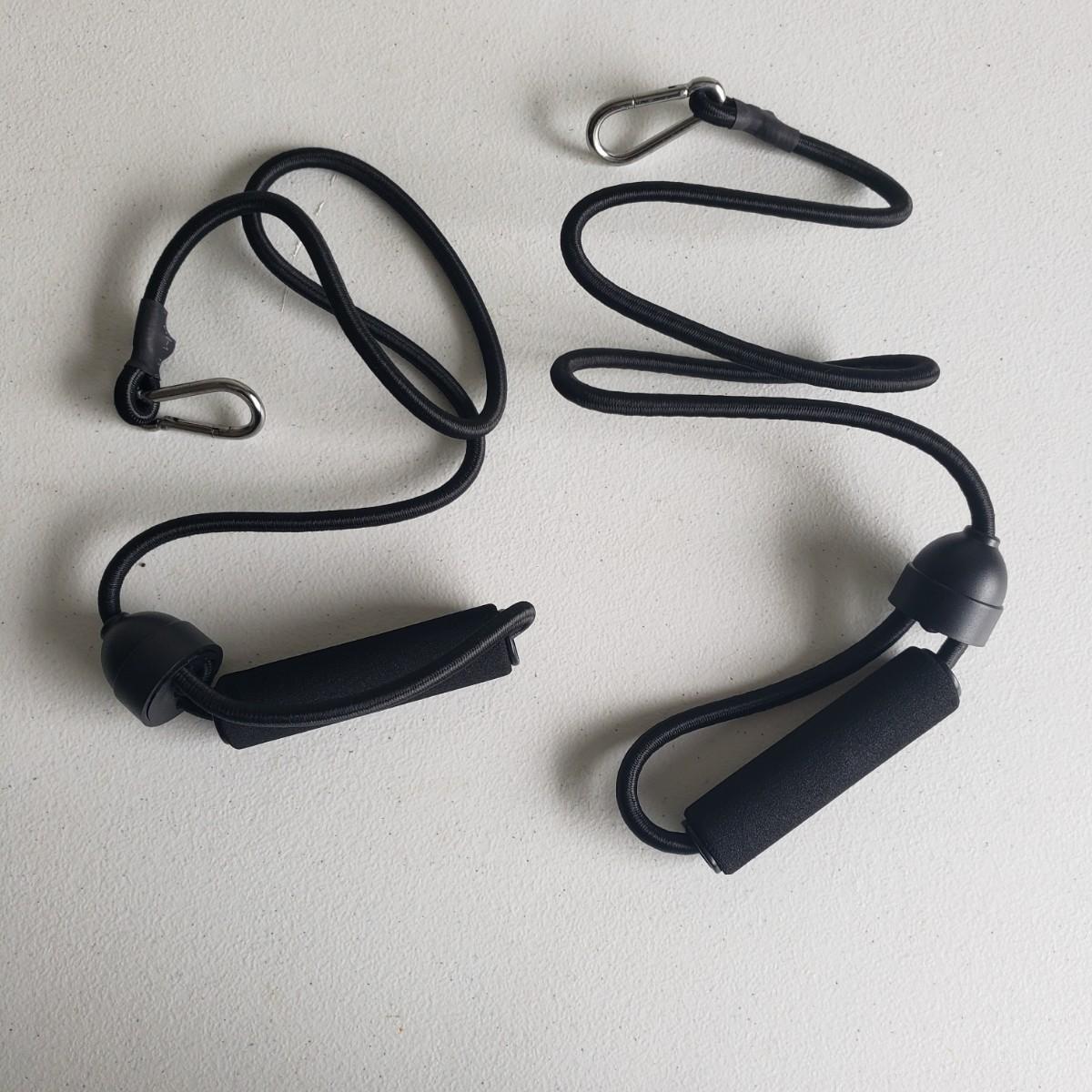 This appears to be a barely used mini exercise trampoline. It measures 46" x 30" x 46"H, although the height is adjustable. The bar for the height has various holes to adjust to proper height. Comes with NIB elastic handles that clip into the base.