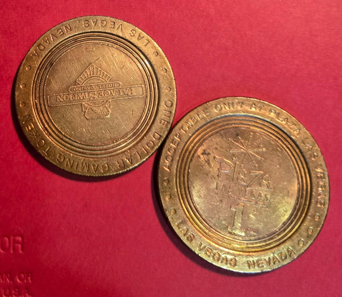 This lot is for Vintage Vegas Casino Gaming Tokens. Here are two $1 gaming tokens from two casinos still operating - Palace Station and The Plaza Hotel. The casinos no longer use these types of token and will not redeem them, so now they are considered collectibles. They are both about 1.5-inches in diameter and are in used condition.
