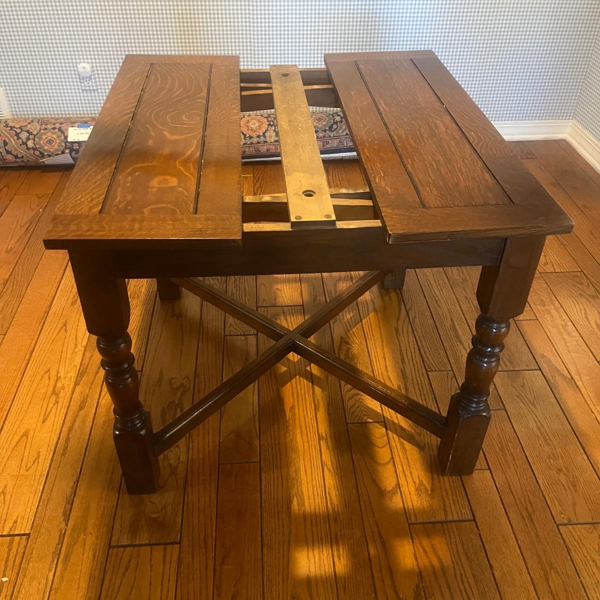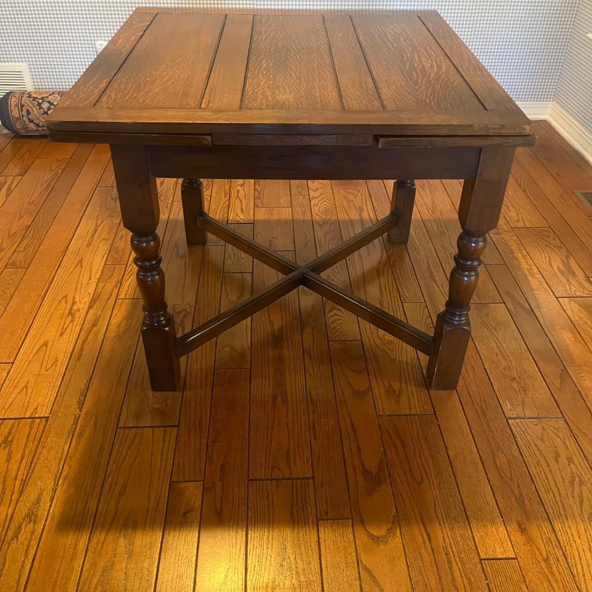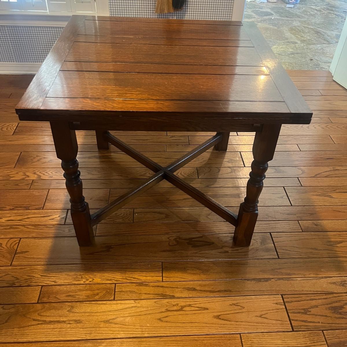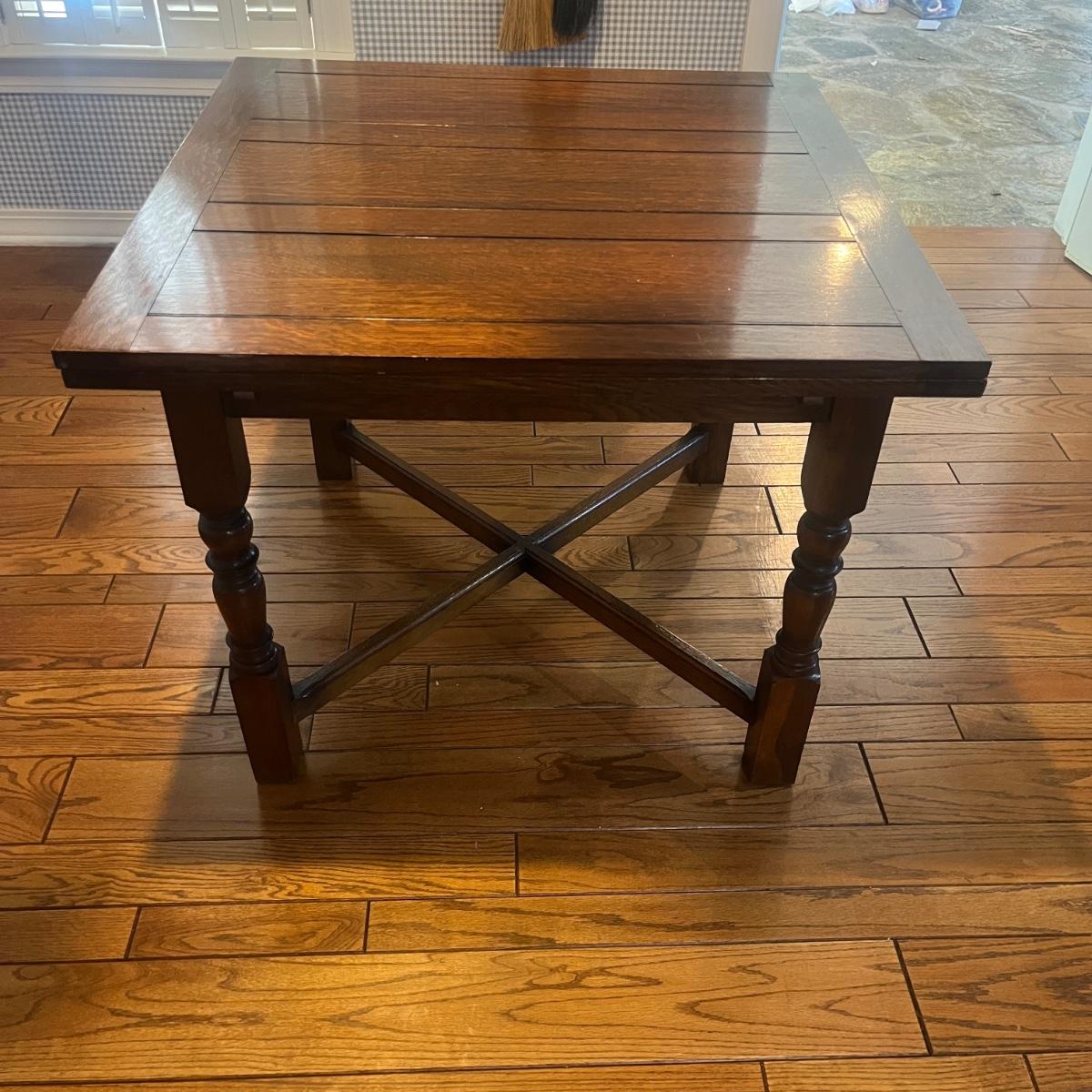 Lot includes an expandable solid wood dining table that measures 35.5” x 35.5” x 30”H when closed and 35.5” x 59” x 30”H when expanded.