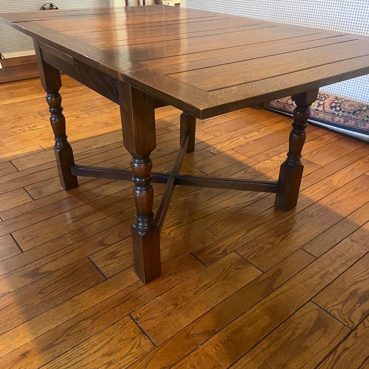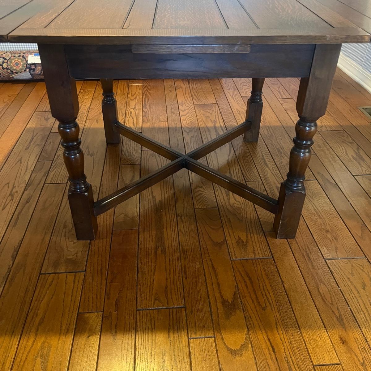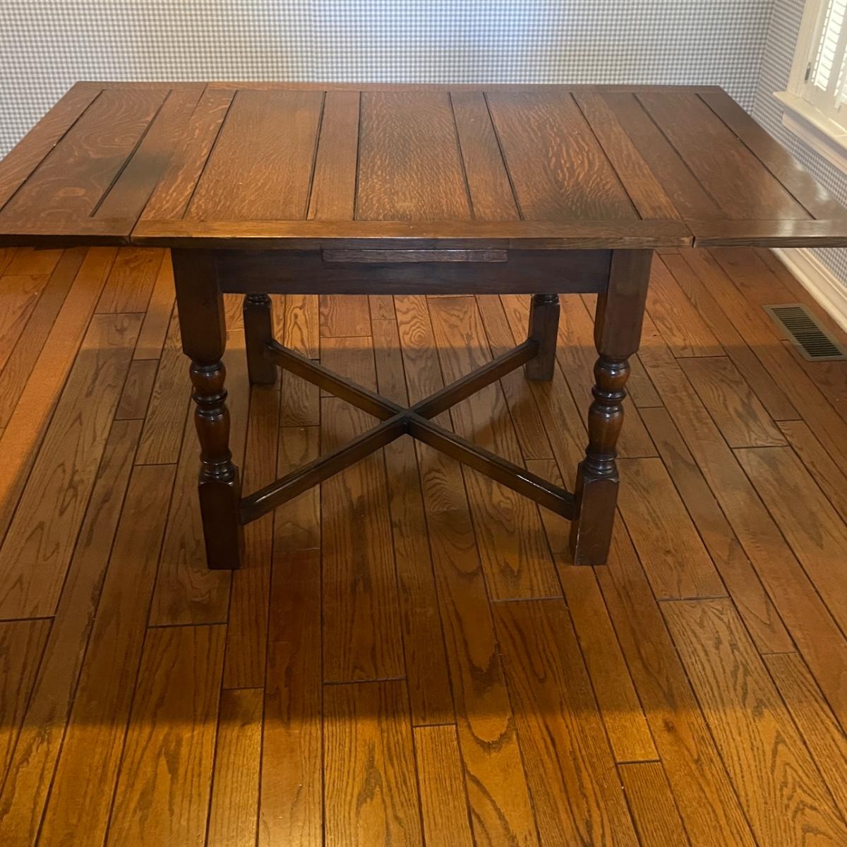 Lot includes an expandable solid wood dining table that measures 35.5” x 35.5” x 30”H when closed and 35.5” x 59” x 30”H when expanded.