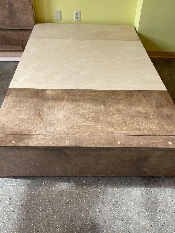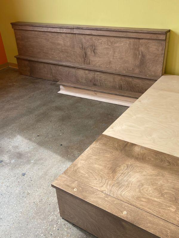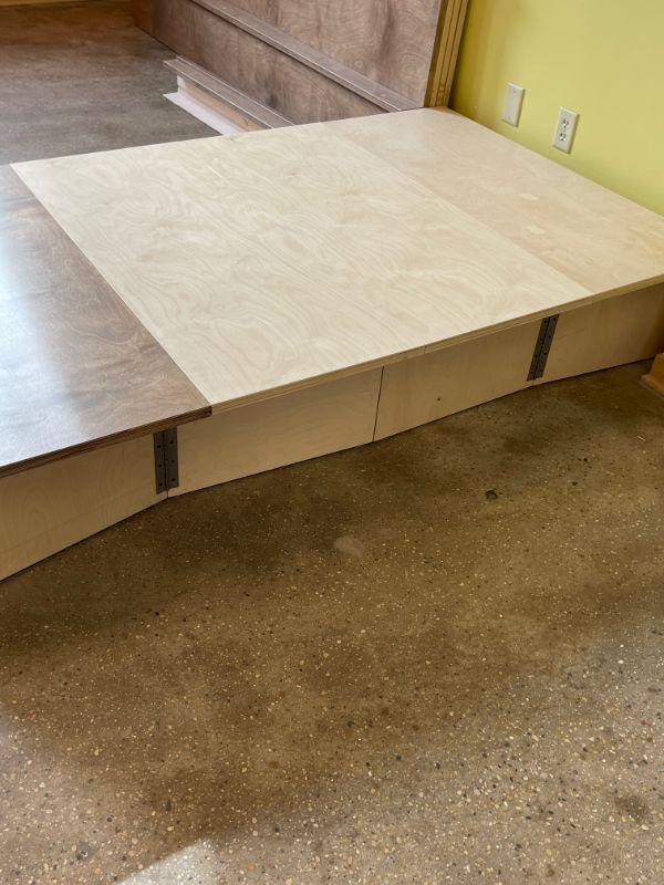 Craftsman built 1 of 1 works on a hinge system and expands out when needed and folds in to be almost flush against wall when not in use. 3 sections provide a large stage or runway with using very little storage space.