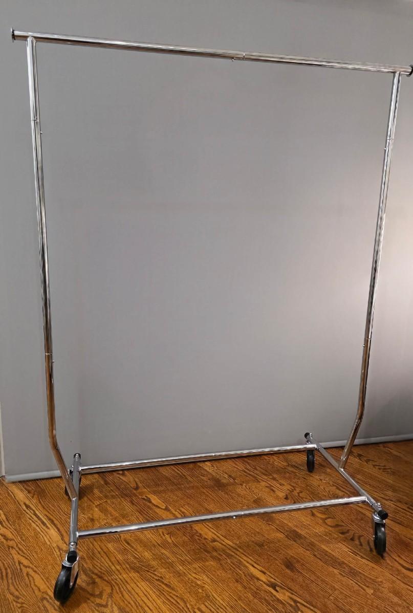 Expandable Rolling Clothing Rack, height and length. Side bars collapse for easy transport. There are 3 available. You are only bidding on one here. Please see items 49KBMN and 50KBM to bid on the others separately.