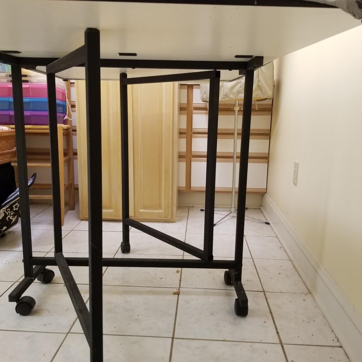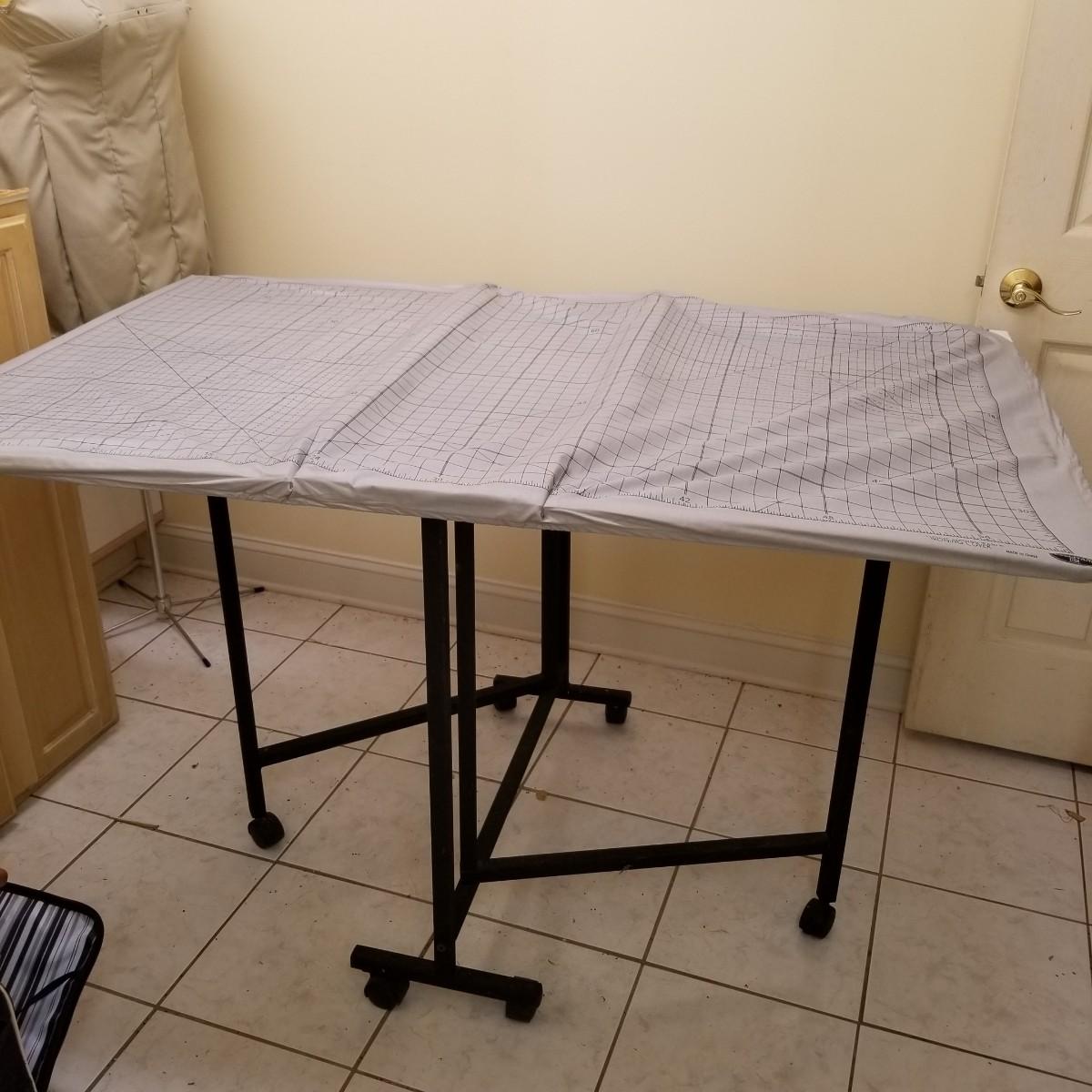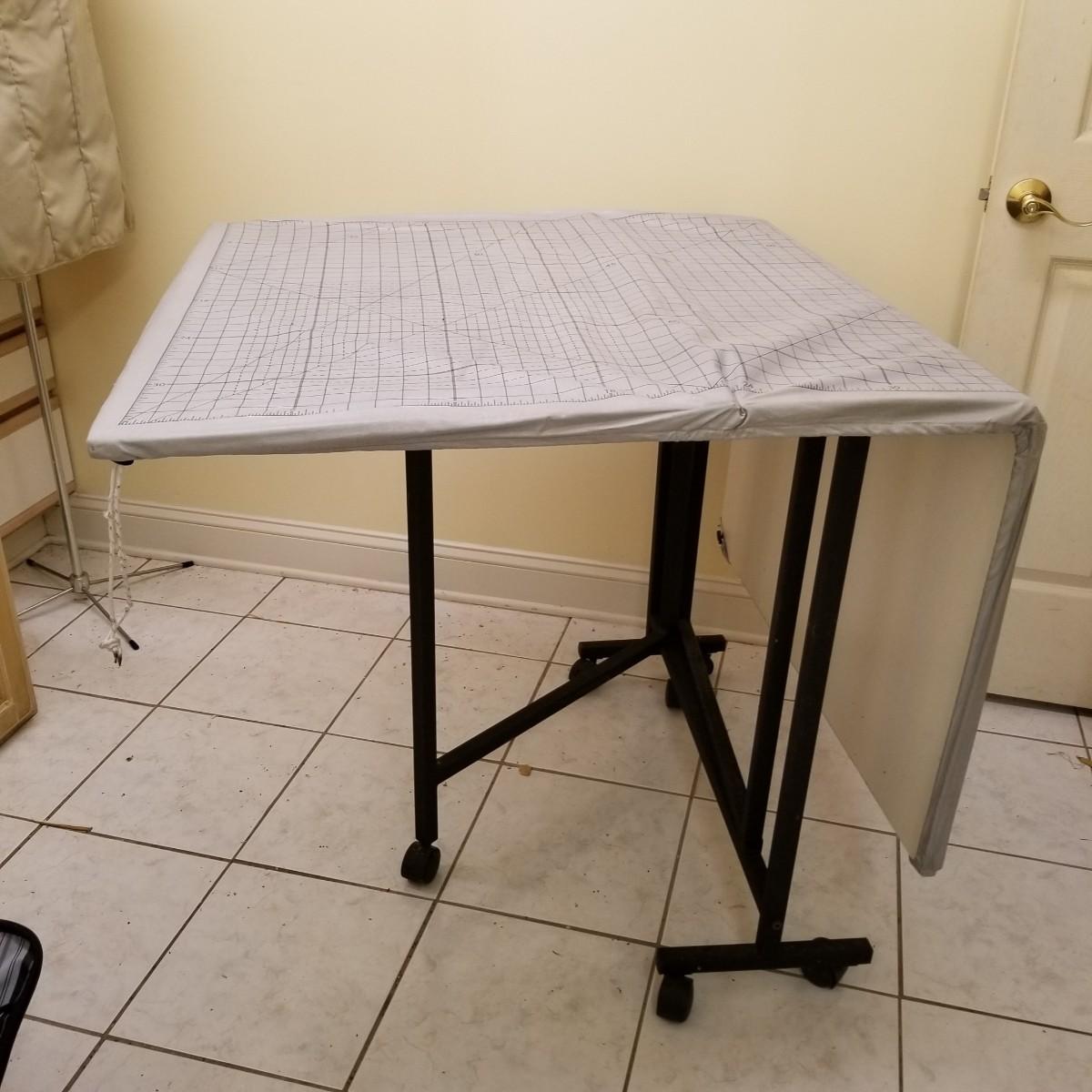 Rolling craft table, white formica style top and extendable gate legs, this table measures 36"x60"x35" when open and 36"x14"x35" folded down for storage. Has a Sullivan's grid/layout ironing cover on the the top, one corner is torn. See photos for details. Local pickup only.