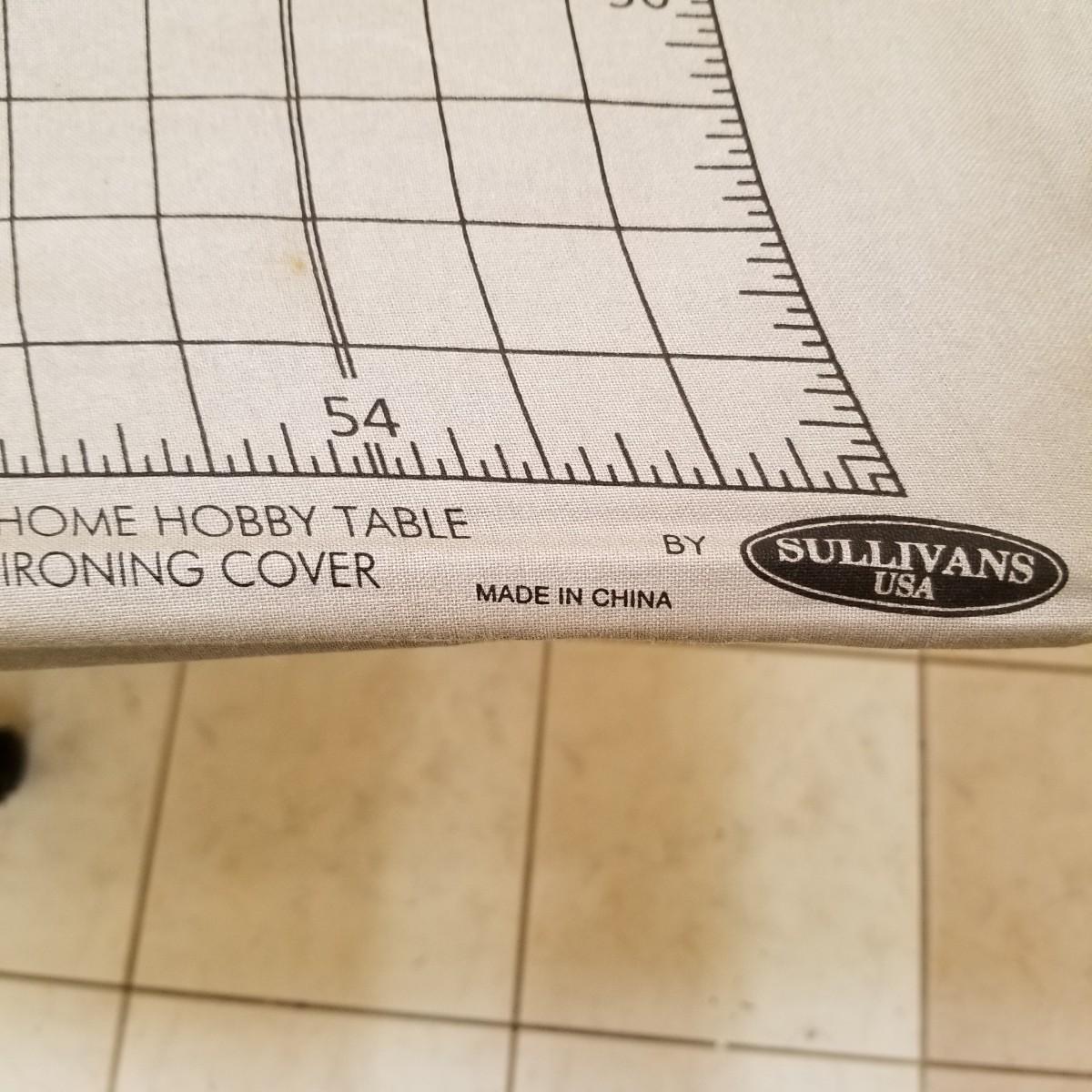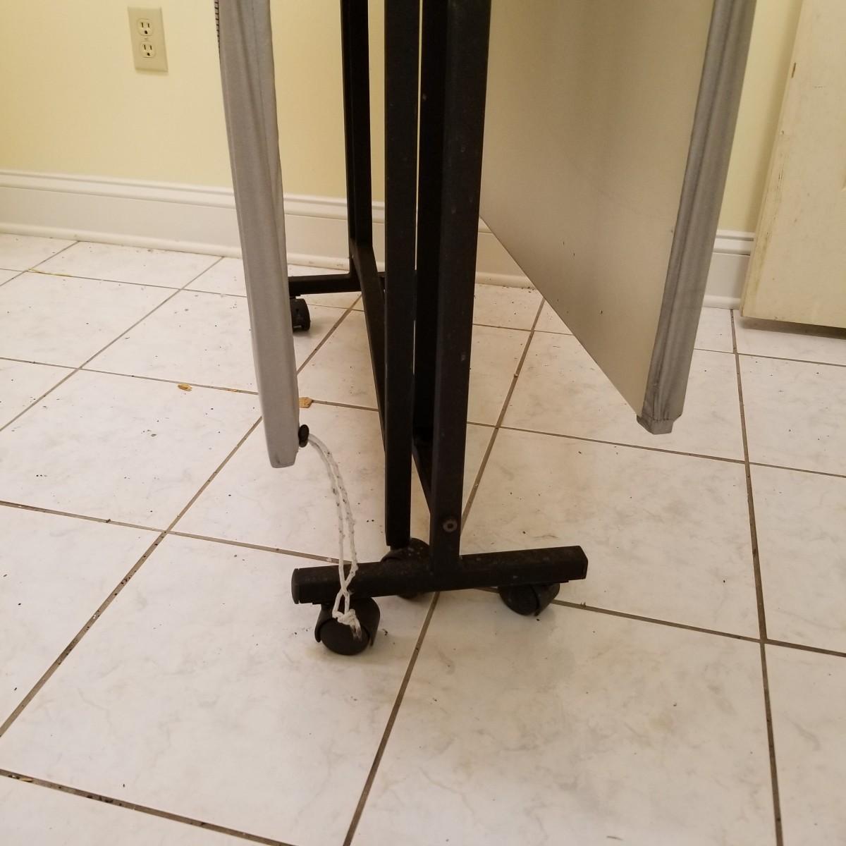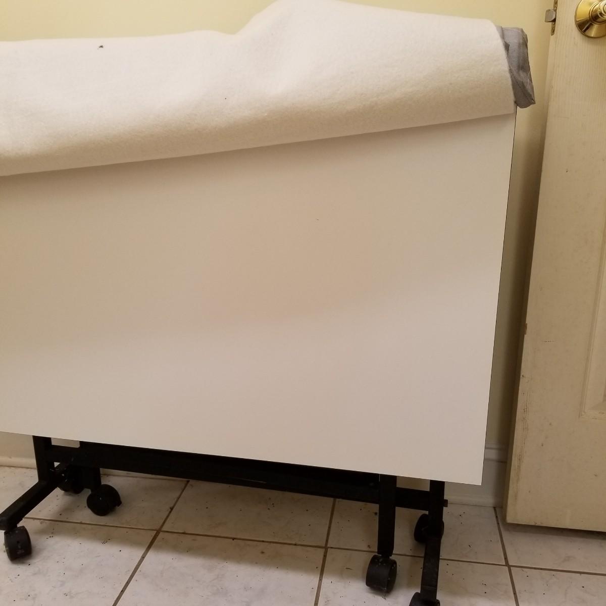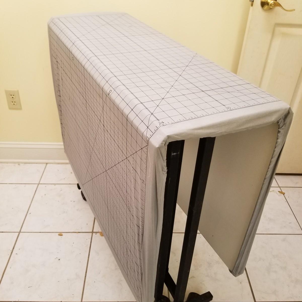 Rolling craft table, white formica style top and extendable gate legs, this table measures 36"x60"x35" when open and 36"x14"x35" folded down for storage. Has a Sullivan's grid/layout ironing cover on the the top, one corner is torn. See photos for details. Local pickup only.