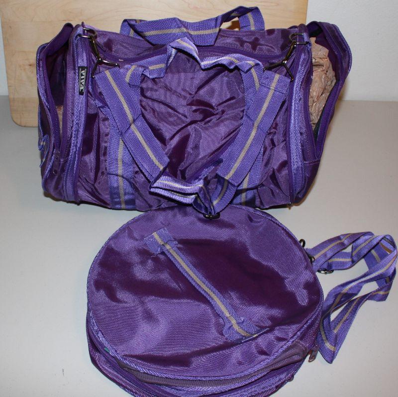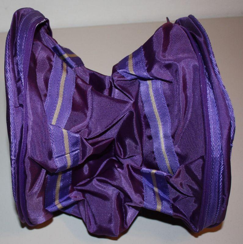 Two purple bags, each has a pocket on each end and a mail compartment