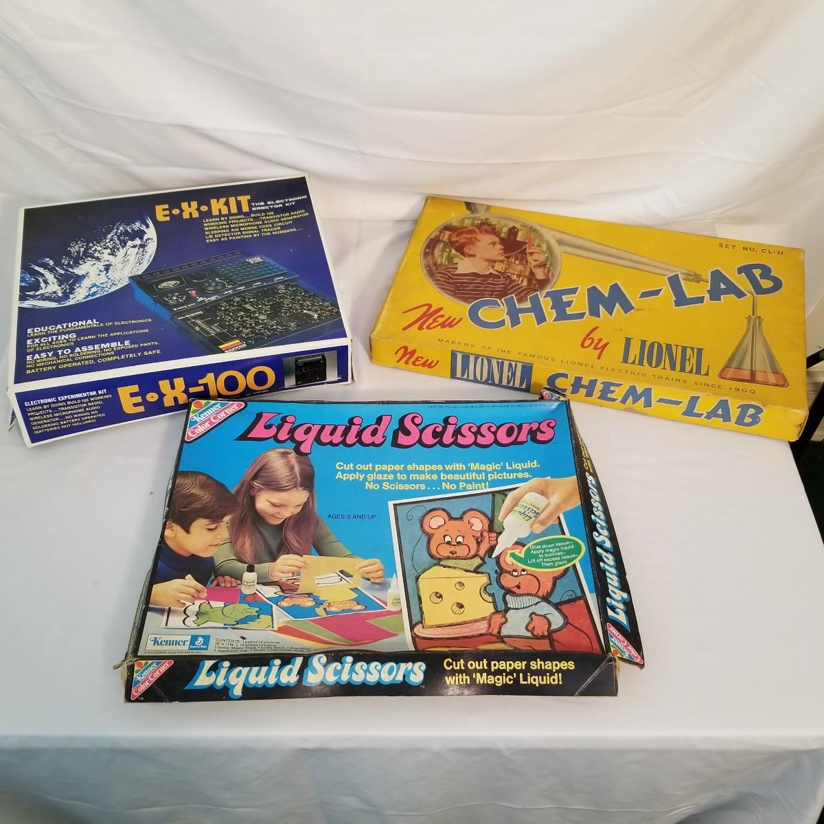 Three different areas of experiment to explore. Kenner Liquid Scissors lets you create pictures and ideas.  EX Kit explores the myriad connections in circuitry with easy plug and play options. The Lionel Chem Lab helps you to understand more about chemical composition and substance. Please note kits may or may not be complete. See photos for detail. Local pickup only.