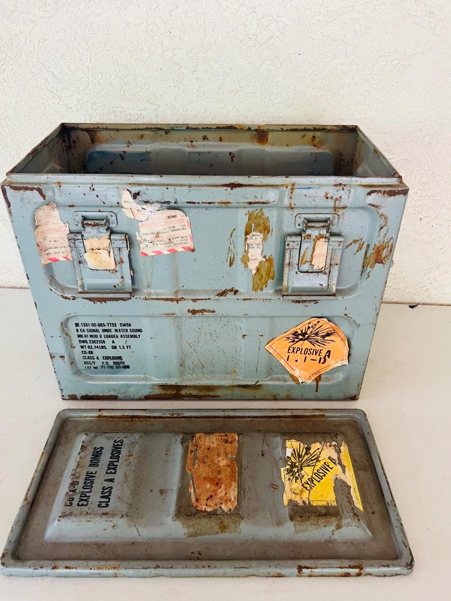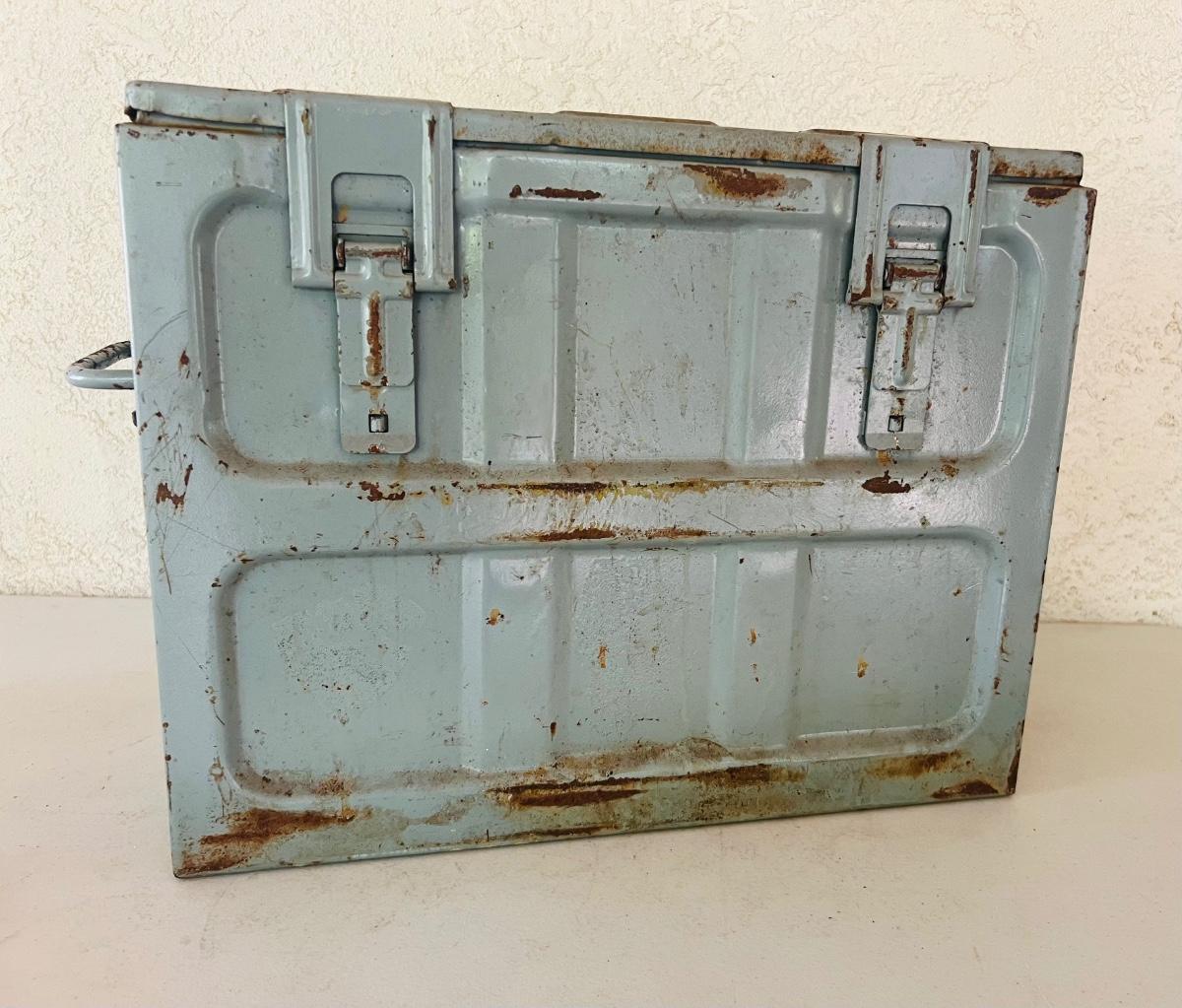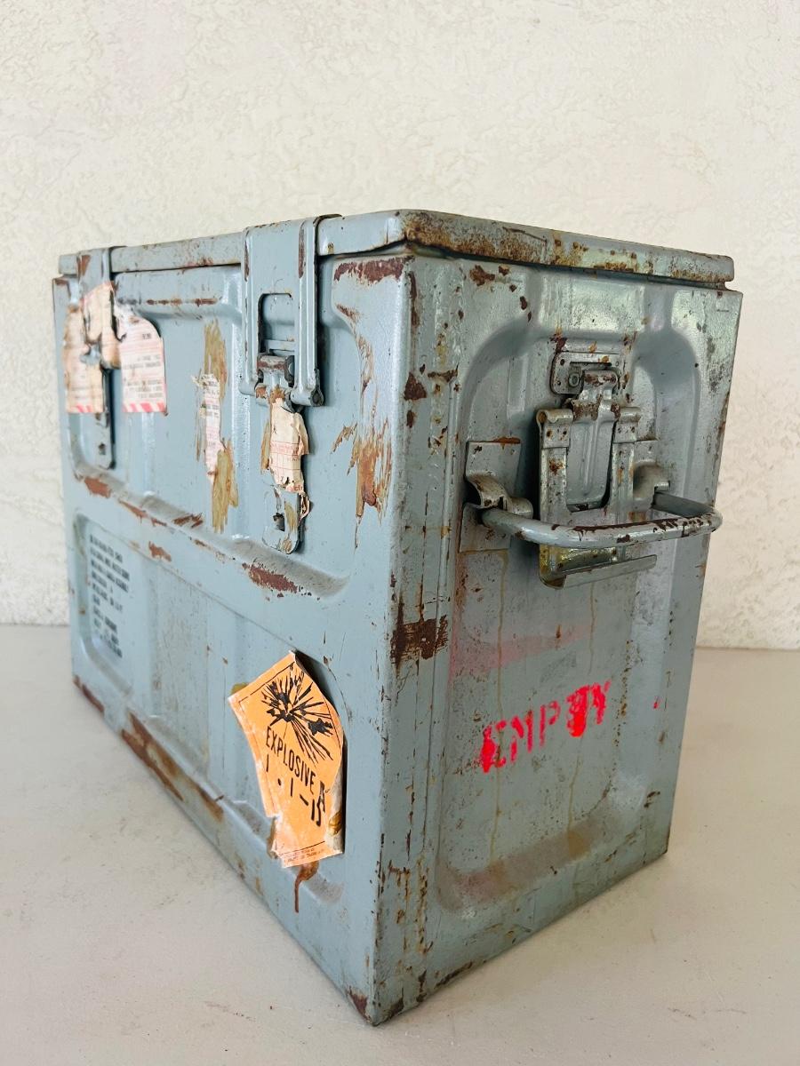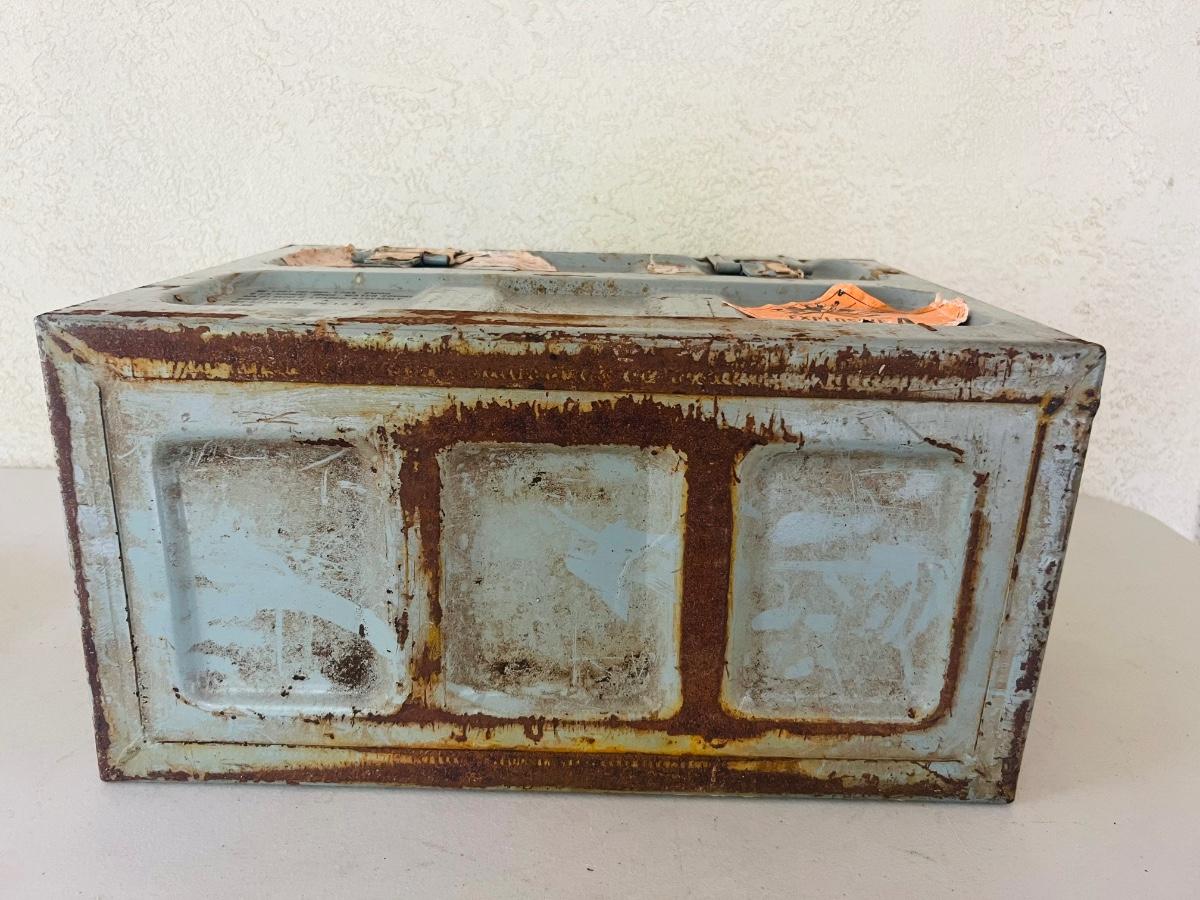 Previously used for Explosives Ammo Box. This metal box is empty. Measures 15 inches tall, 18 inches deep and 9 1/2 inches wide.