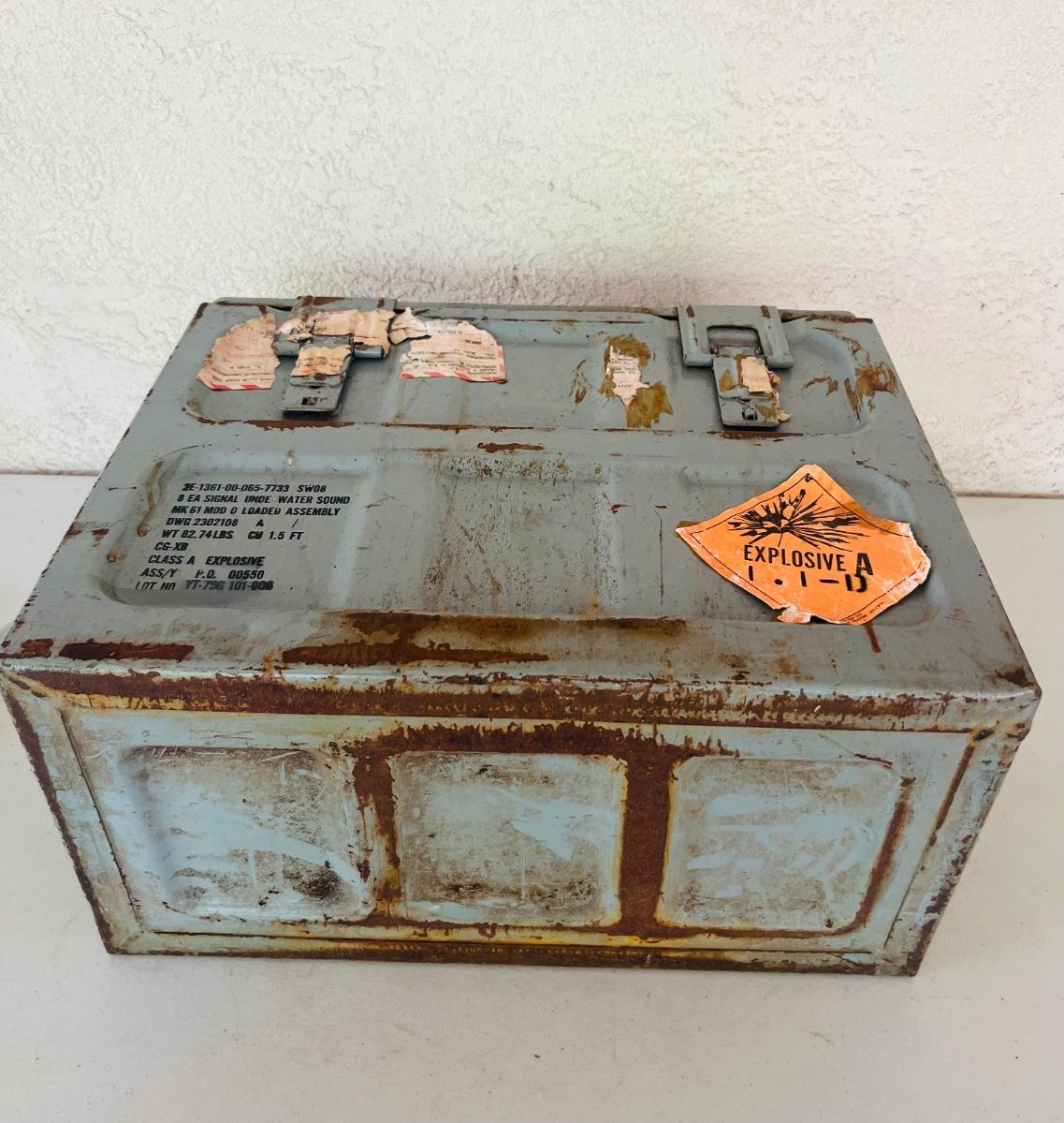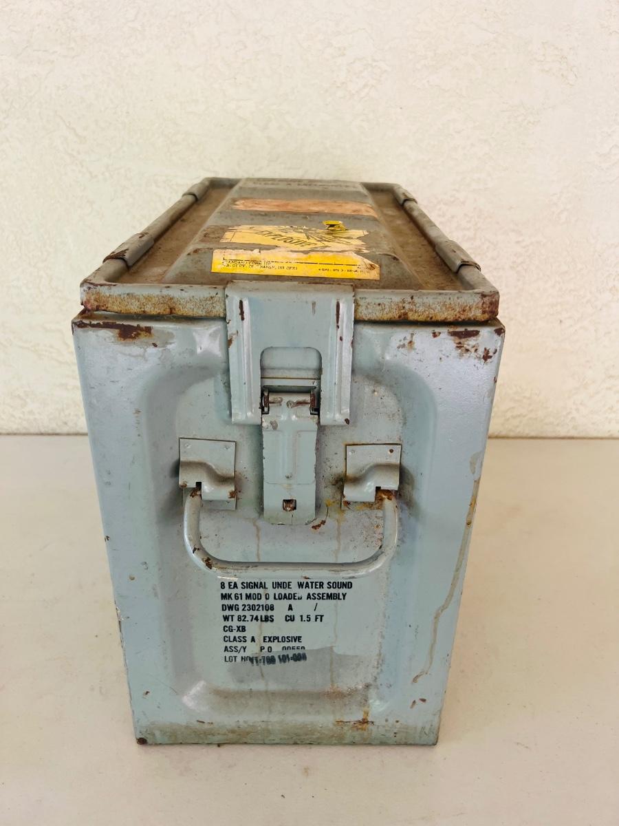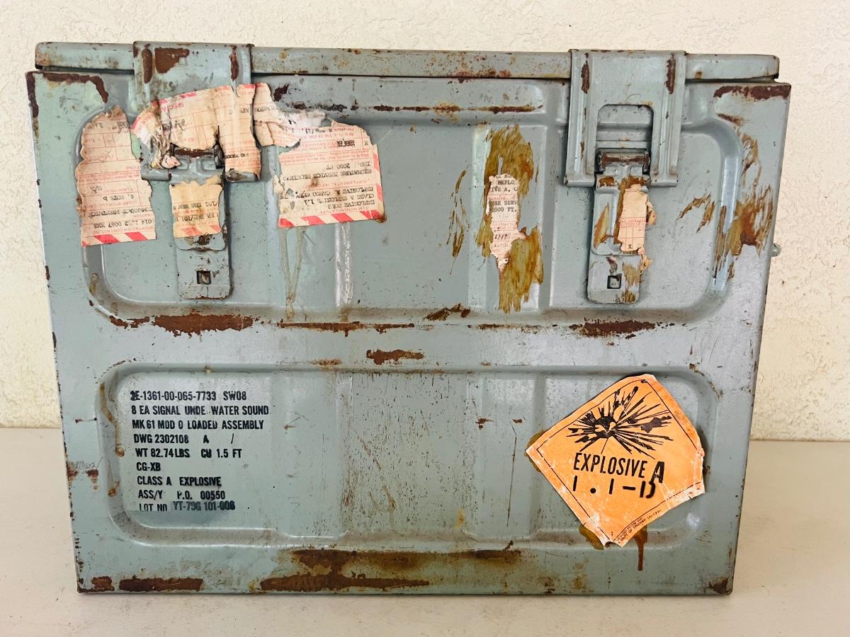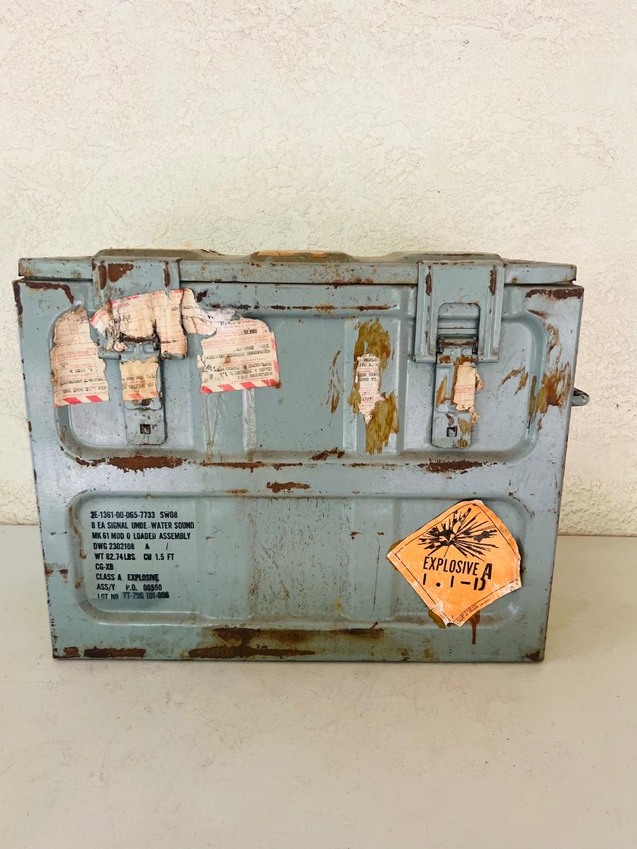 Previously used for Explosives Ammo Box. This metal box is empty. Measures 15 inches tall, 18 inches deep and 9 1/2 inches wide.