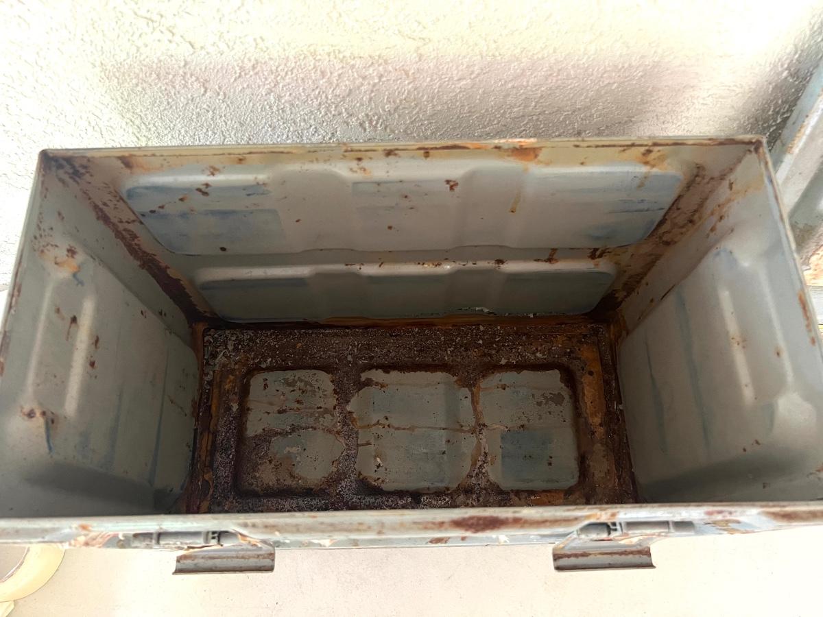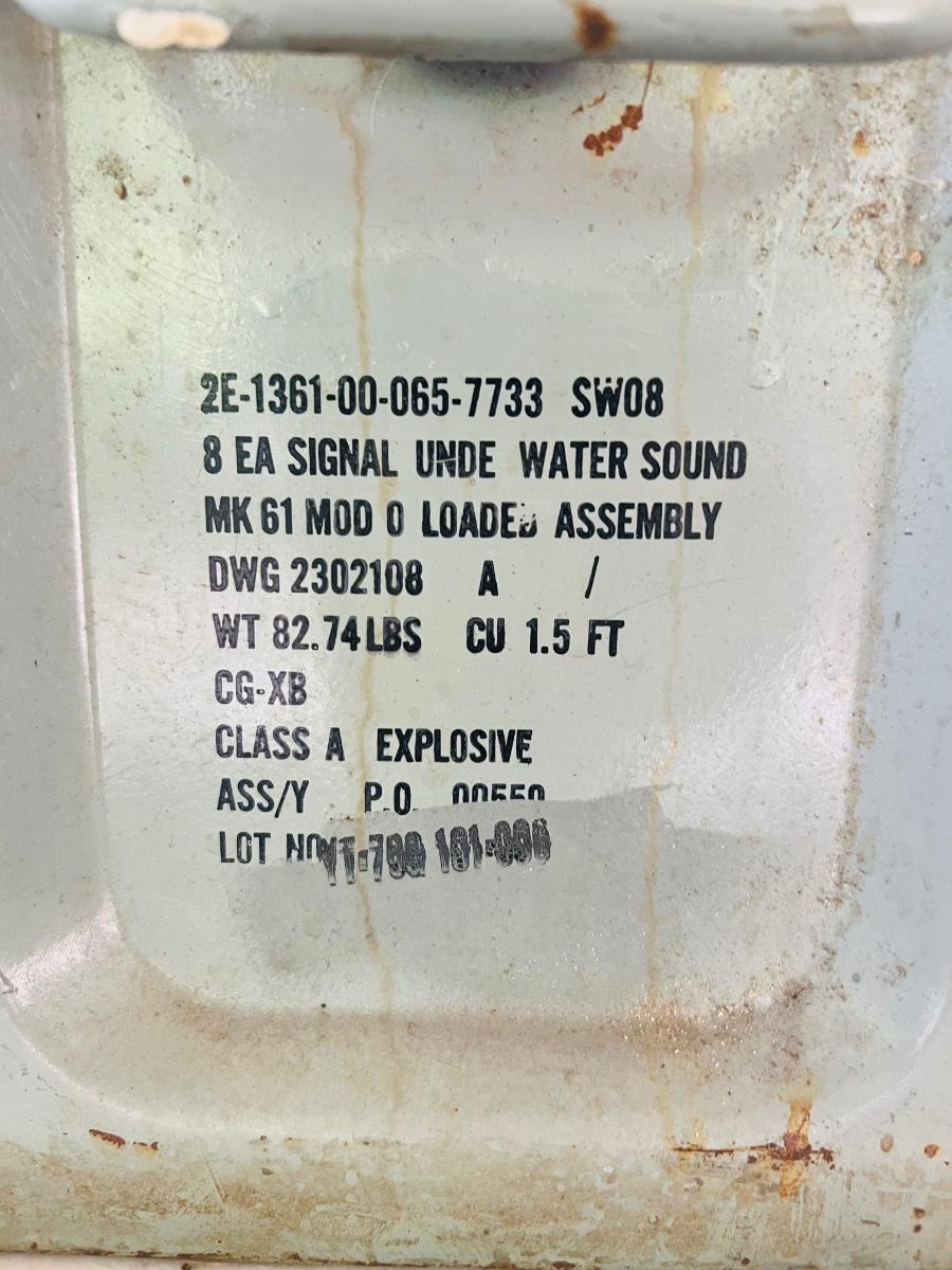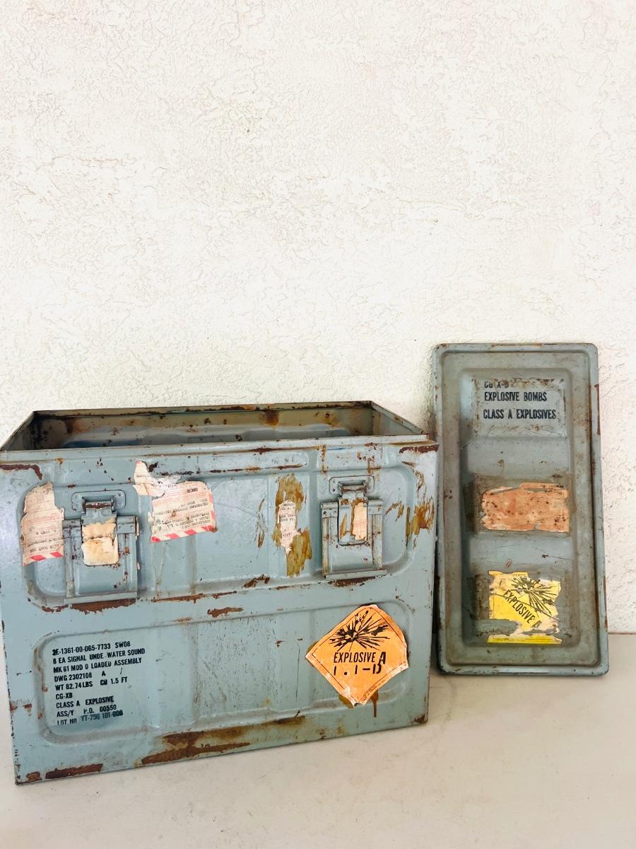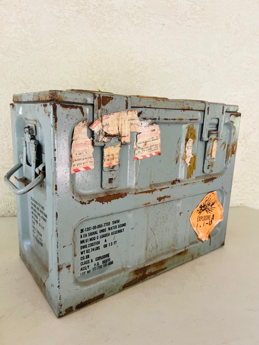 Previously used for Explosives Ammo Box. This metal box is empty. Measures 15 inches tall, 18 inches deep and 9 1/2 inches wide.