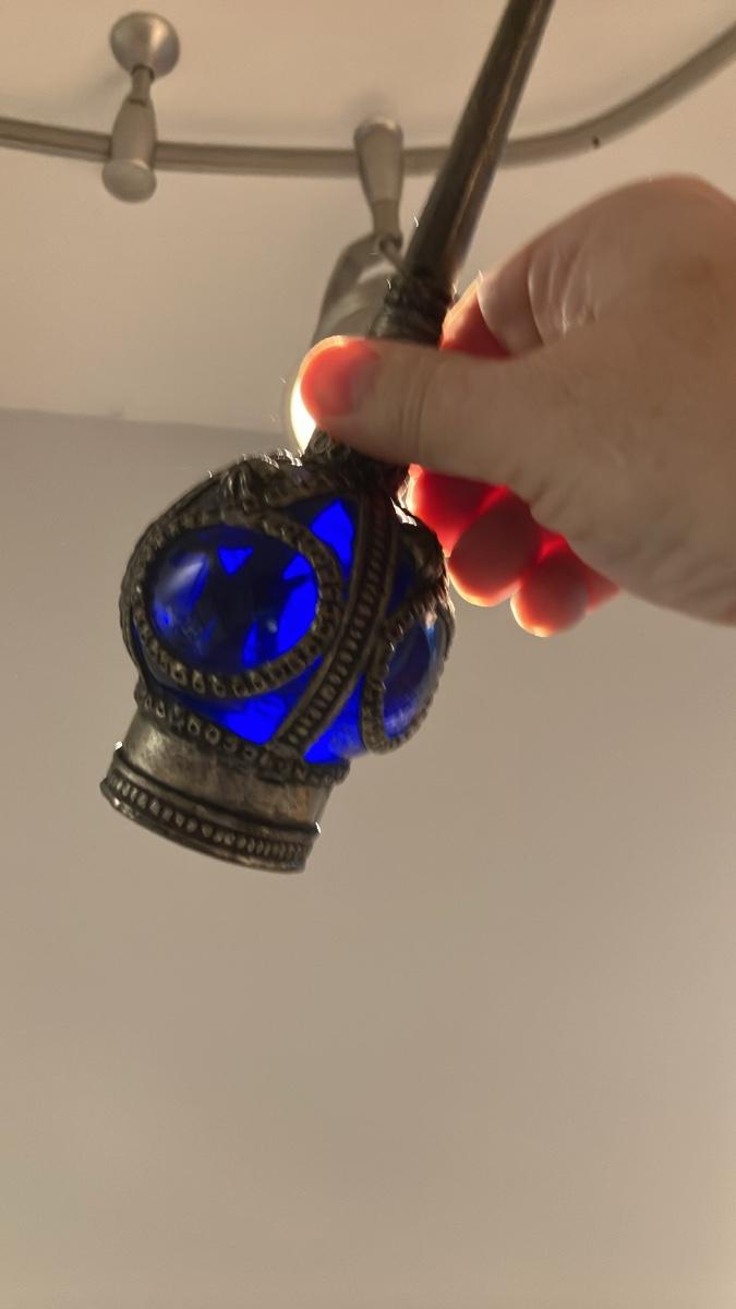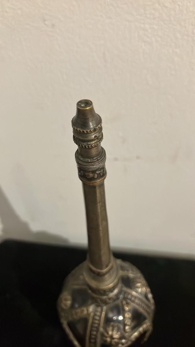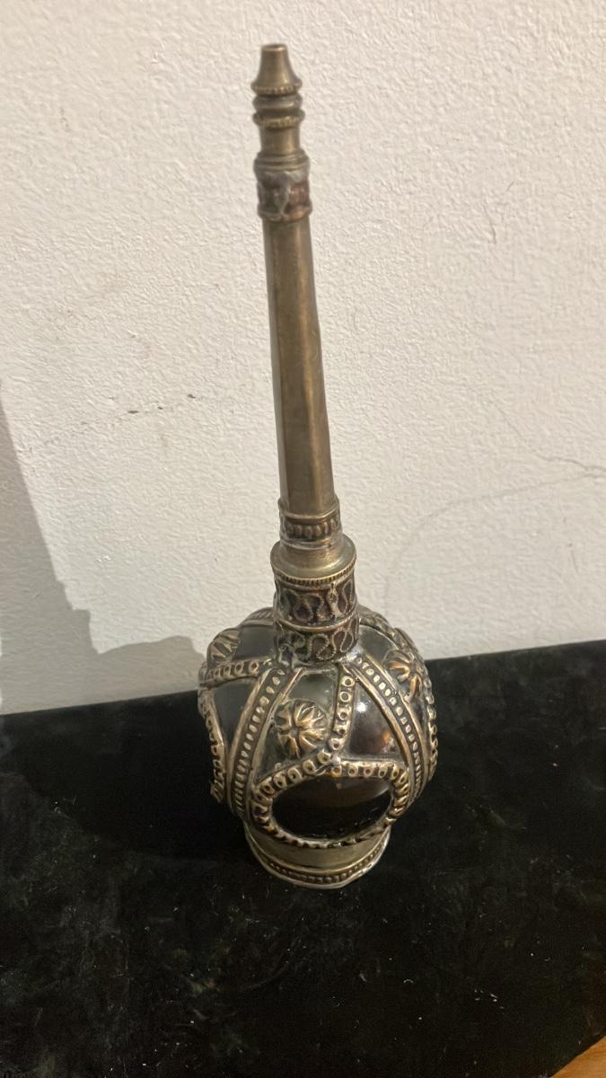 Exquisite Antique Victorian Cobalt Blue Glass Perfume Bottle with Ornate Brass Crown Cap – 8.5" Tall Vanity Treasure