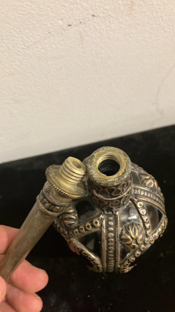 Crowning this beauty is a highly detailed screw-on brass (or silver-alloy plated) cap, intricately embossed with a regal crown motif, swirling filigree vines, and floral accents that evoke the romantic flourish of the era. The cap unscrews smoothly for easy refilling, revealing the original interior design ready for your favorite modern fragrance or as a decorative empty. No chips, cracks, or losses; the brass bears a soft, authentic patina that speaks to its age without detracting from its charm.
