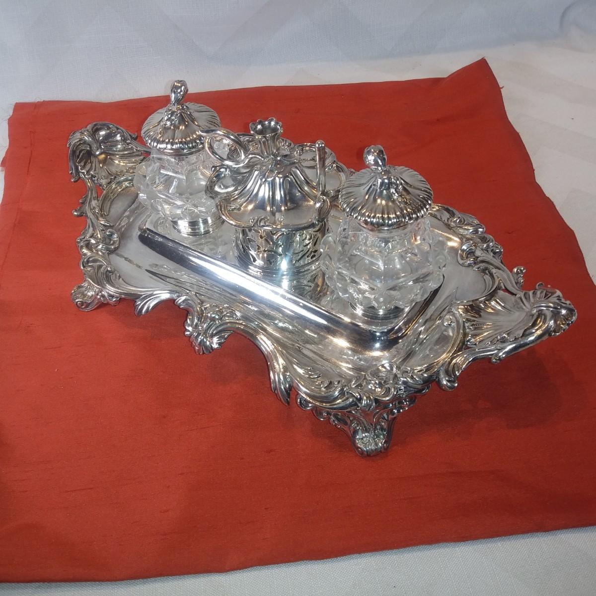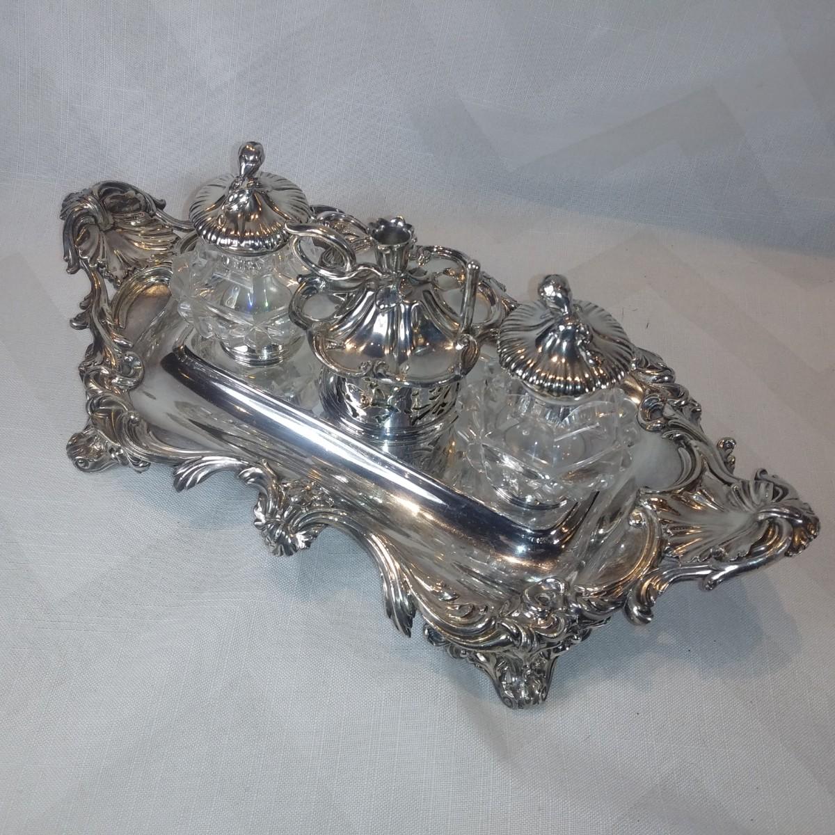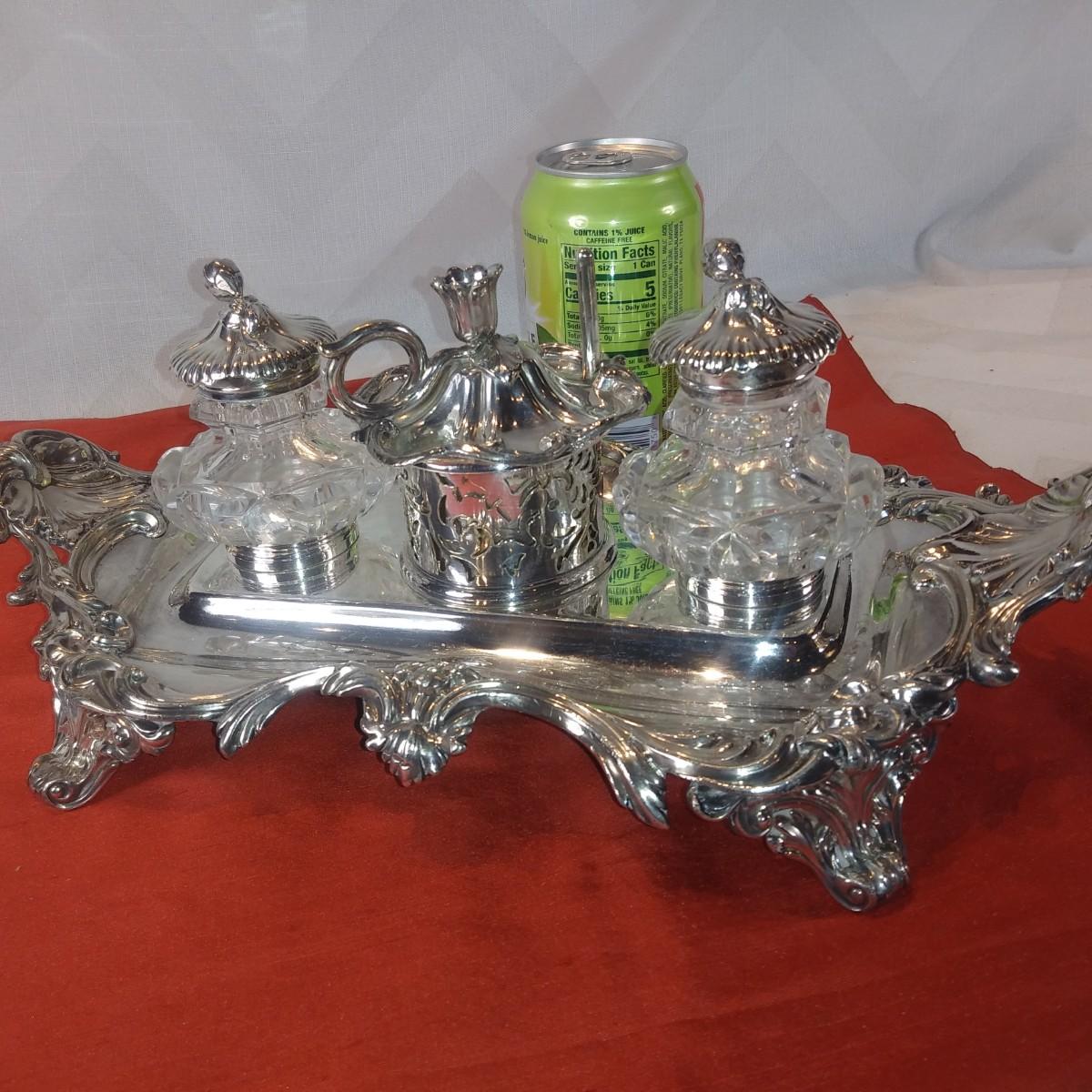 This auction lot is for a Exquisite Inkwell Desk Set. Truly a beautiful piece! It is silverplate with no maker marks. The glass has ground glass bottoms and a few very teeny chiggers on bottom and one at lid - we could hardly find the one at the top. It measures about 14-inches long x 5-inches tall.