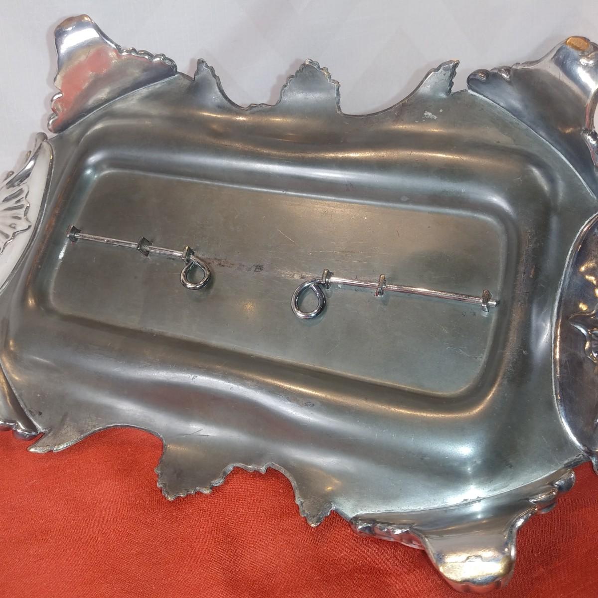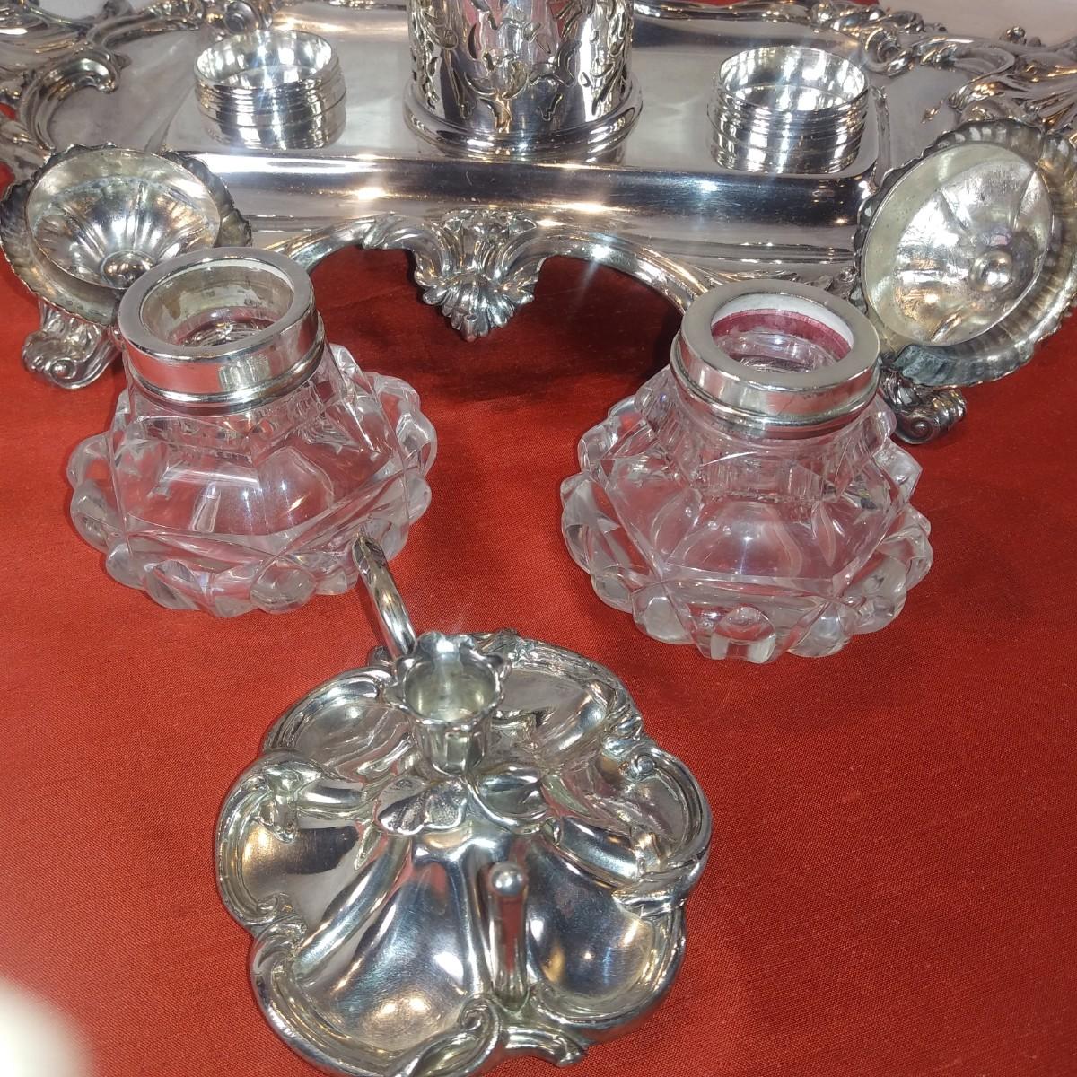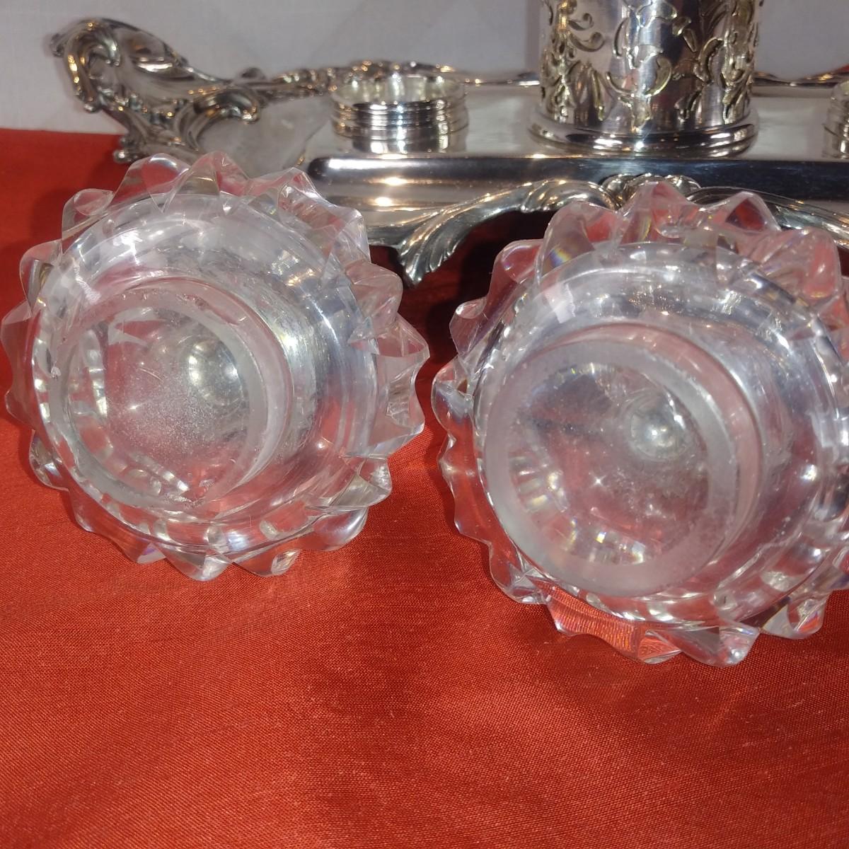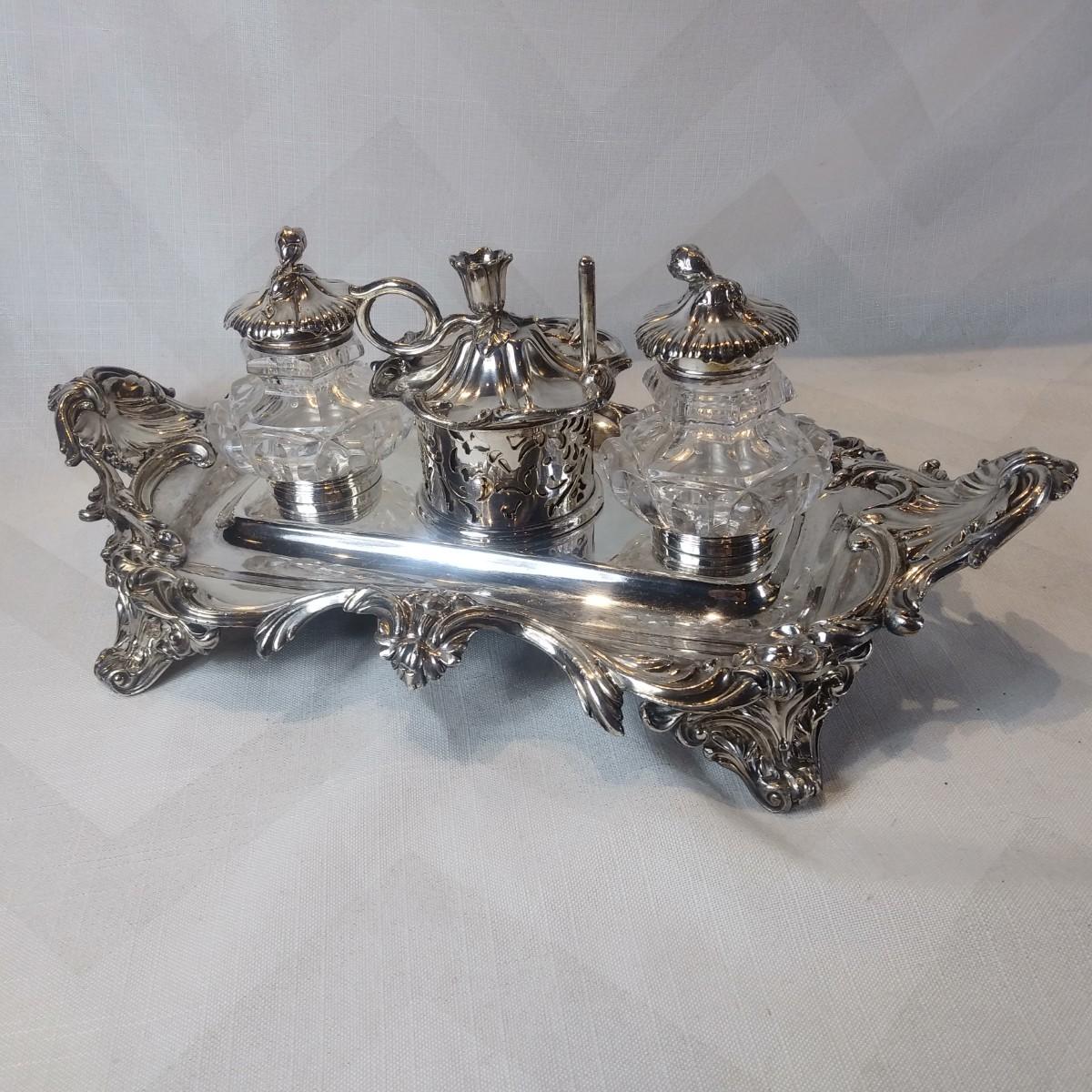 This auction lot is for a Exquisite Inkwell Desk Set. Truly a beautiful piece! It is silverplate with no maker marks. The glass has ground glass bottoms and a few very teeny chiggers on bottom and one at lid - we could hardly find the one at the top. It measures about 14-inches long x 5-inches tall.