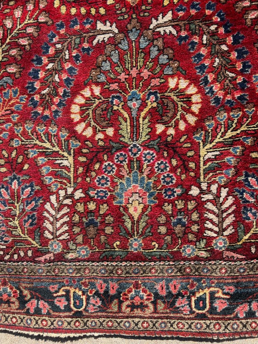 DESCRIPTION: This exquisite area rug has been tightly woven with intricate patterns of jewel and foliate, fern-like patterns surrounding an elaborate central gul on a dark red field. The wide framing borders repeat a dynamic border design that sets this rug apart.