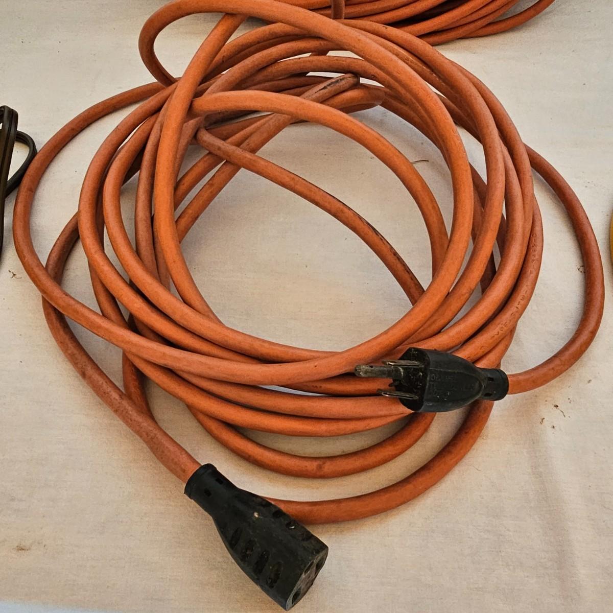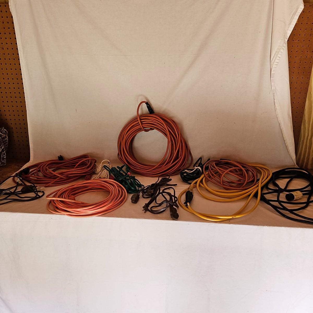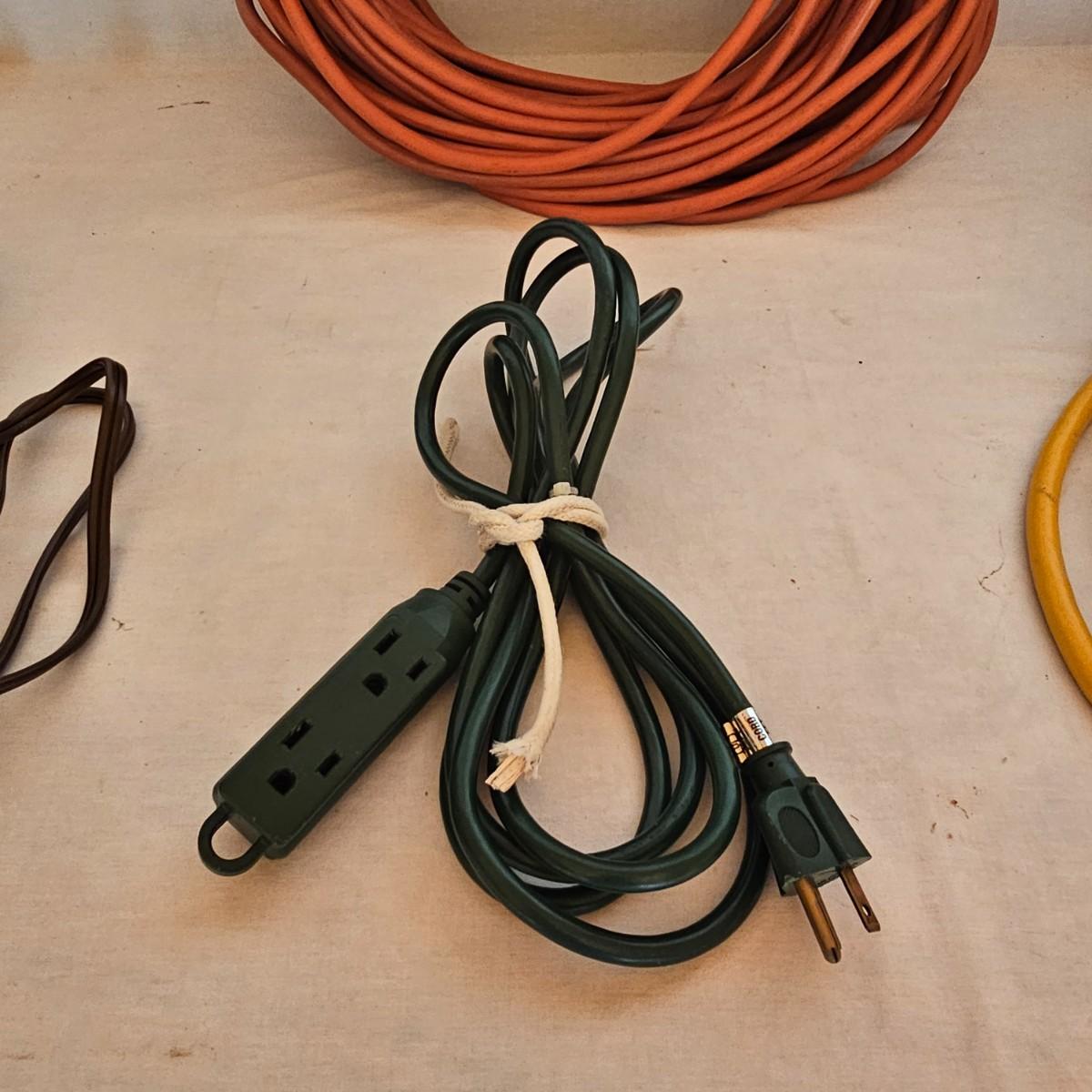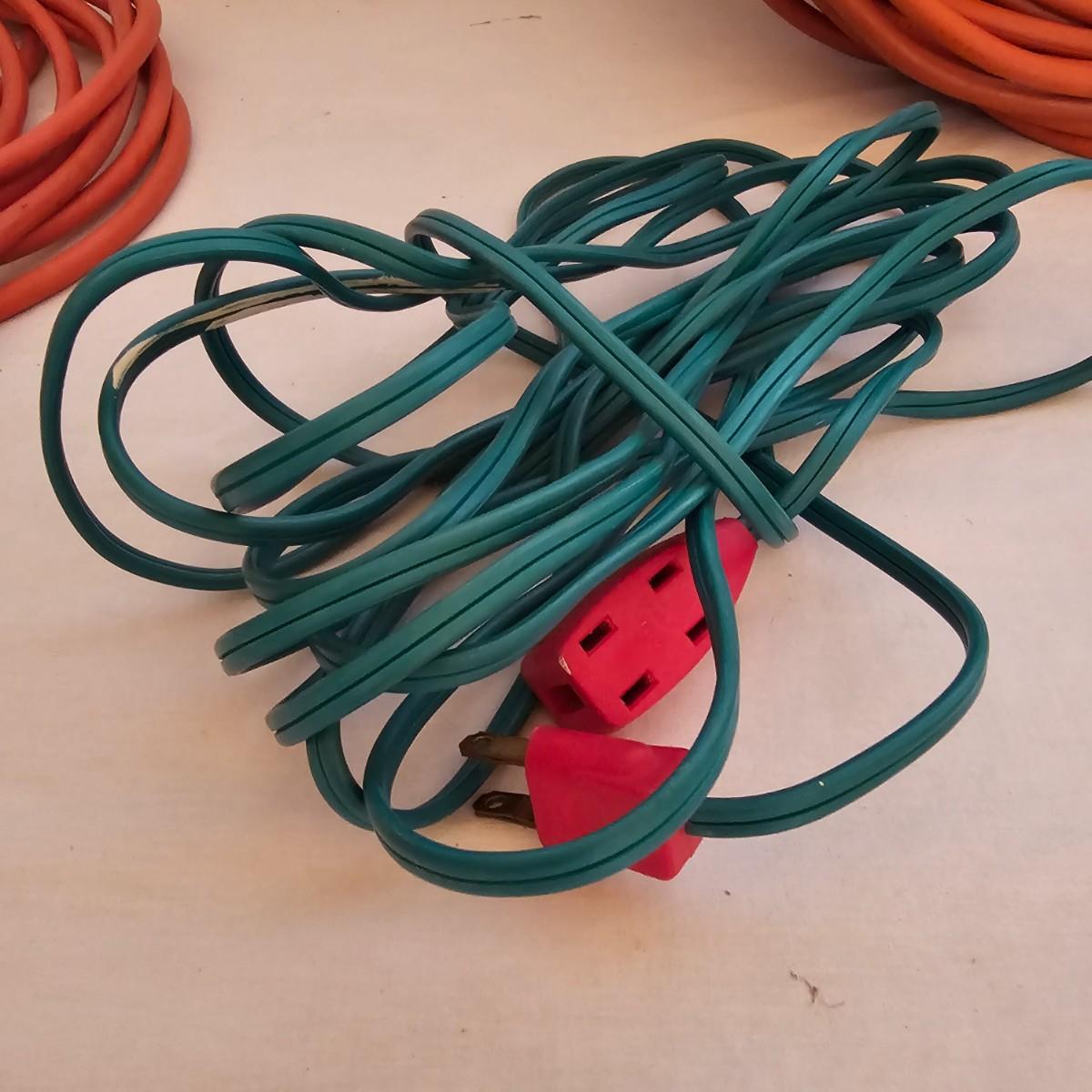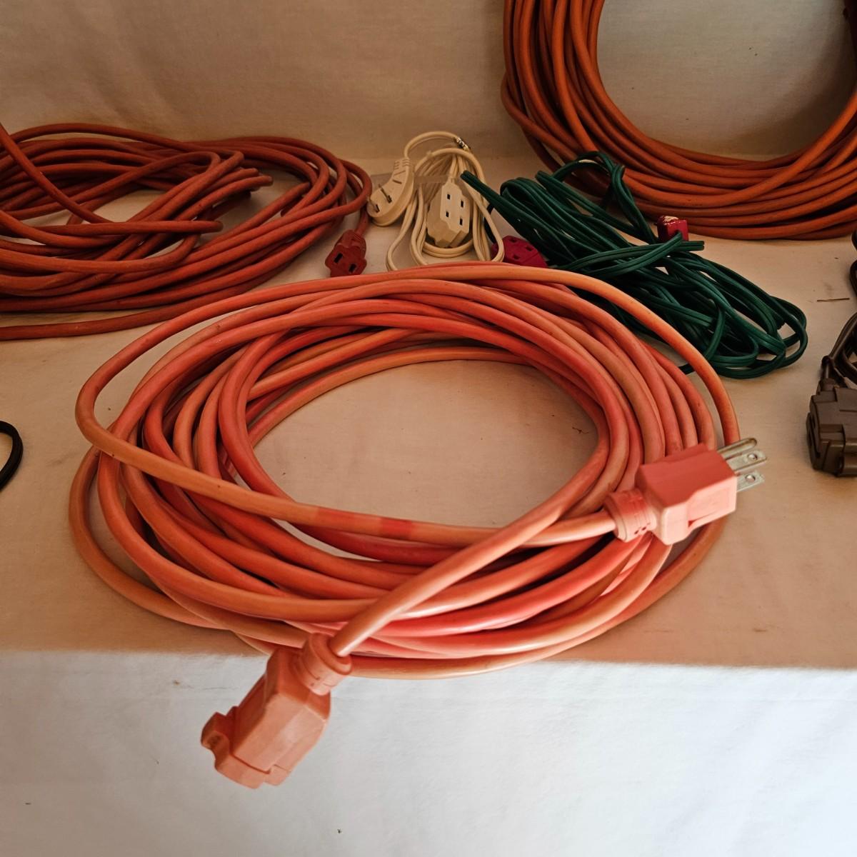 Several different types of extension cords. Six standard style short cords, five to six feet each. Some 15', 25', 40'. A 100' cord plus more. 13 items total, see photos for details. Please note one cord has end taped, may need to be fixed. Cords have not been tested. Local pickup only.