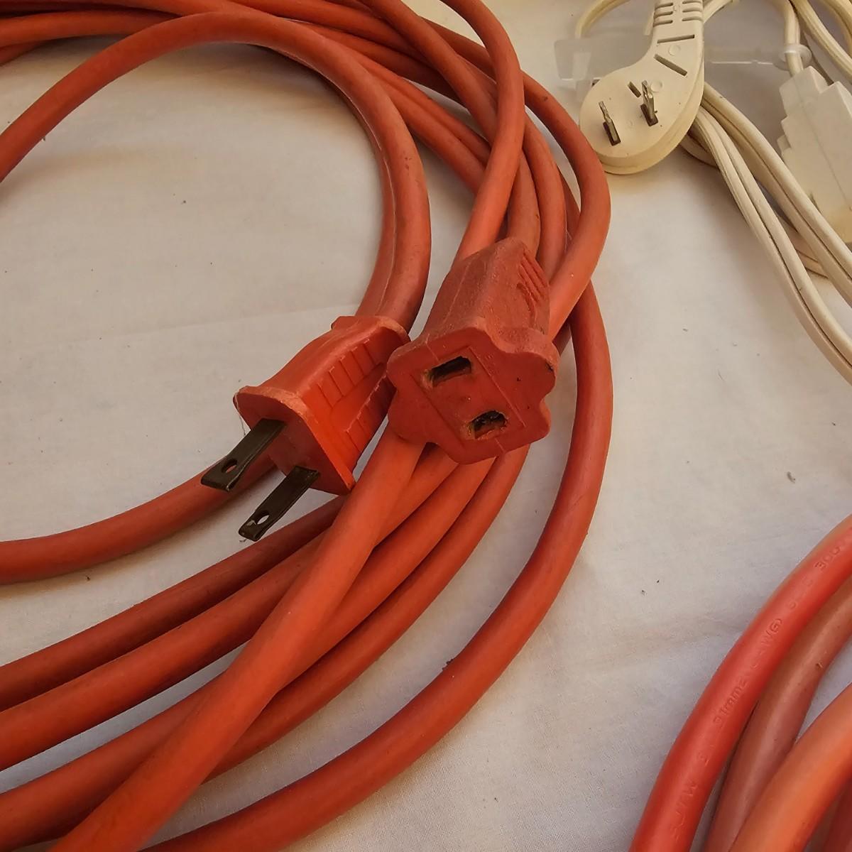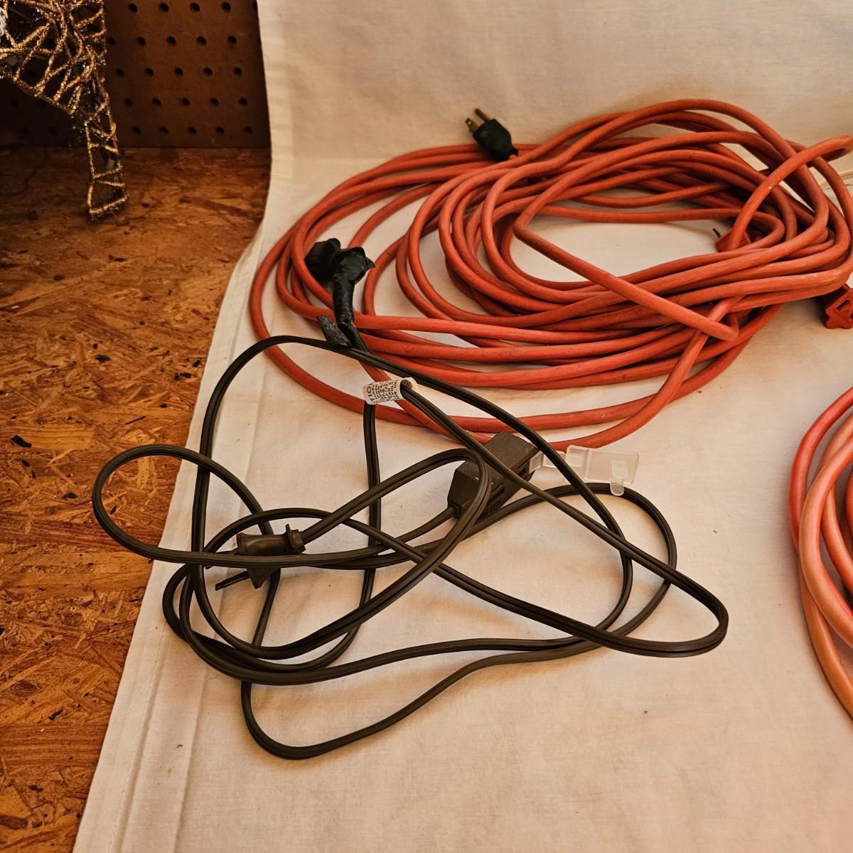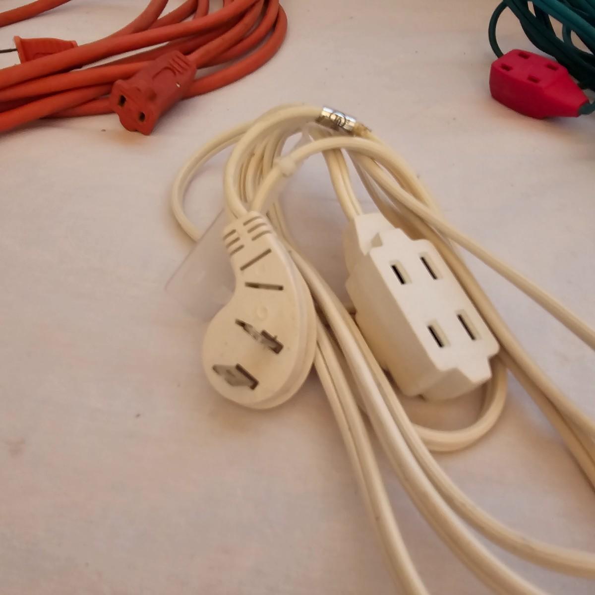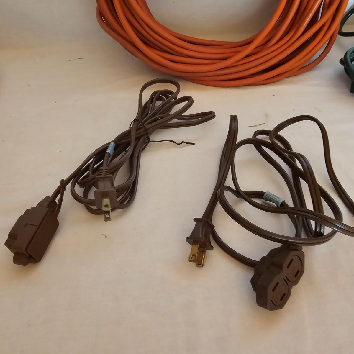 Several different types of extension cords. Six standard style short cords, five to six feet each. Some 15', 25', 40'. A 100' cord plus more. 13 items total, see photos for details. Please note one cord has end taped, may need to be fixed. Cords have not been tested. Local pickup only.