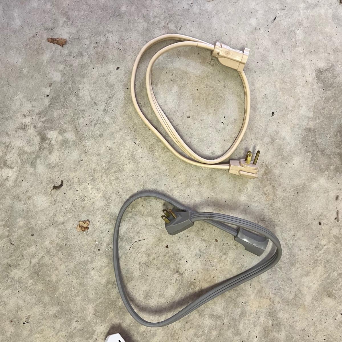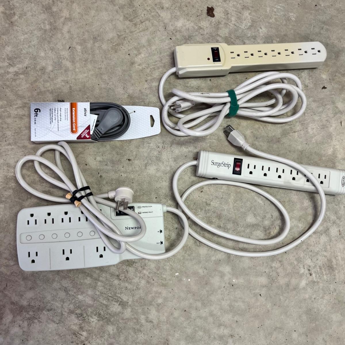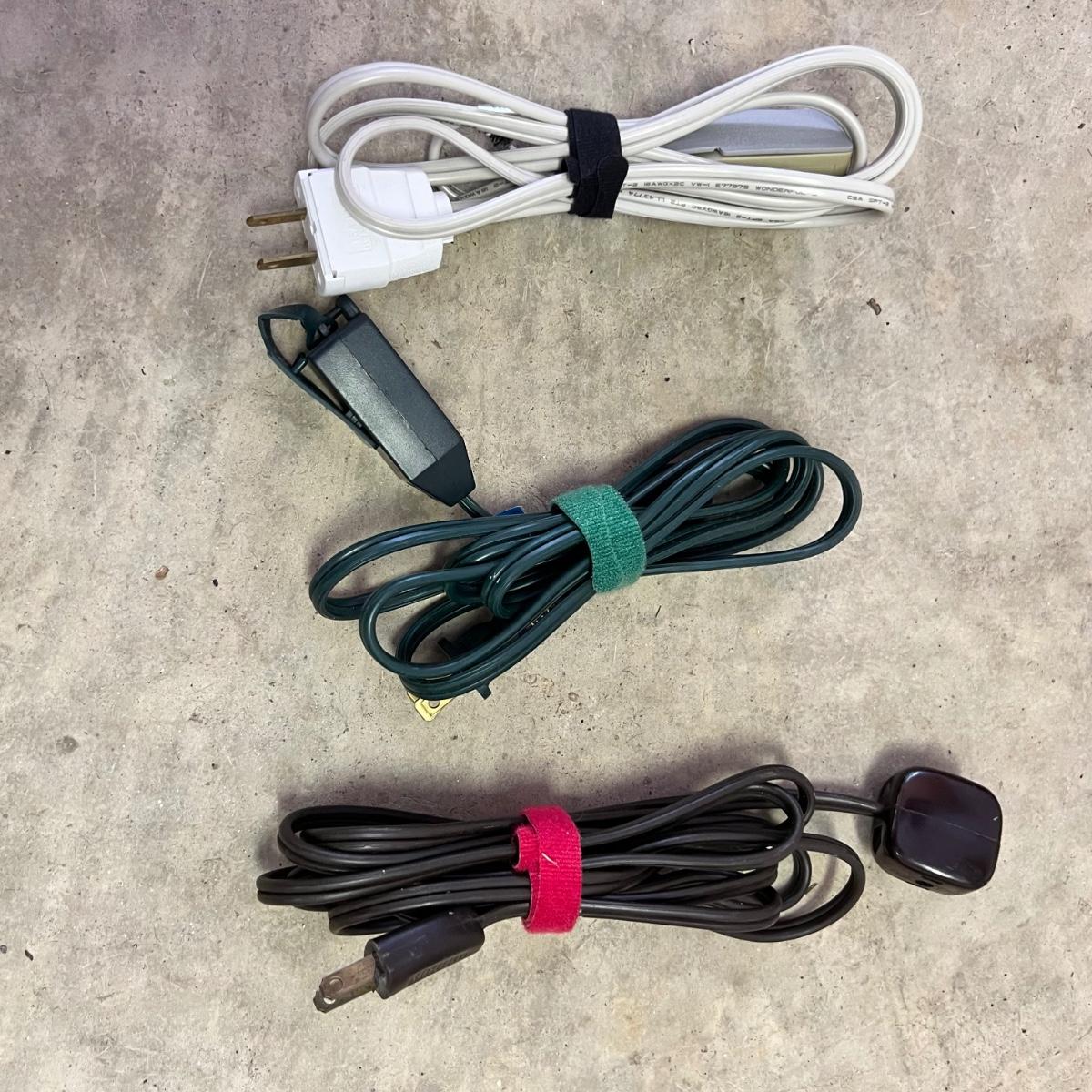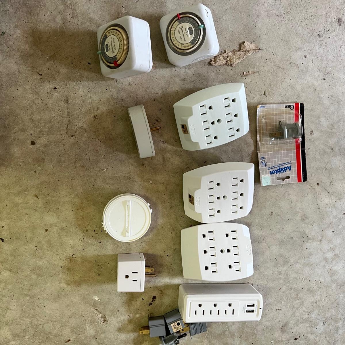 Five outdoor extension cords and 11 indoor cords. Five power strips/surge protectors and five 3 prong to 2 prong adapters and eight outlet expanders