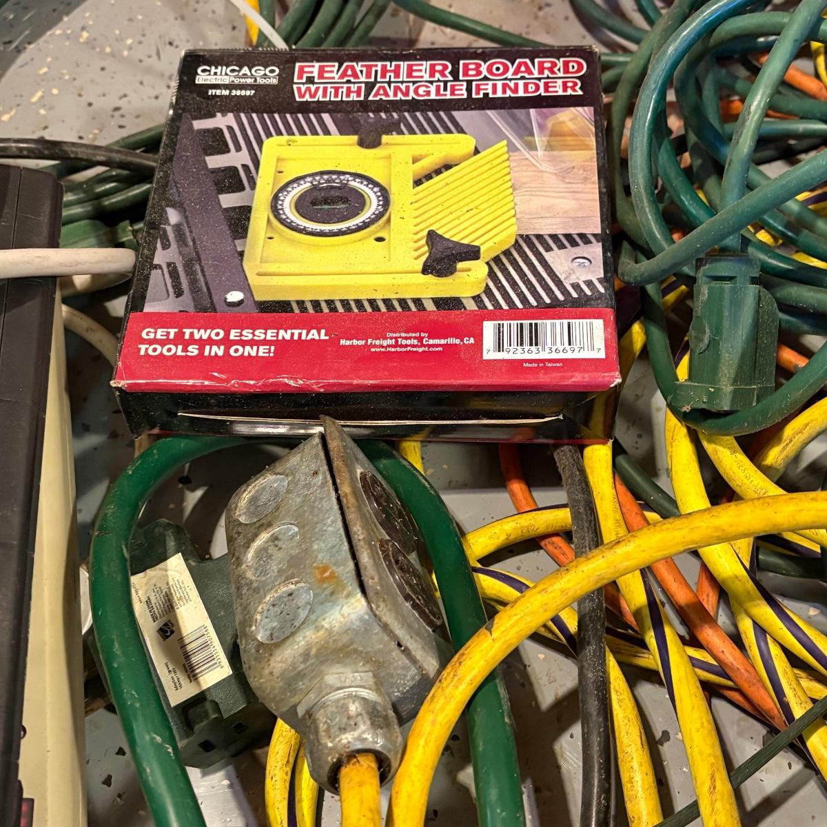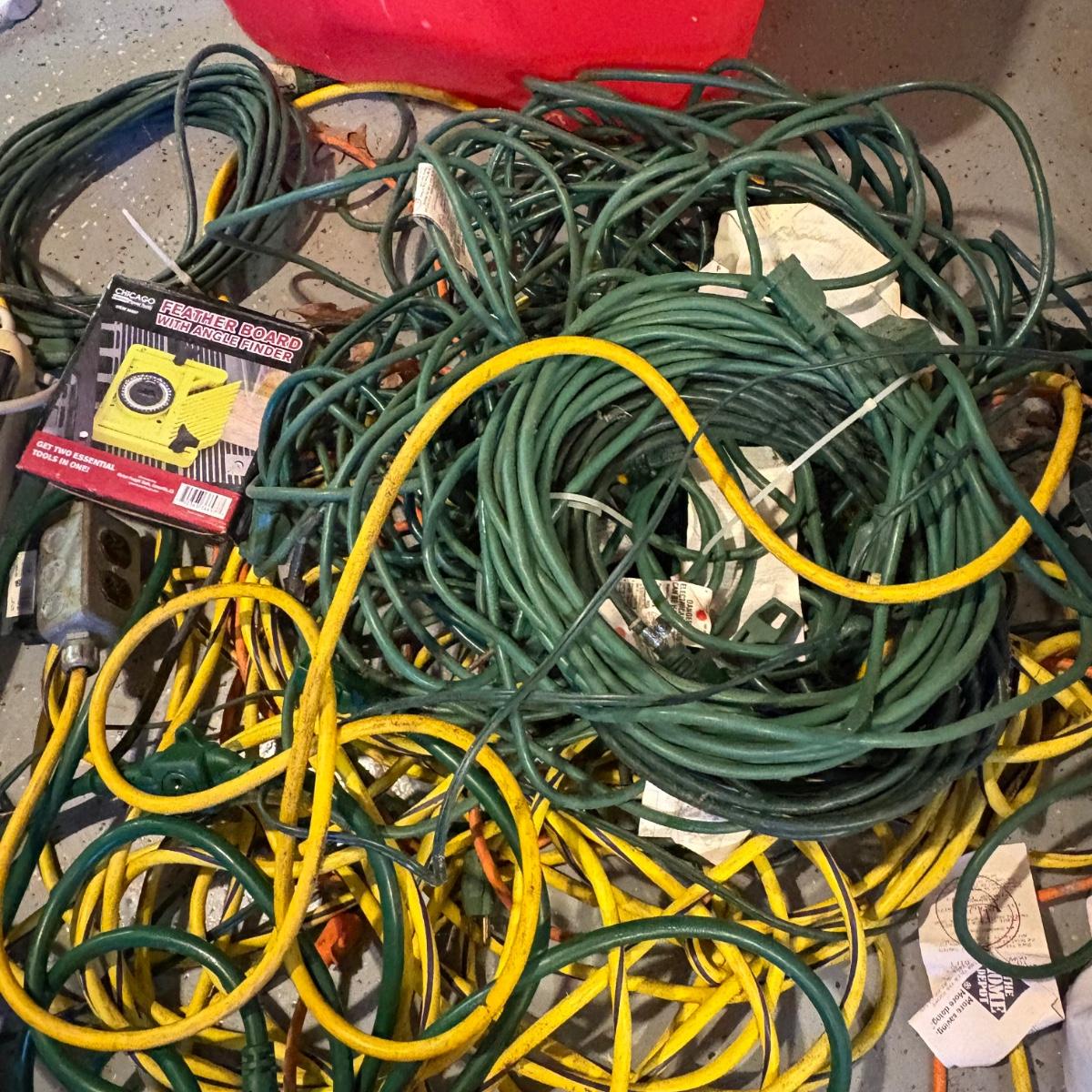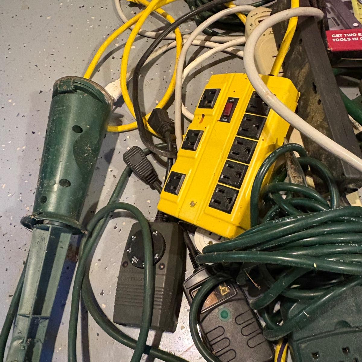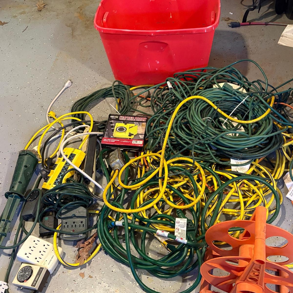 Mixed size and length extension cords, power strips, timers, and more. Cord storage reel and plastic tub included.
