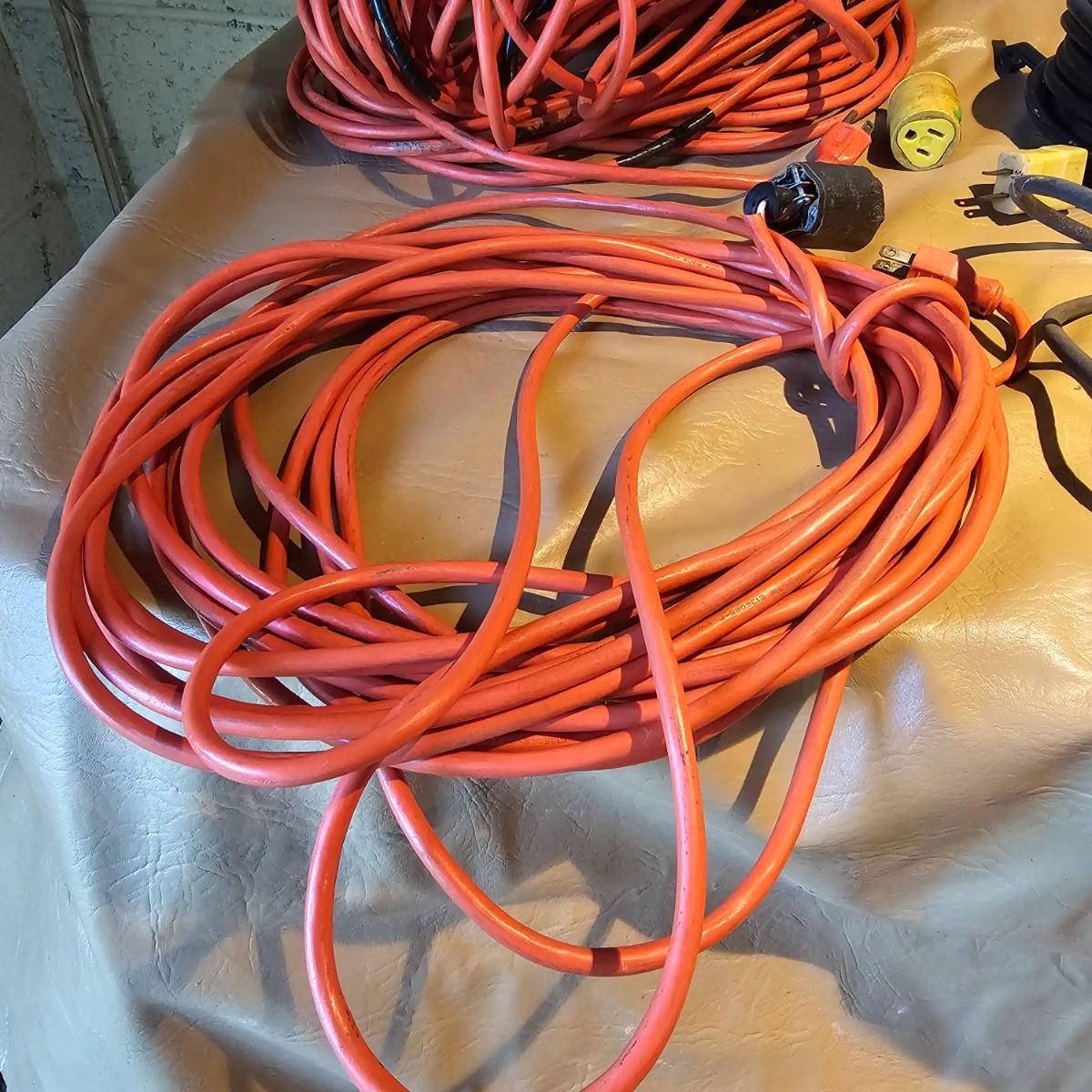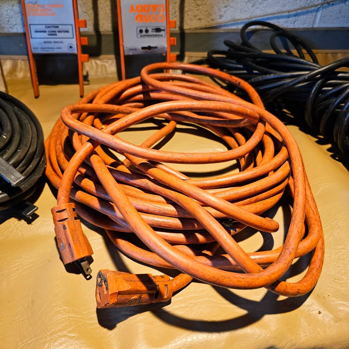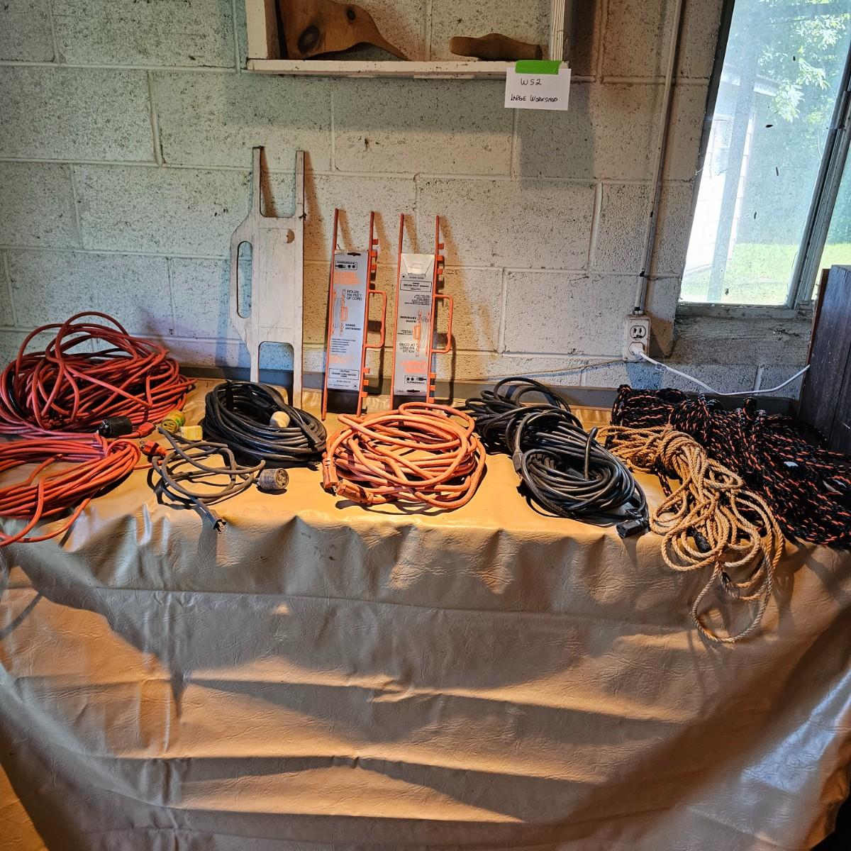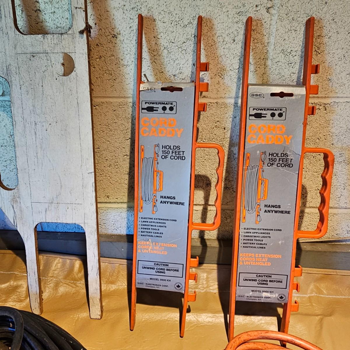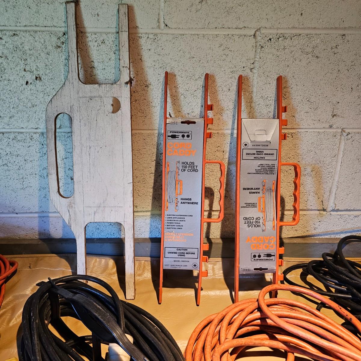 Five large extension cords, one short and two lengths of rope. Two extension cords are 100 feet, others are probably 50 feet, short one is six feet. One length of 1/4" sisal rope and also a bundle of 1/2" polypropylene rope. Lengths on rope not known. Also includes four cord caddies, one handmade. See photos for details. Shipping available.