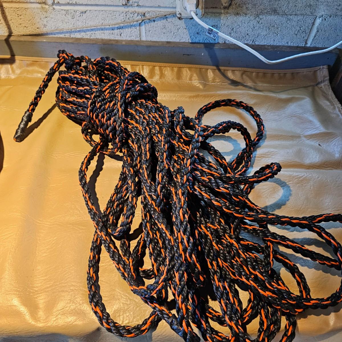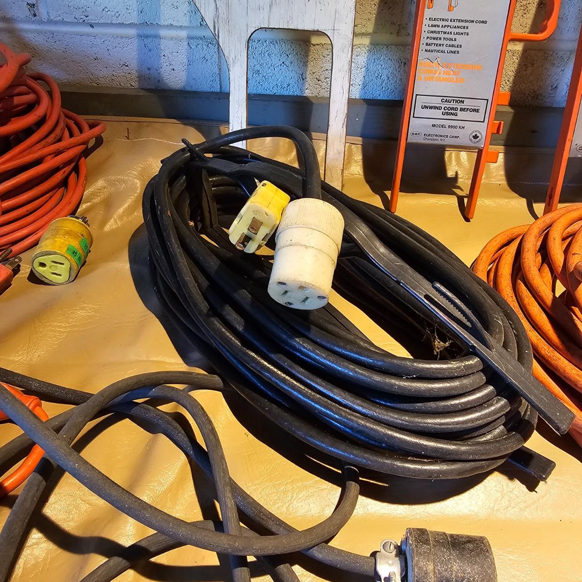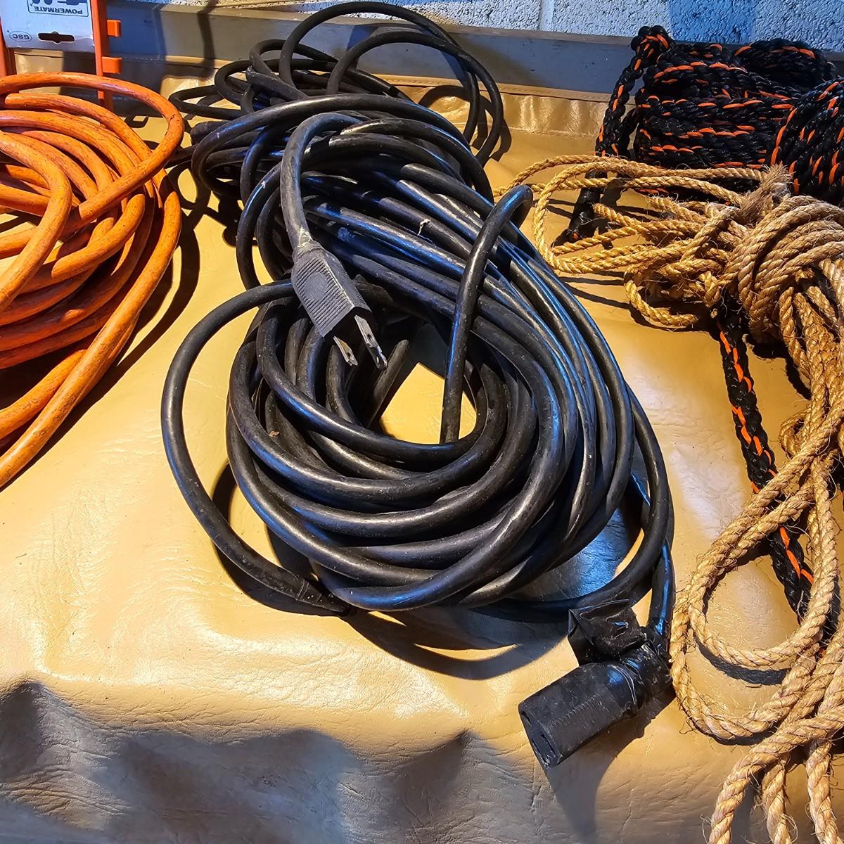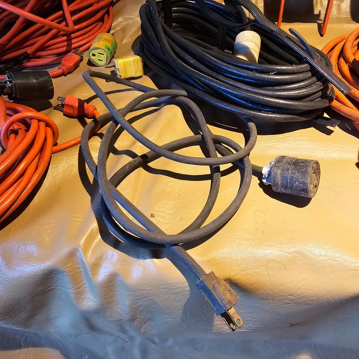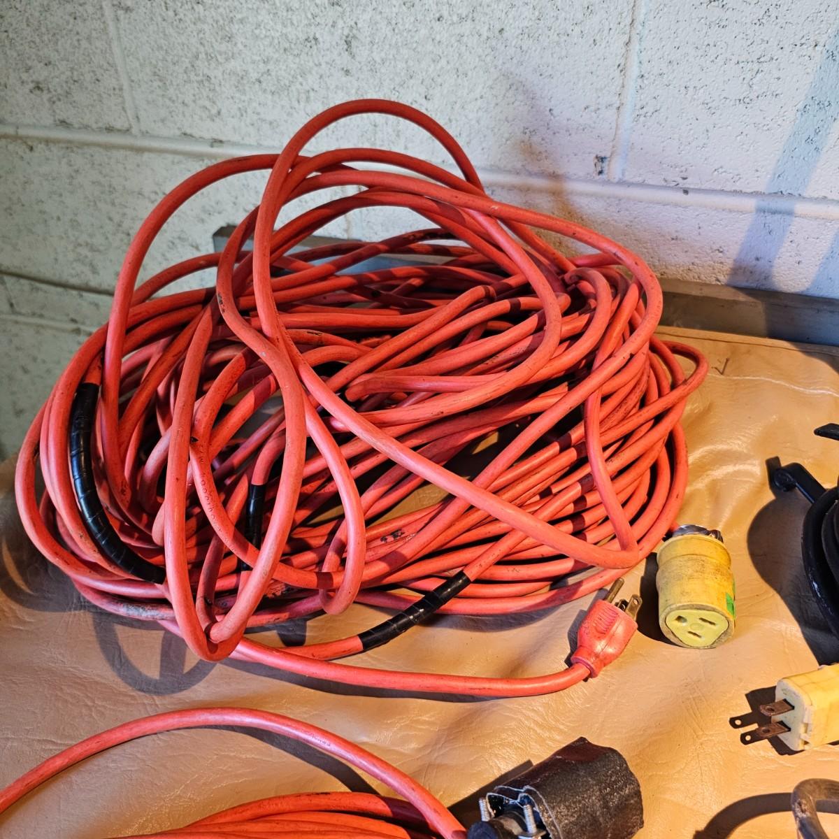 Five large extension cords, one short and two lengths of rope. Two extension cords are 100 feet, others are probably 50 feet, short one is six feet. One length of 1/4" sisal rope and also a bundle of 1/2" polypropylene rope. Lengths on rope not known. Also includes four cord caddies, one handmade. See photos for details. Shipping available.