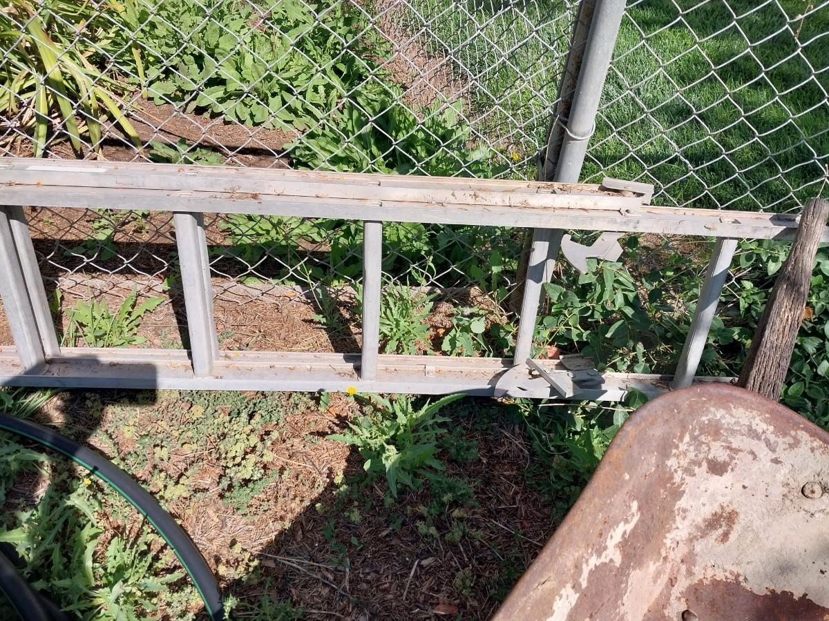 EXTENSION LADDER, TRAILER, TUBING AND OLD WHEELBARROW
