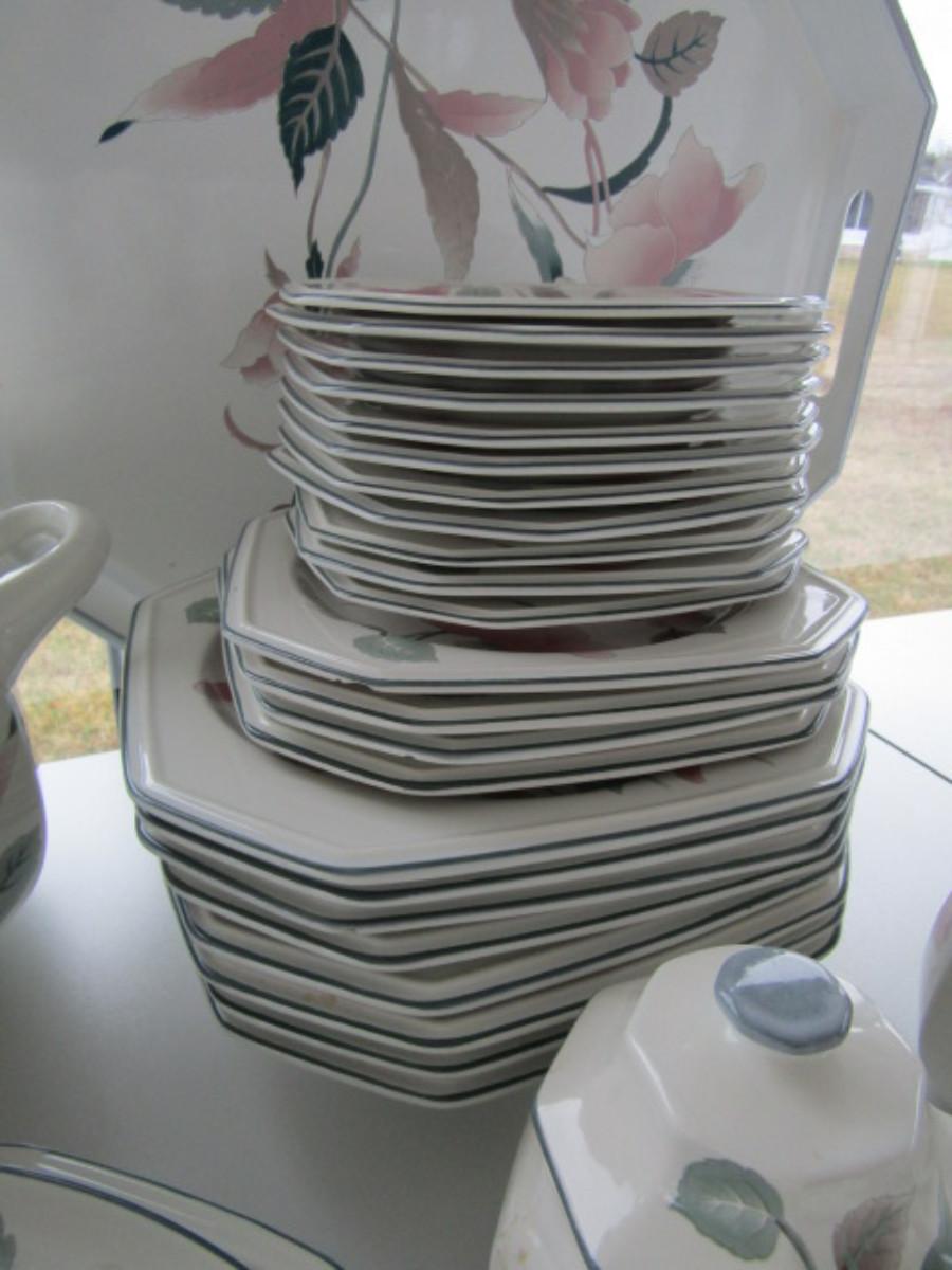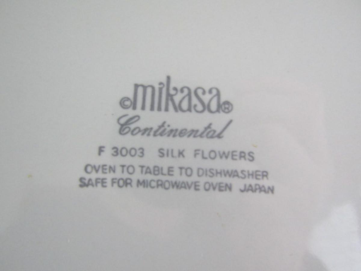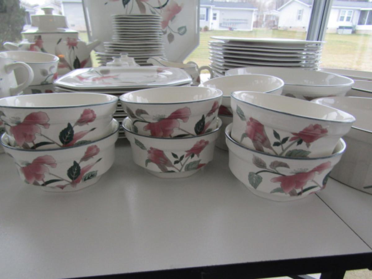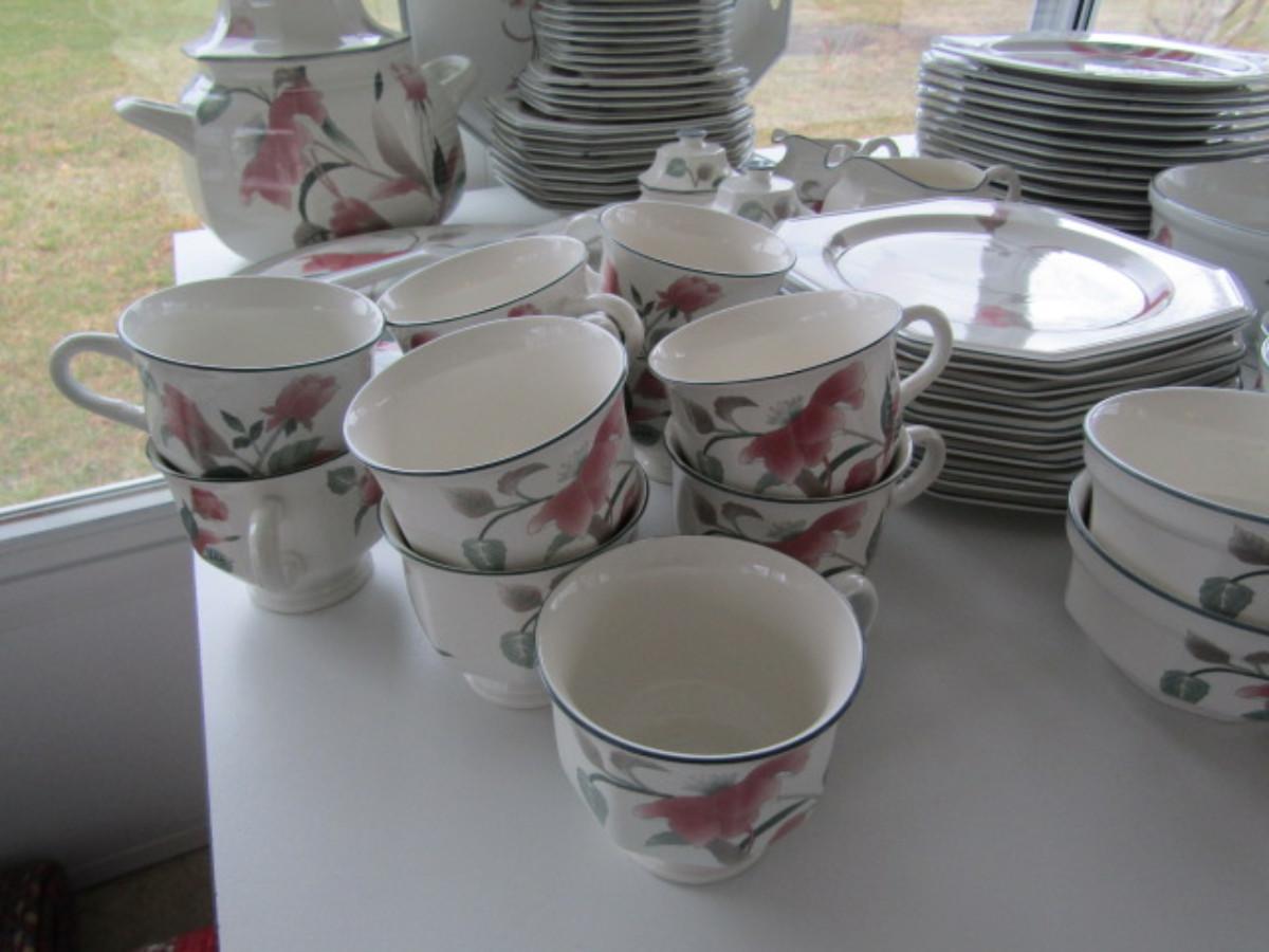 Extensive Collection of Noritake Continental 'Silk Flowers' Pattern China-Dinner Plates-14, Salad Plates-11, Soup Bowls-7, Bread Plates-4, Cups & Saucers- 11 each, Small Cereal Bowls- 8, Oval Baker- 1, Round Baker- 1, Vegetable Bowl- 1, Covered Sugar Bowl- 2, Creamer- 1, Gravy- 1, Taureen with Lid- 1, Serving Tray- 1 , Hexagon Platter- 1, Round Plate- 1, Cake Plate- 1, Server- 1. Expect some chips/cracking. Please see all pictures.