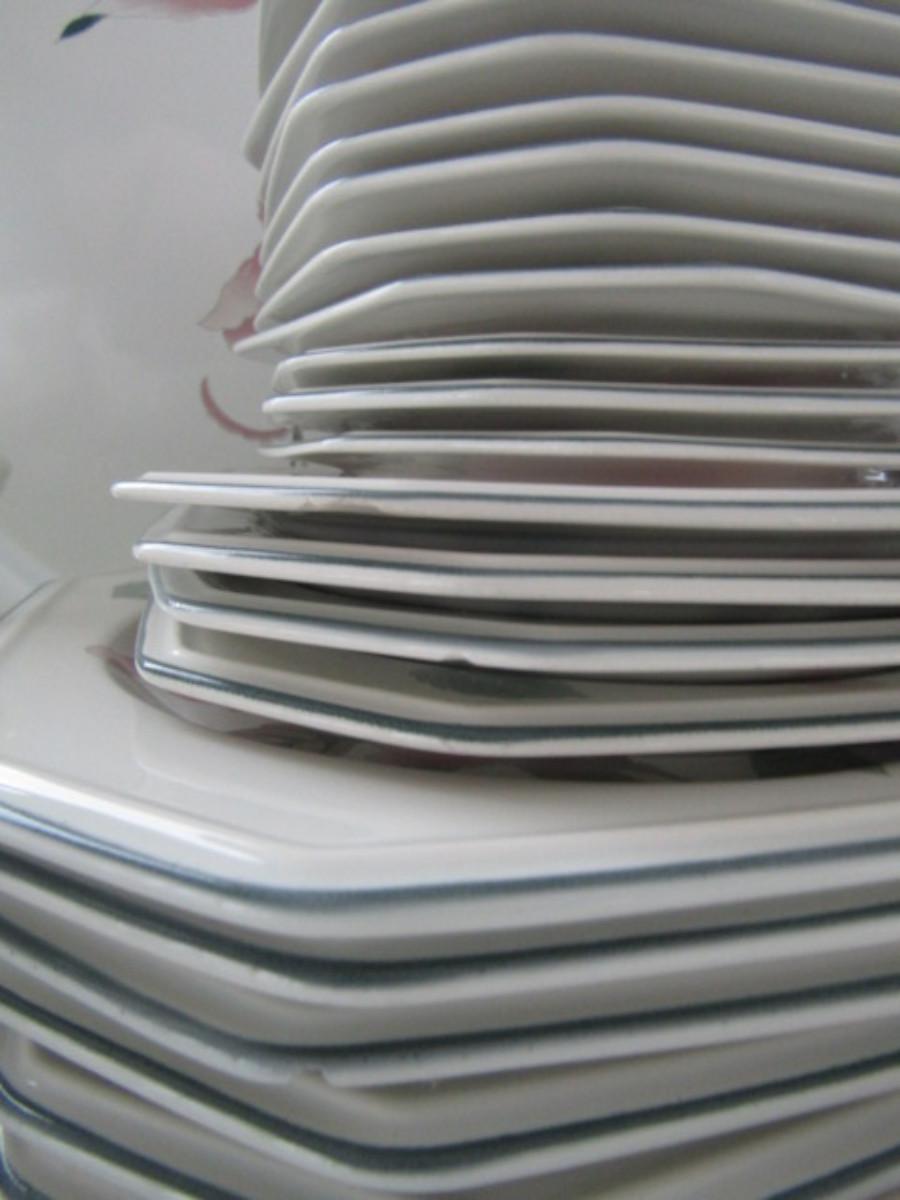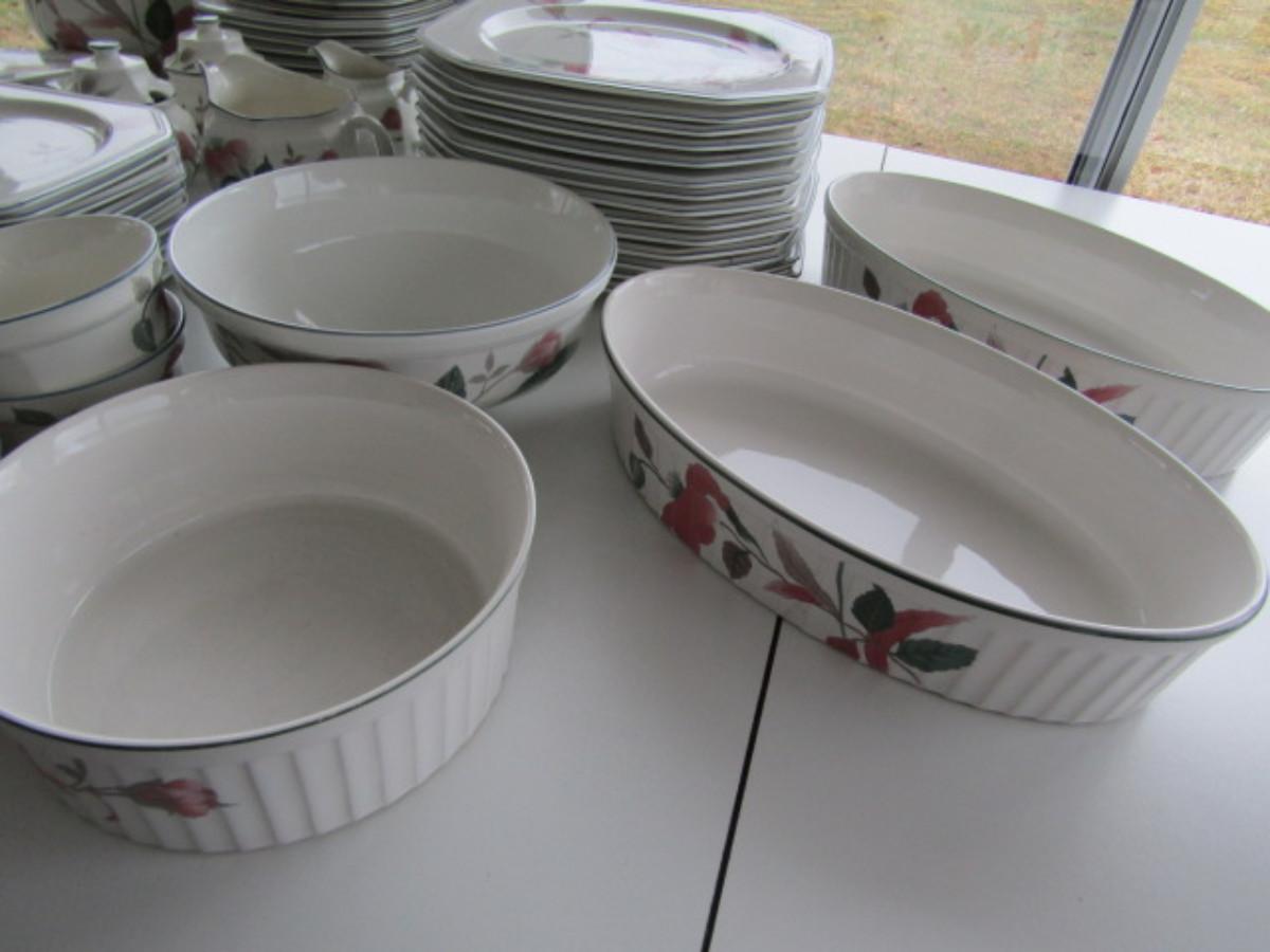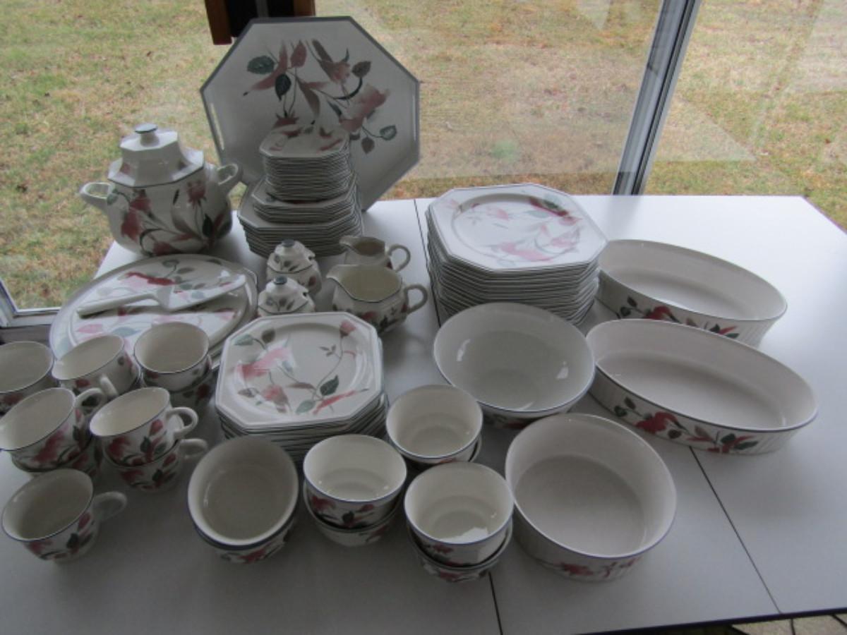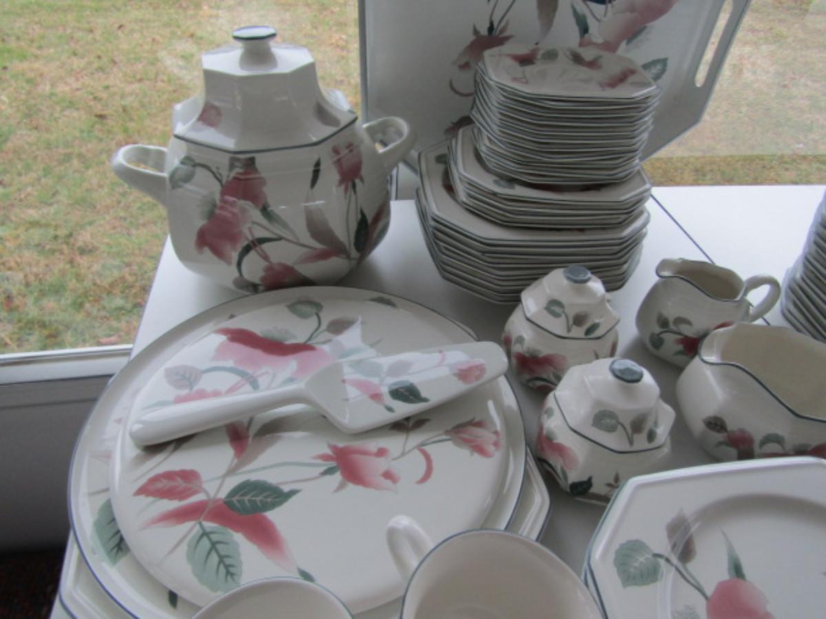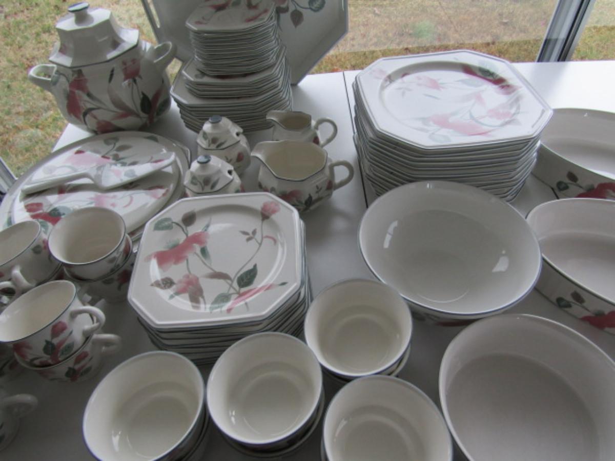 Extensive Collection of Noritake Continental 'Silk Flowers' Pattern China-Dinner Plates-14, Salad Plates-11, Soup Bowls-7, Bread Plates-4, Cups & Saucers- 11 each, Small Cereal Bowls- 8, Oval Baker- 1, Round Baker- 1, Vegetable Bowl- 1, Covered Sugar Bowl- 2, Creamer- 1, Gravy- 1, Taureen with Lid- 1, Serving Tray- 1 , Hexagon Platter- 1, Round Plate- 1, Cake Plate- 1, Server- 1. Expect some chips/cracking. Please see all pictures.