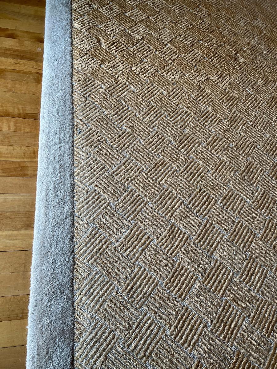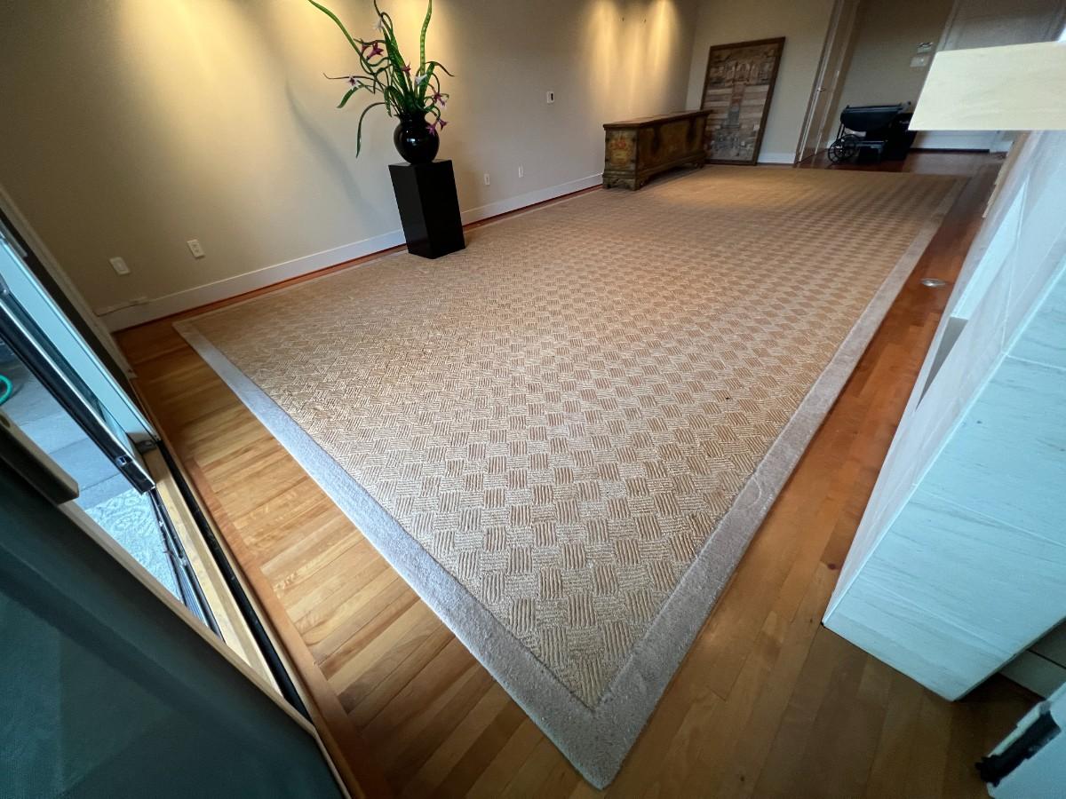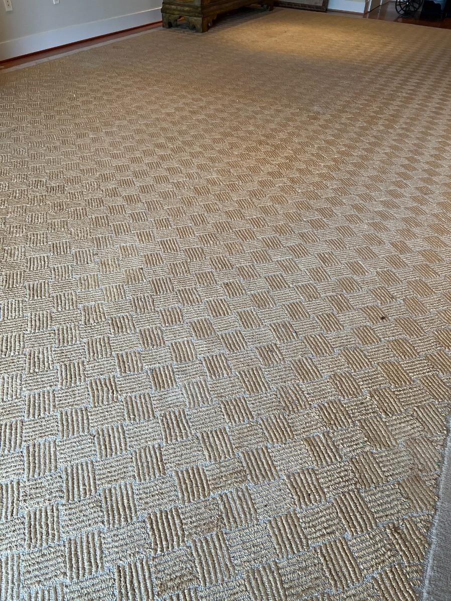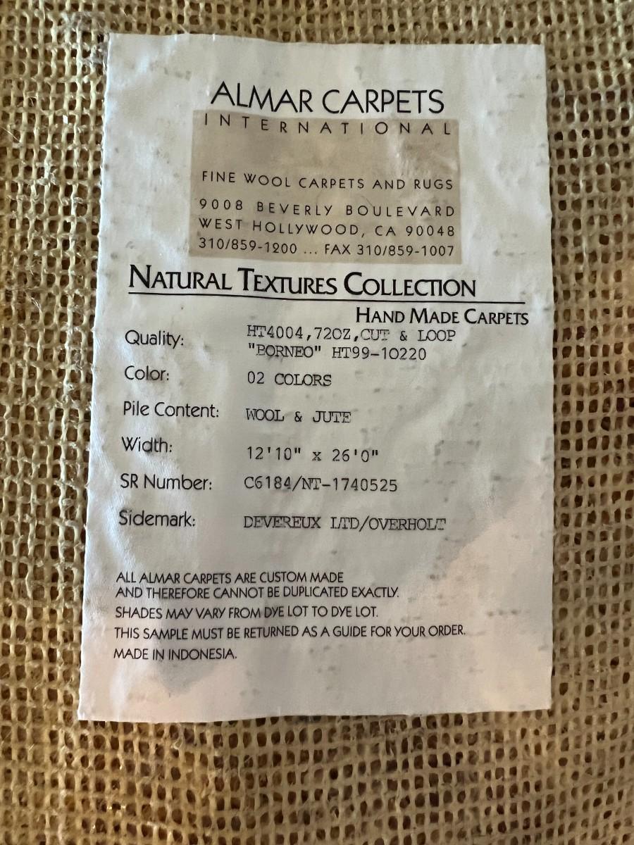 Beautiful and extra large tan woven area rug made by Almar Carpets (previously located in West Hollywood, CA), approximately 26 x 13 feet in dimensions. In good condition, with limited fading. Will require appropriate labor for removal.