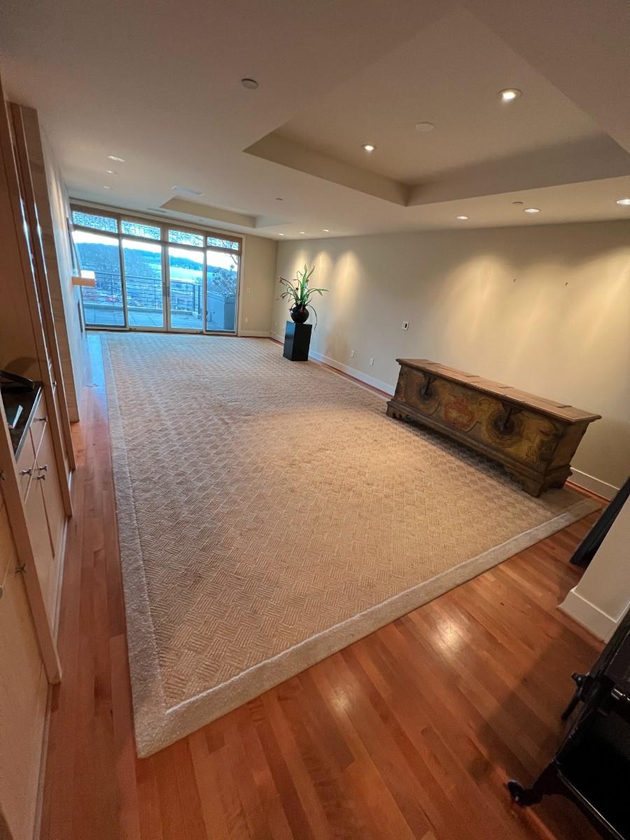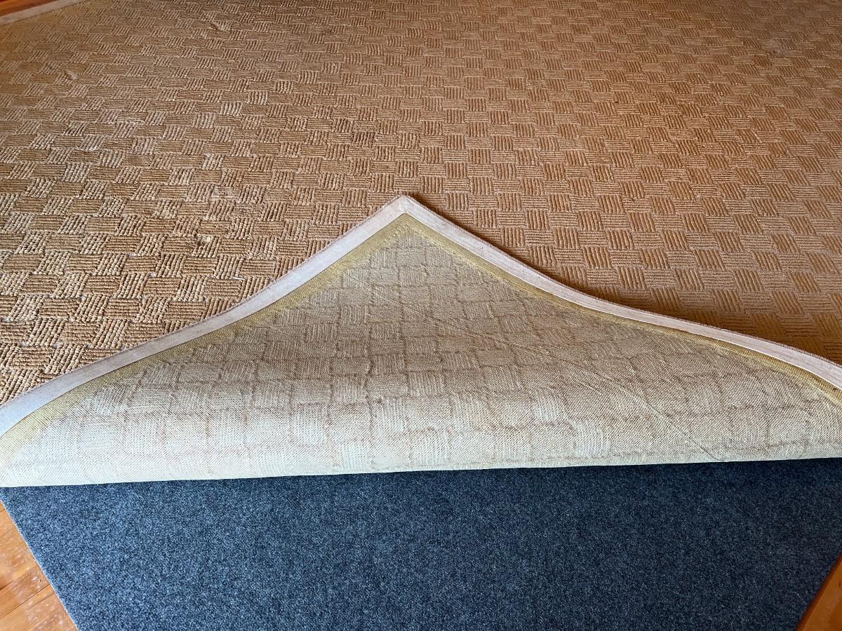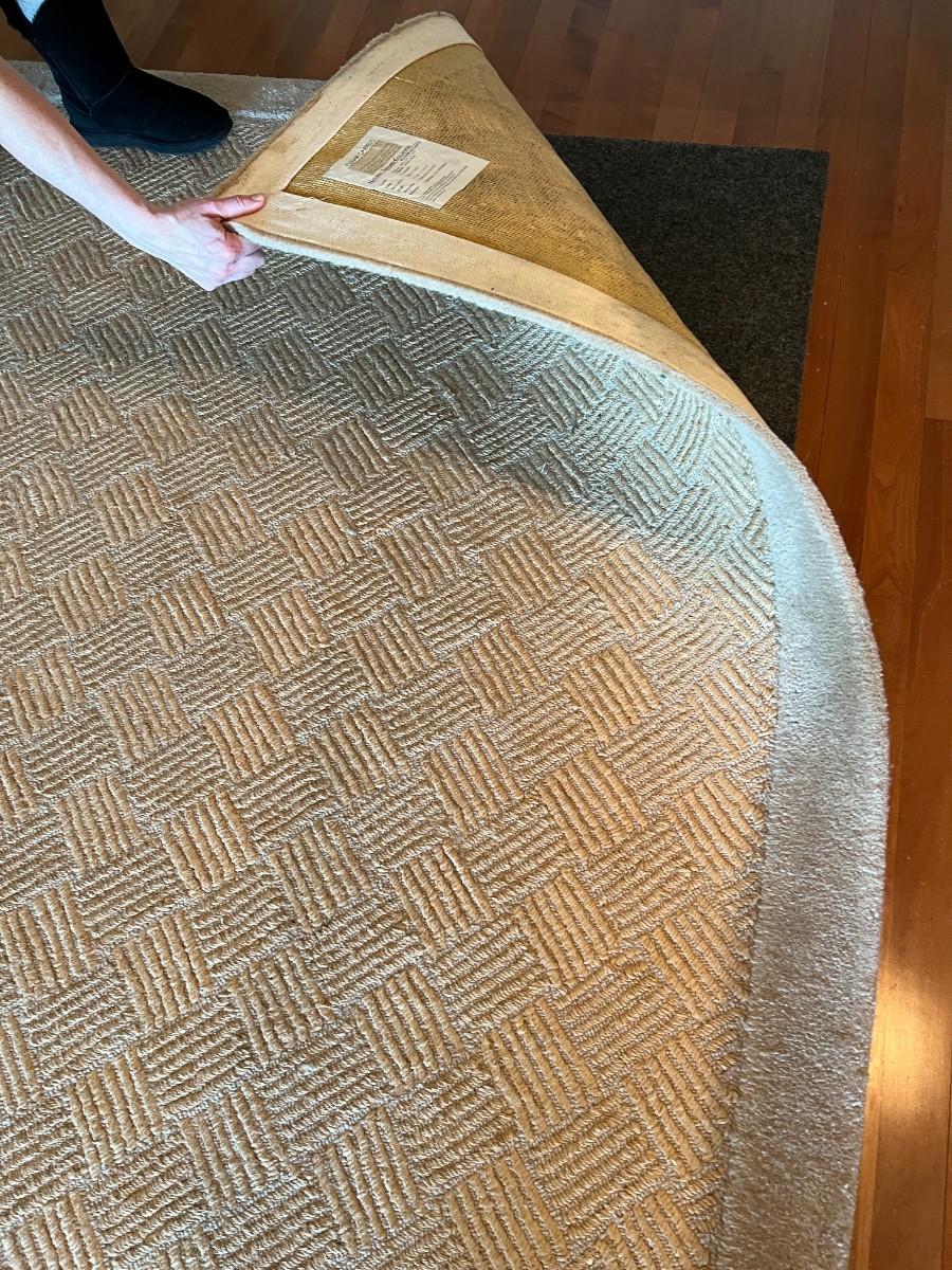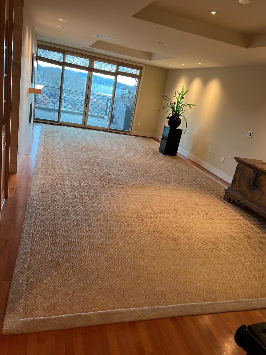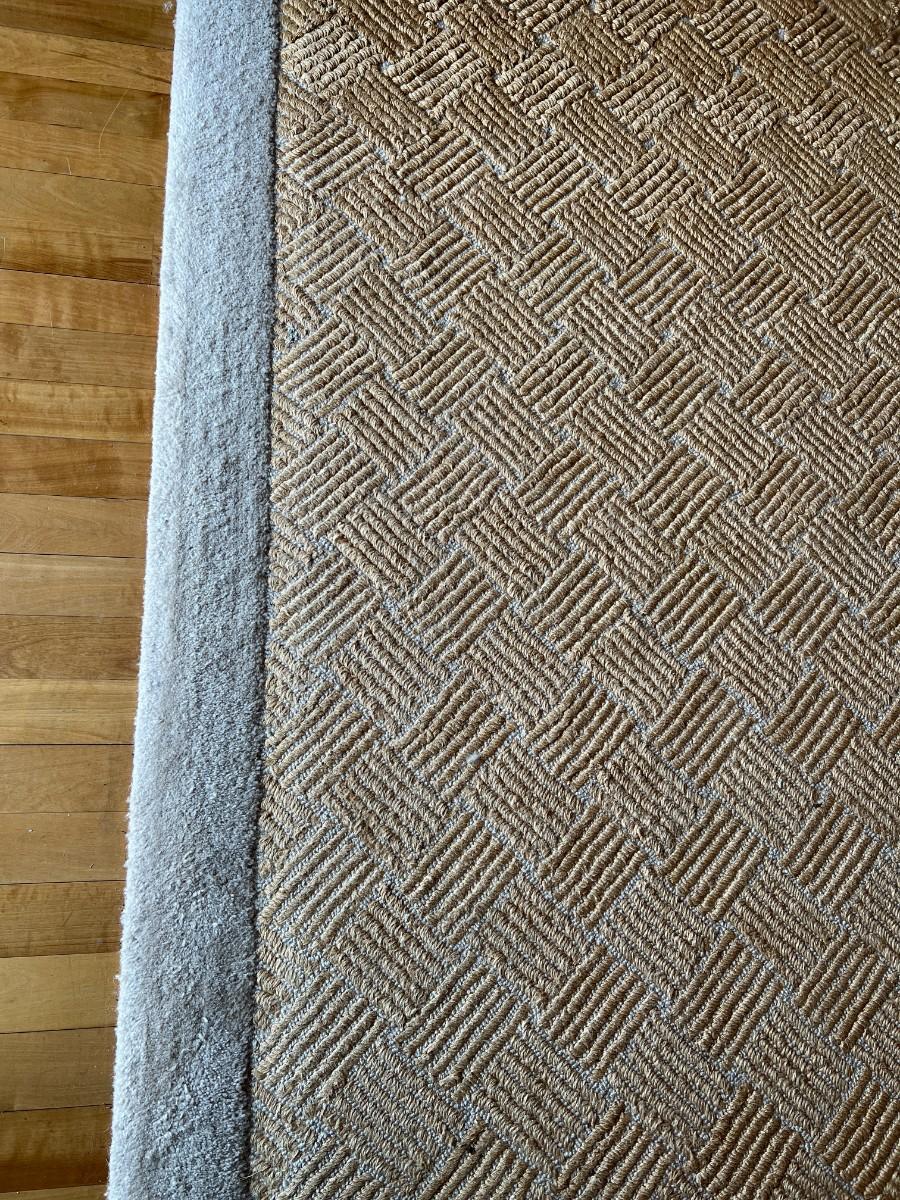 Beautiful and extra large tan woven area rug made by Almar Carpets (previously located in West Hollywood, CA), approximately 26 x 13 feet in dimensions. In good condition, with limited fading. Will require appropriate labor for removal.