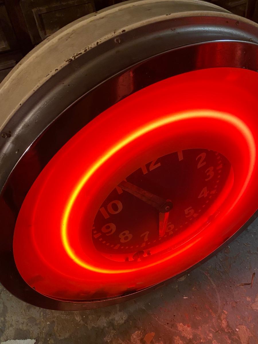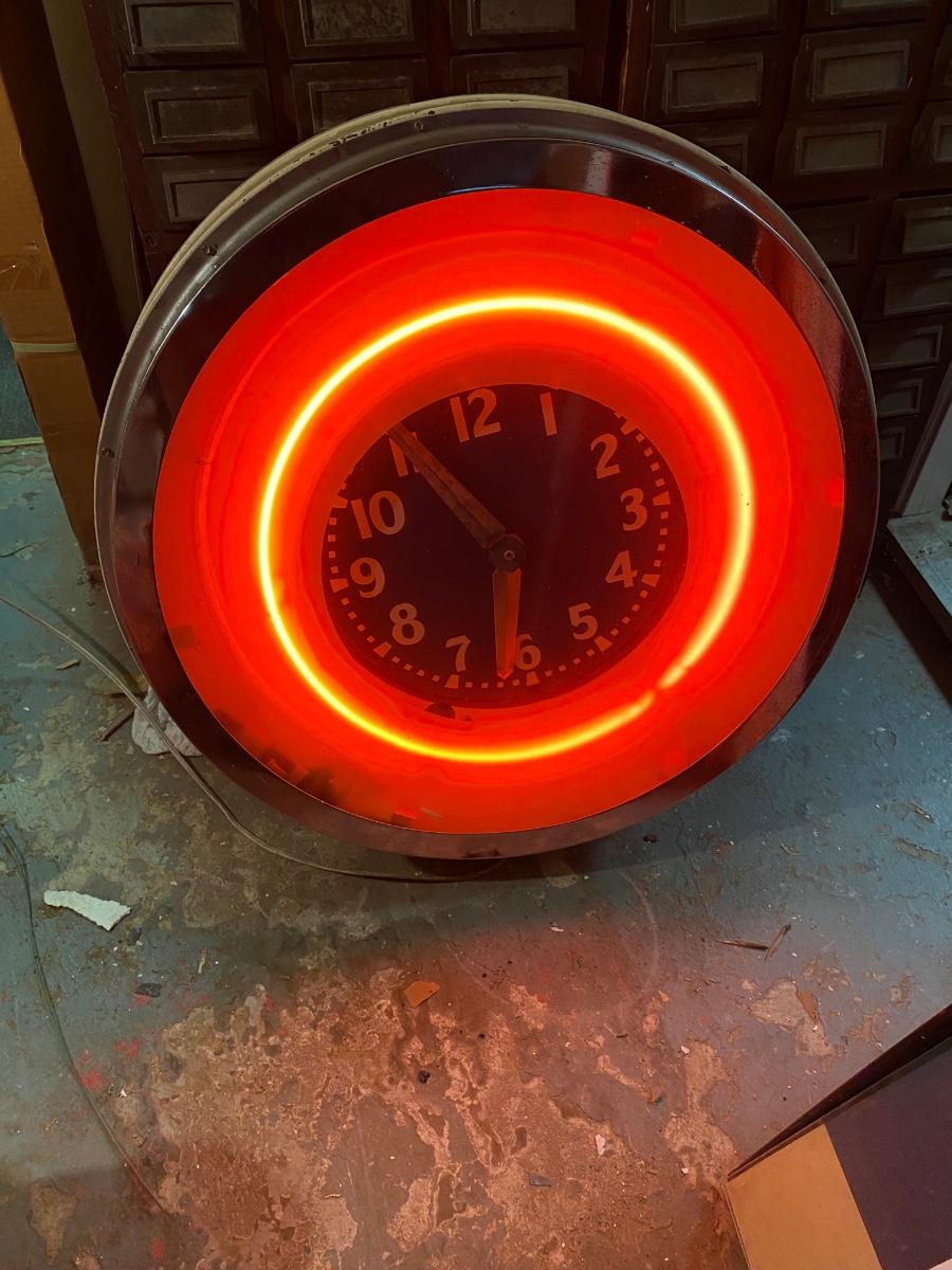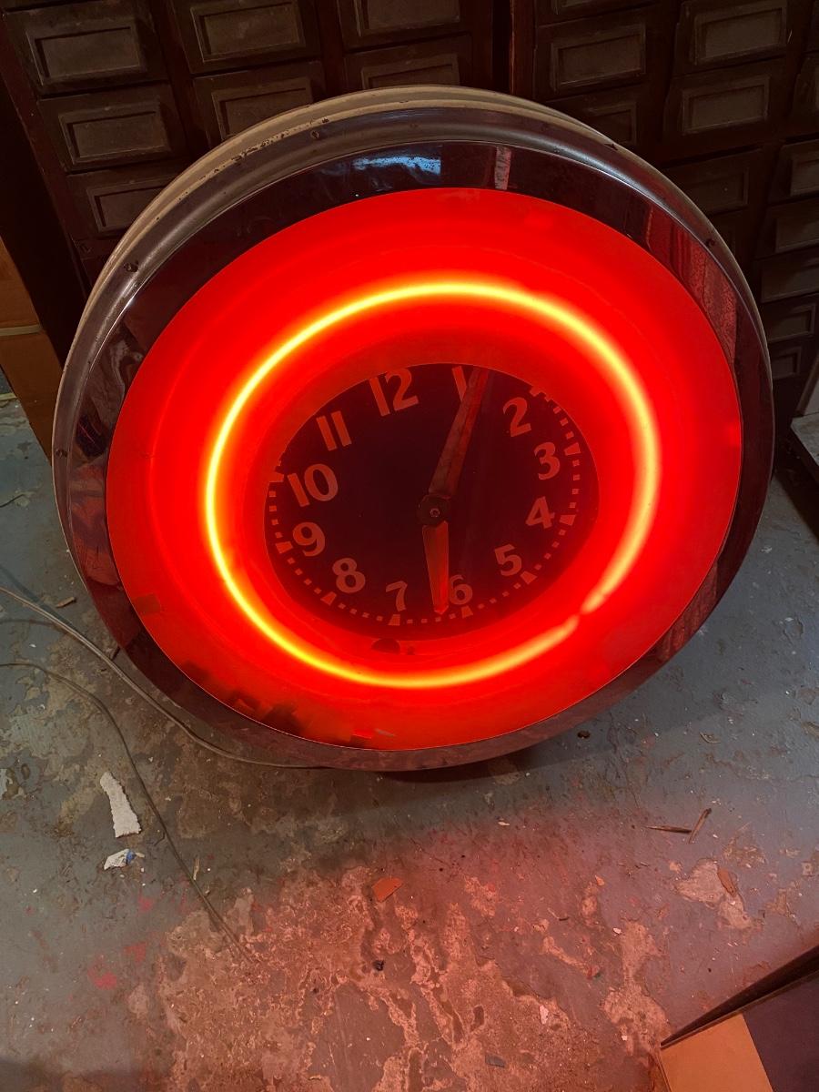 Vintage metal and neon circle clock. Appears to be in working order although unsure how accurate time is. What a statement piece! 32" diameter.