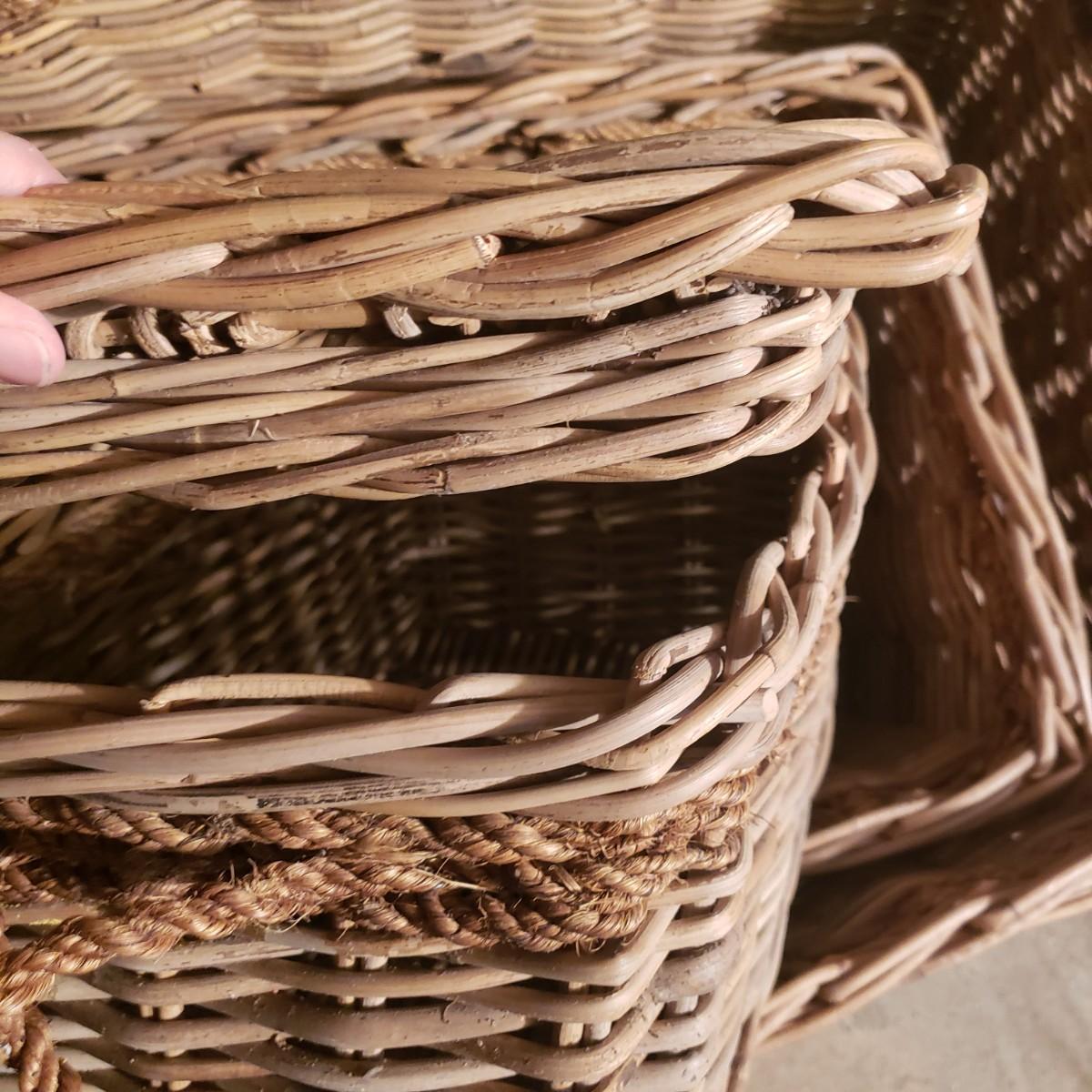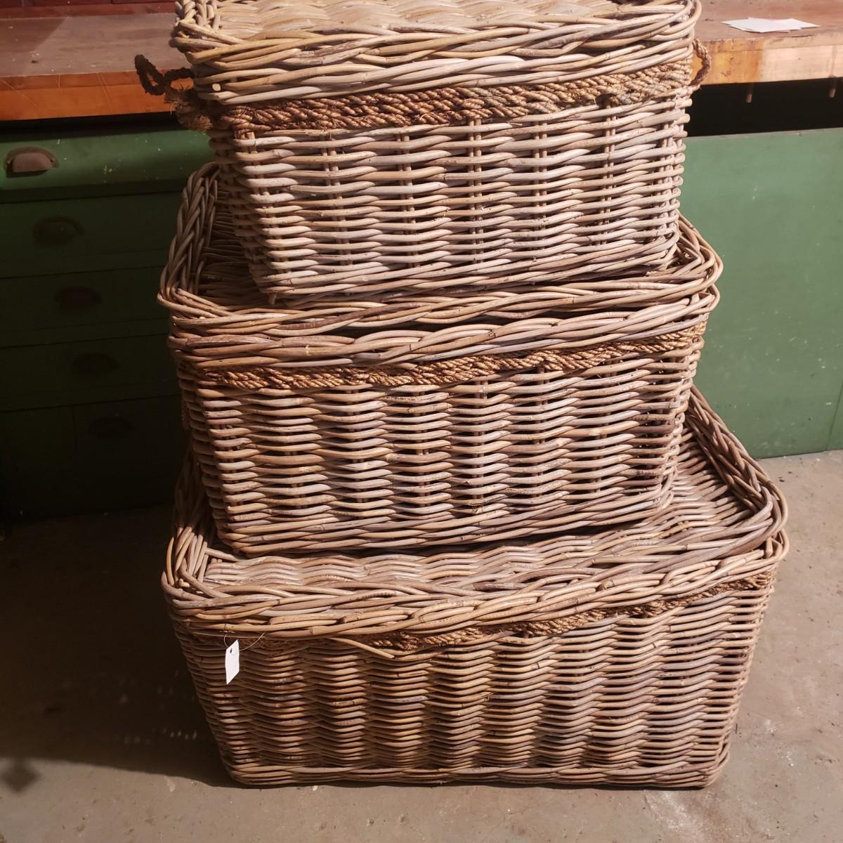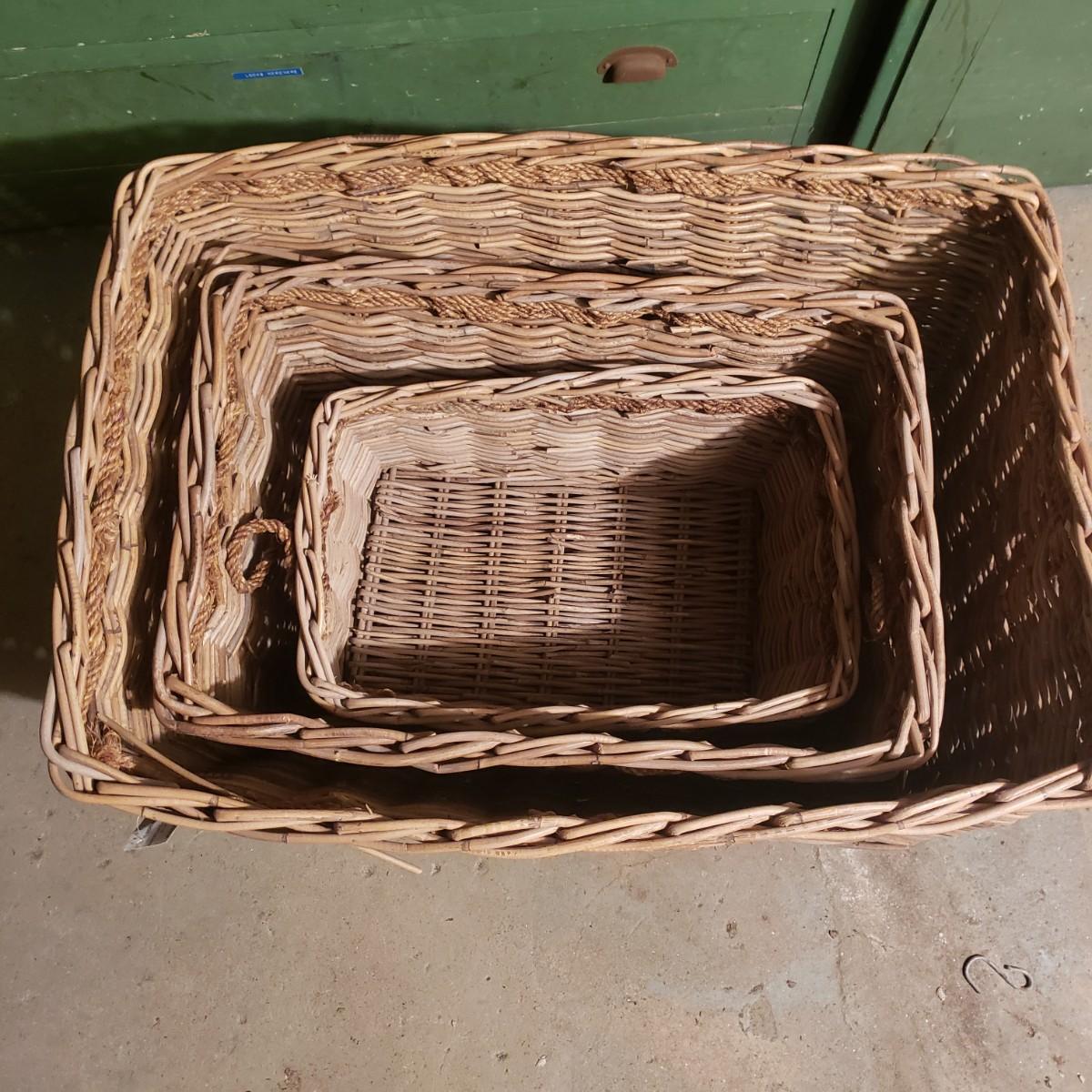 This set of three nesting baskets are perfect for any storage need! The largest basket measures 33" x 22" x 16"H. The baskets have been stored in a dry basement. The largest basket top is a little warped, see pictures. All baskets have