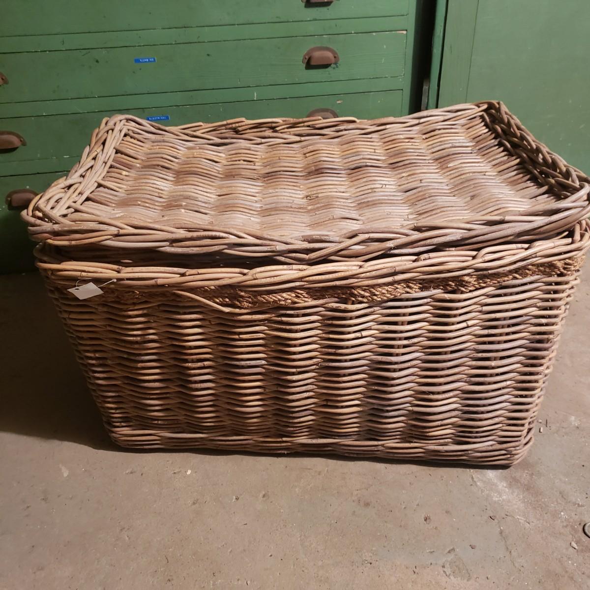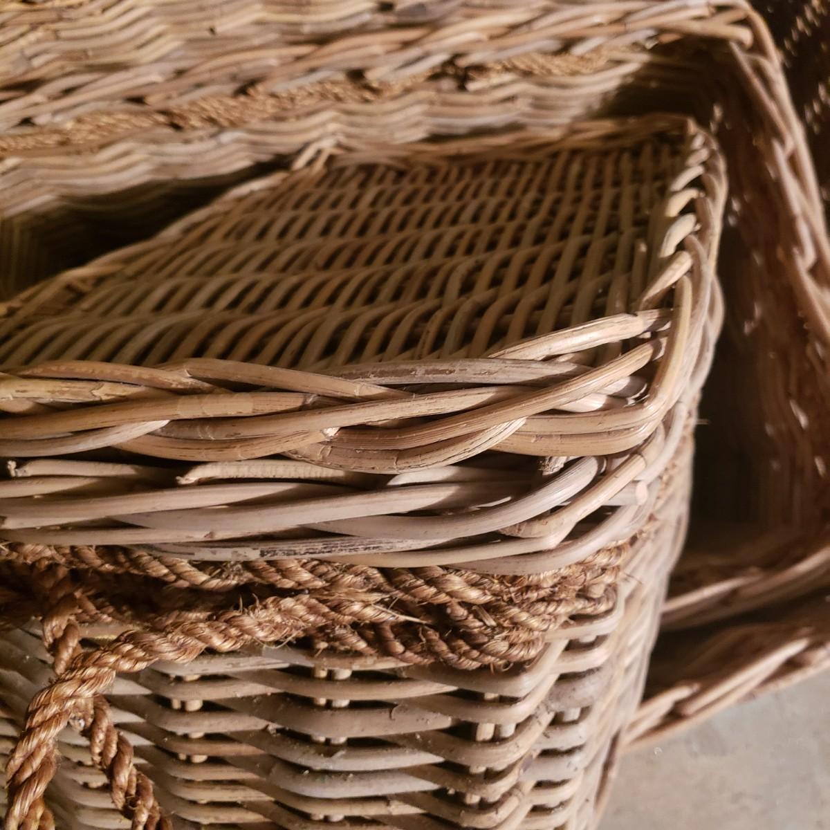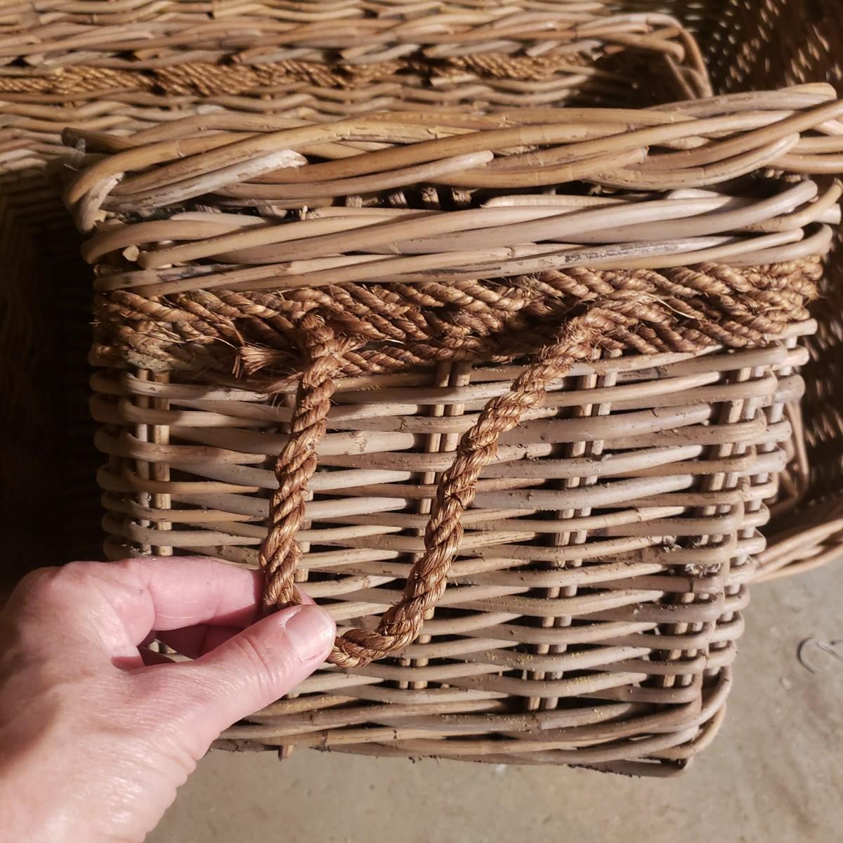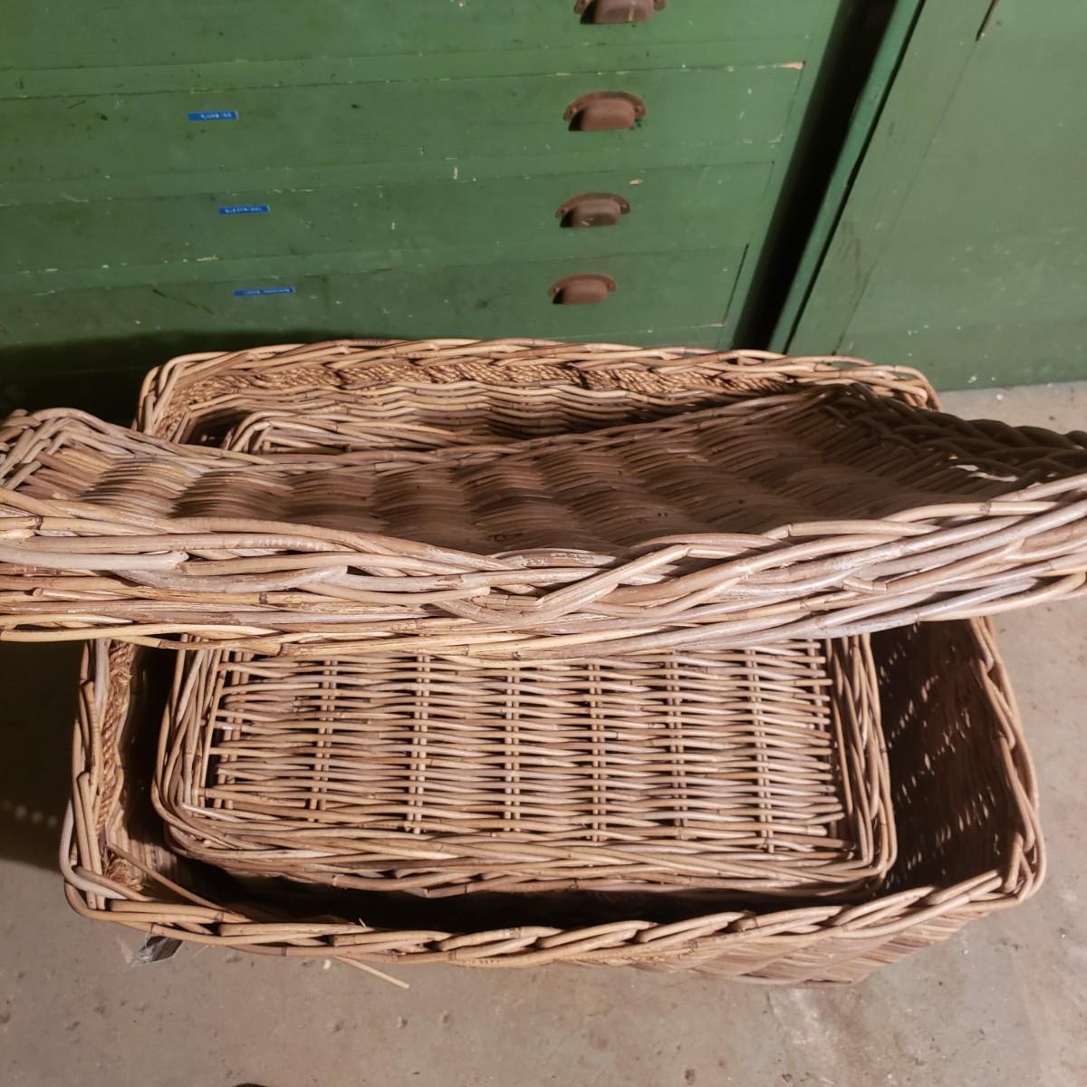 This set of three nesting baskets are perfect for any storage need! The largest basket measures 33" x 22" x 16"H. The baskets have been stored in a dry basement. The largest basket top is a little warped, see pictures. All baskets have