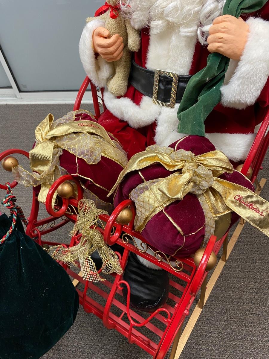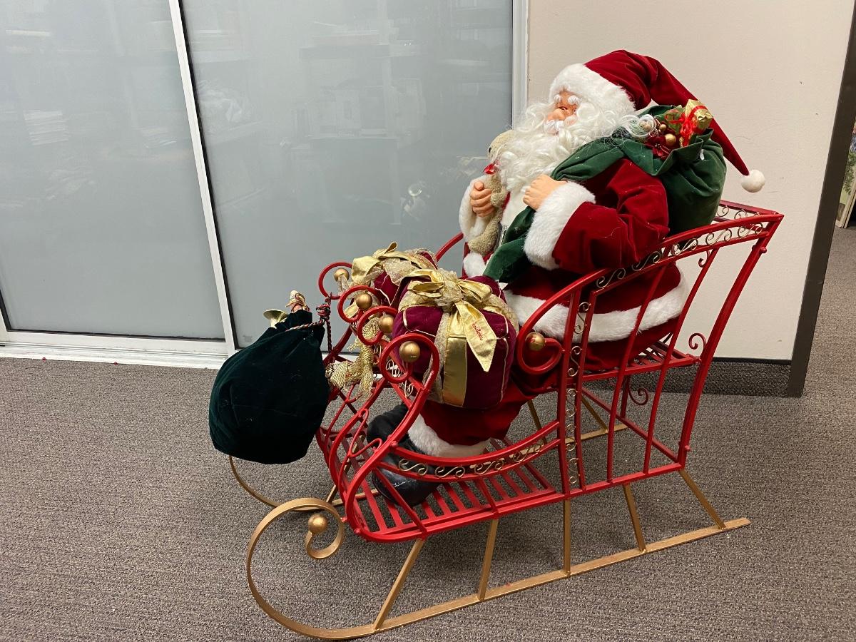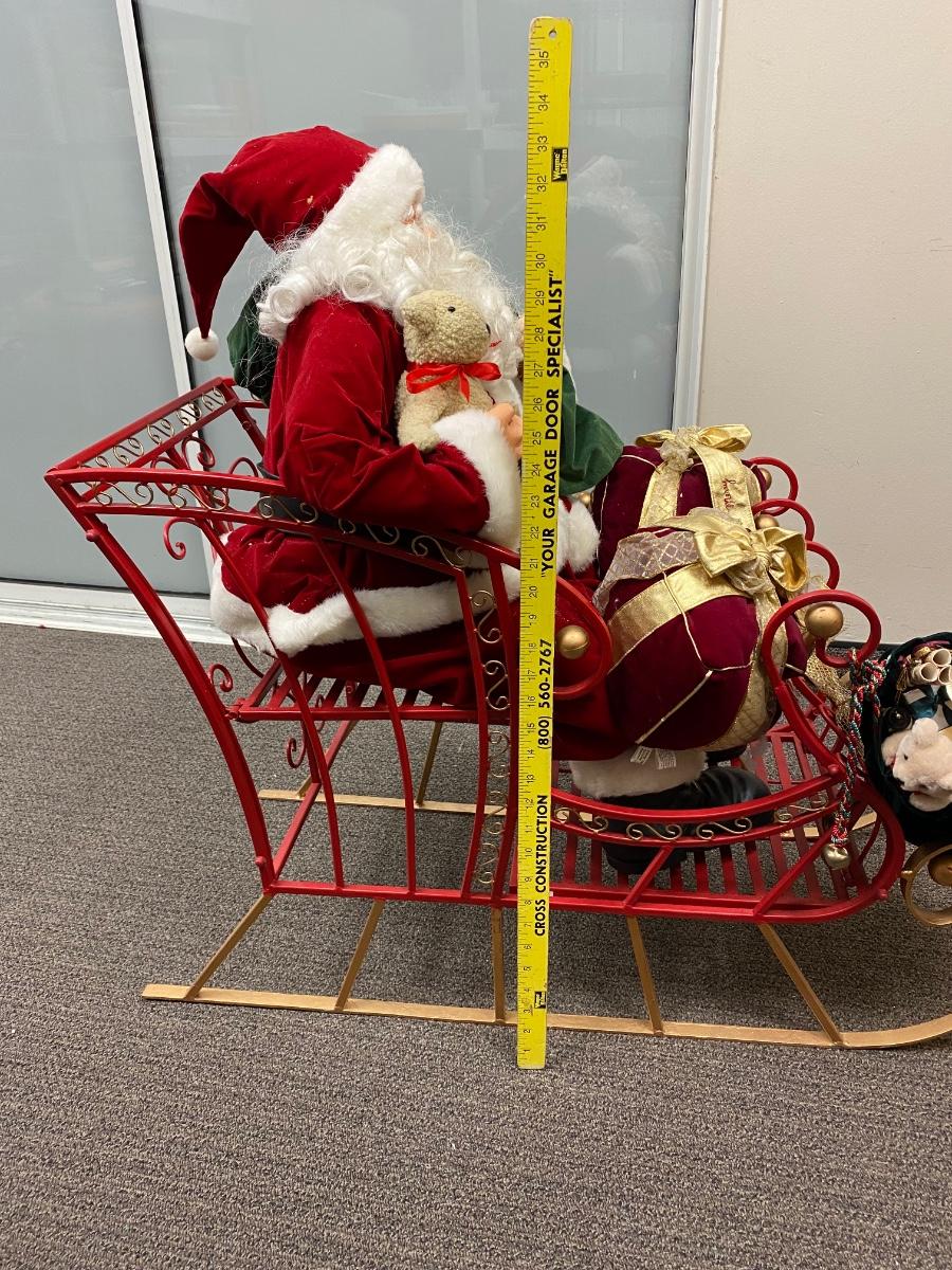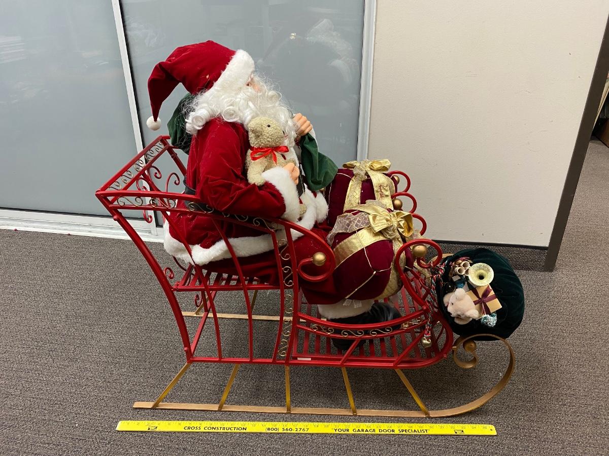 Santa Claus riding in a metal sleigh holiday display. Painted iron sled with large, seated Santa Claus doll. No lights or animatronics. Santa can be removed from sled as can the other added decor. About 3' in length and just as tall.