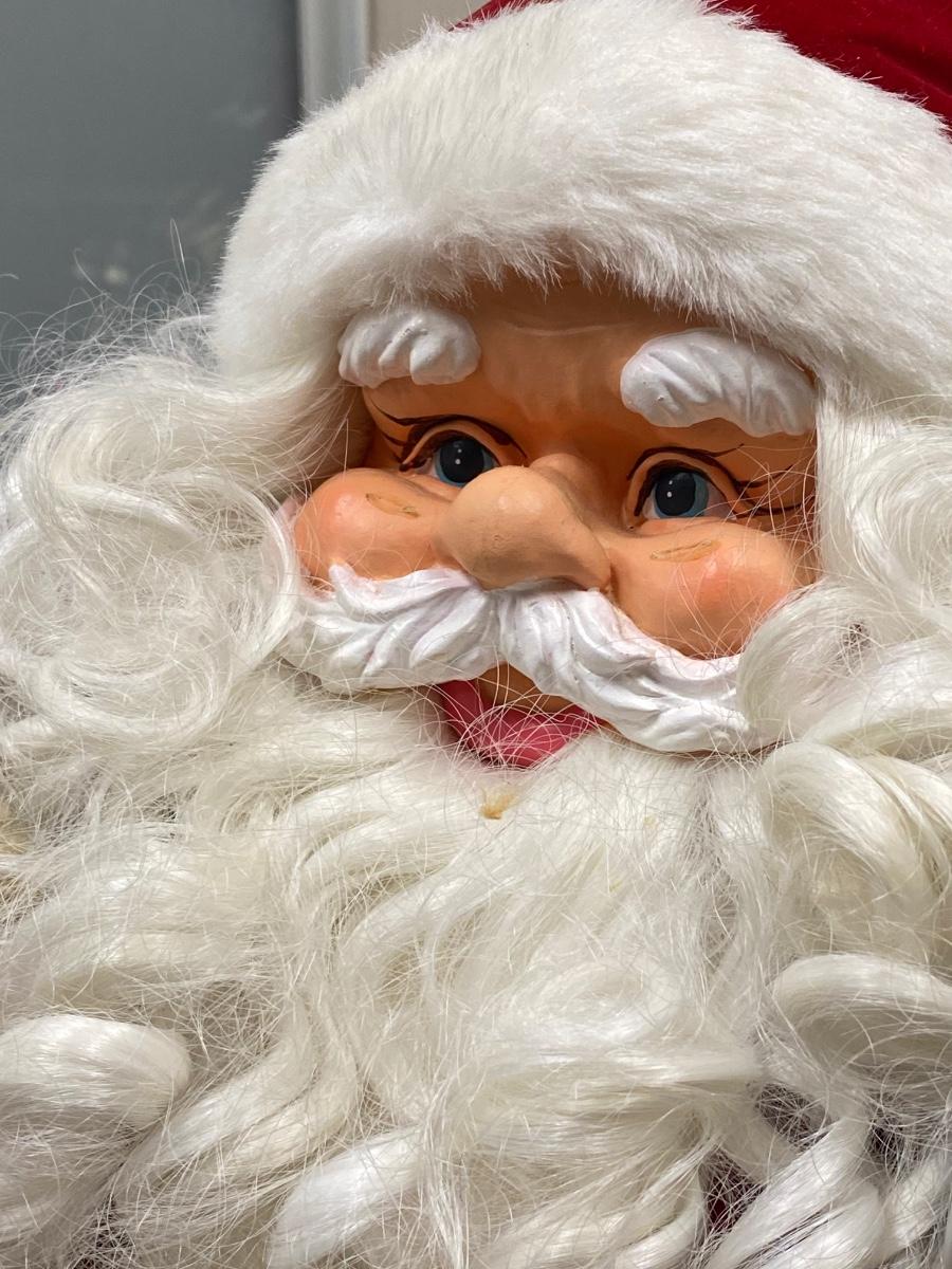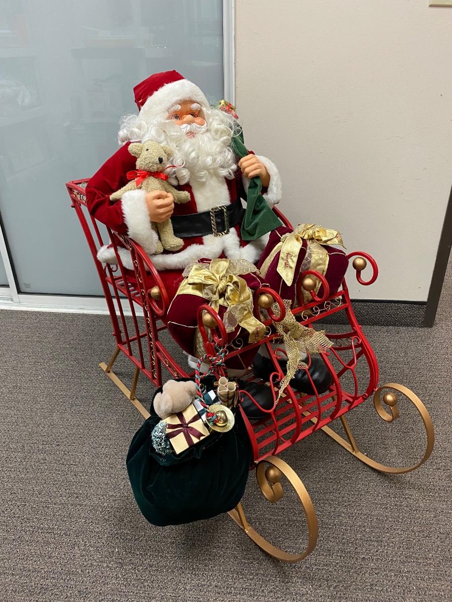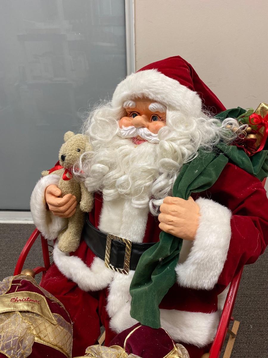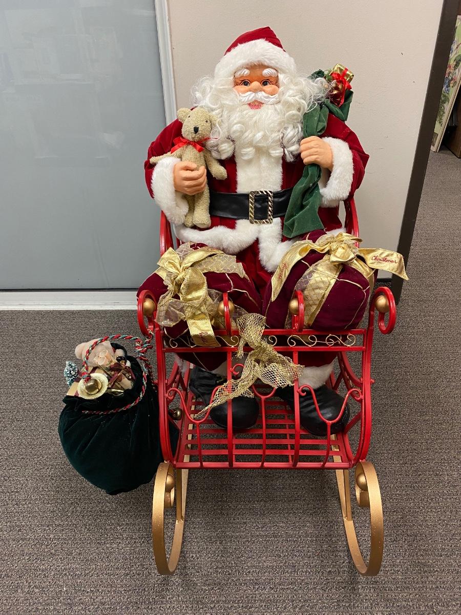 Santa Claus riding in a metal sleigh holiday display. Painted iron sled with large, seated Santa Claus doll. No lights or animatronics. Santa can be removed from sled as can the other added decor. About 3' in length and just as tall.