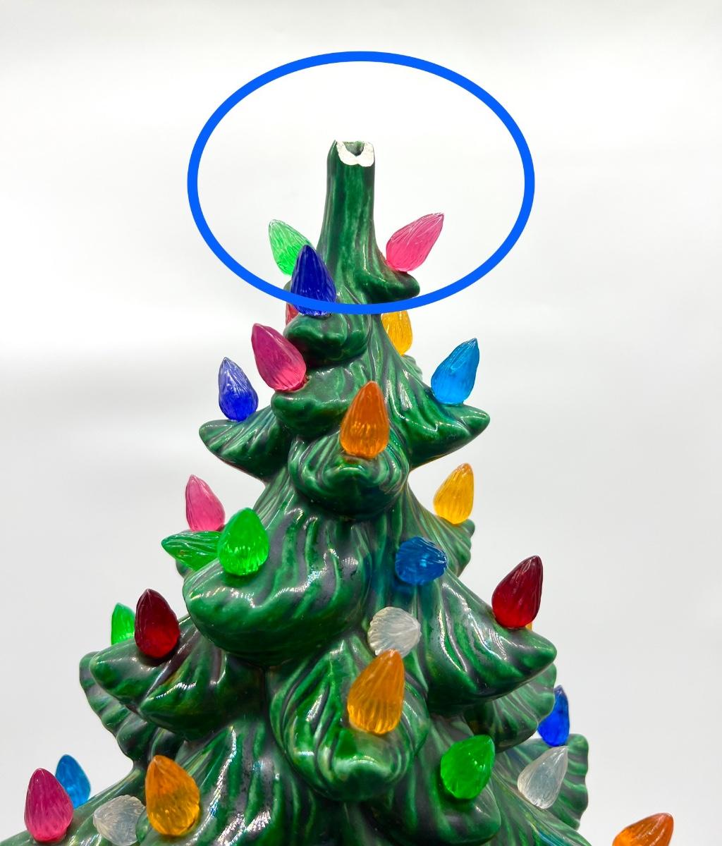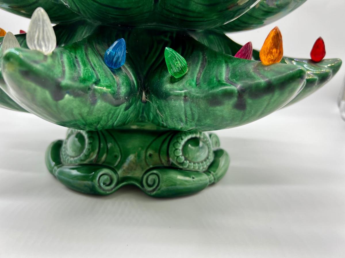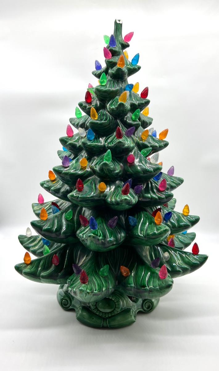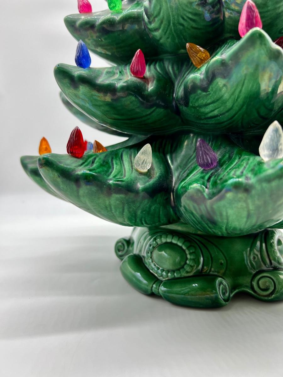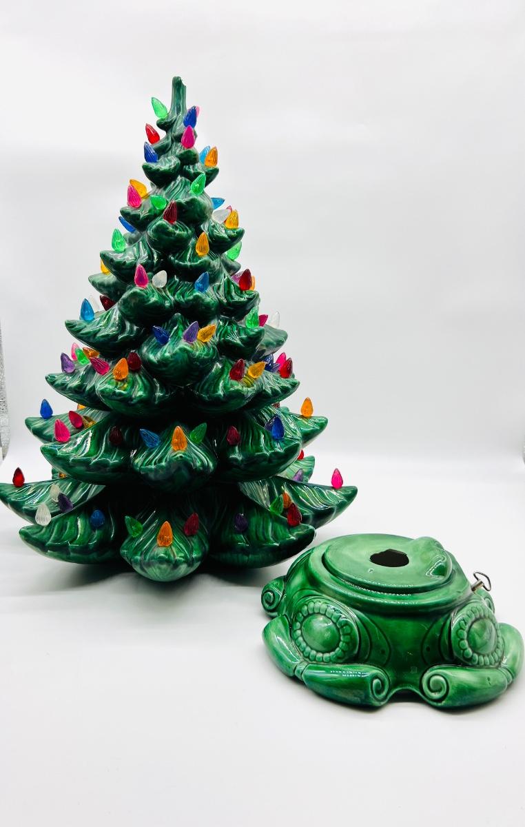 Extra large Vintage Ceramic Christmas Tree with base measures 23 inches tall and approximately 17 inches wide. Base is not musical and does not come with a bulb socket or star for the top. Very top of the Christmas tree has a chip(see picture).