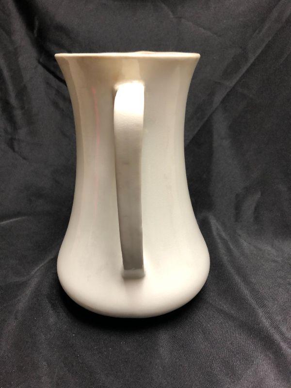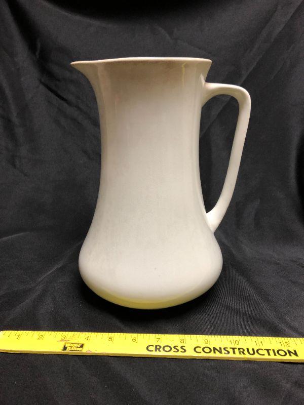 Vintage white water pitcher. Under 12" tall. It is discolored around rim from age. Great as a floral vase.