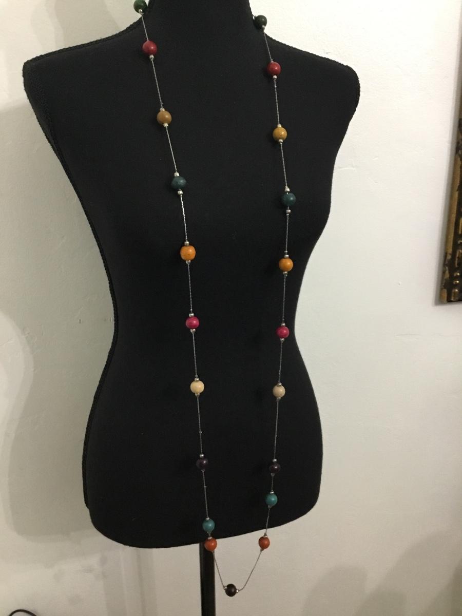 Extra long, silver tone, multicolored wood, beaded fashion necklace