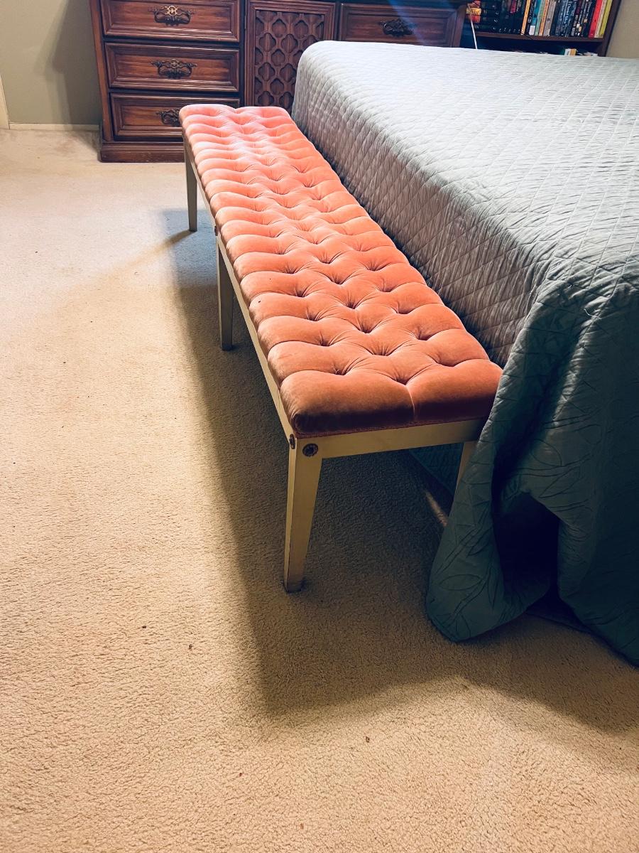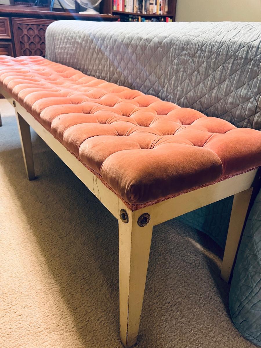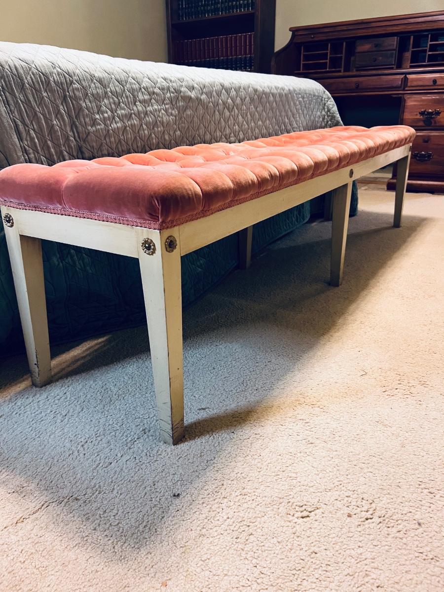French provincial -Extra Long Tufted Bench measures 18 inches tall, 72 inches long, 16 inches deep. Cushion and legs shows some of wear. See pictures.