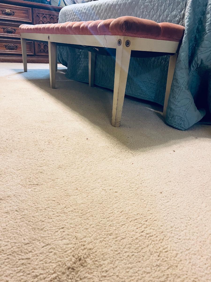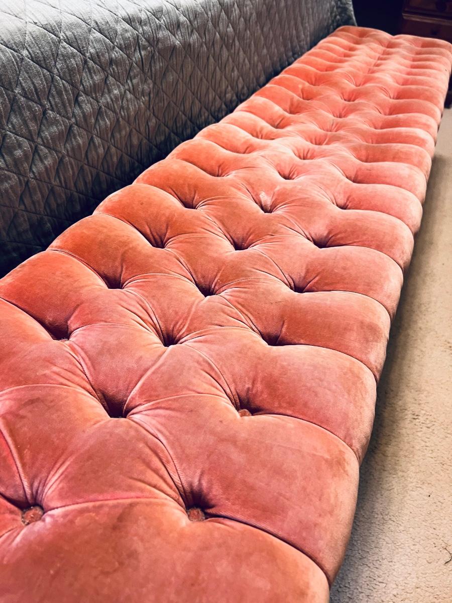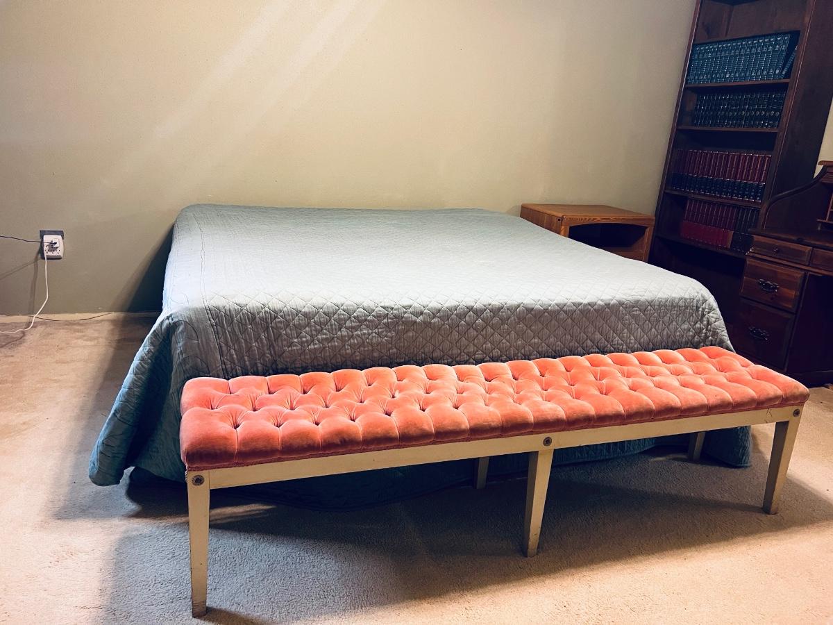 French provincial -Extra Long Tufted Bench measures 18 inches tall, 72 inches long, 16 inches deep. Cushion and legs shows some of wear. See pictures.