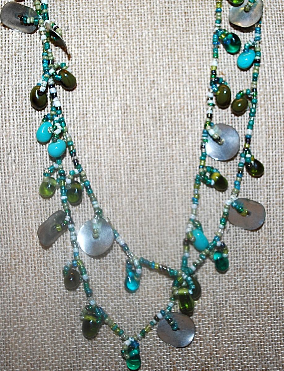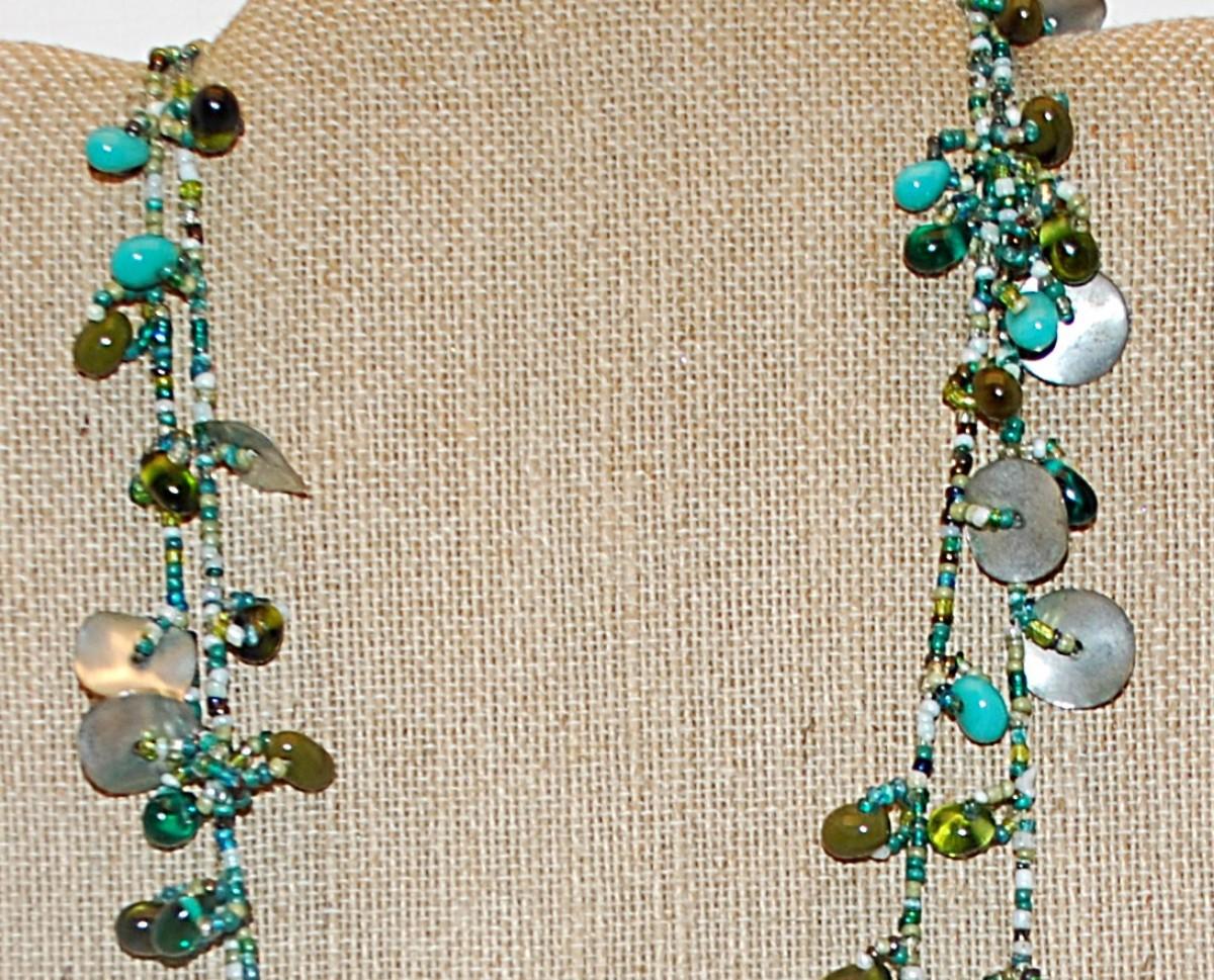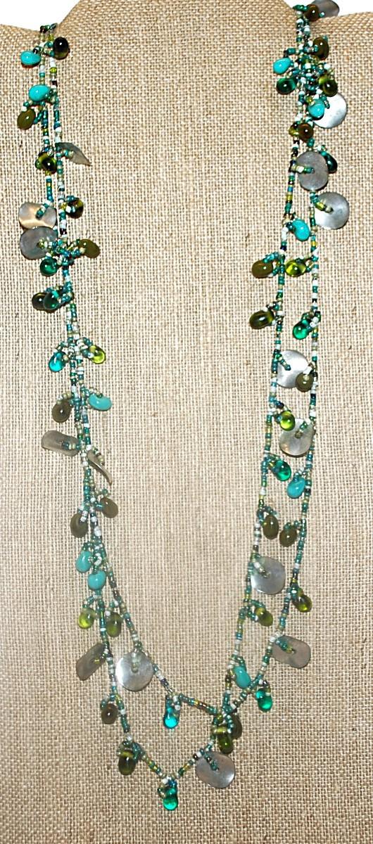 Extra Long WRAP-AROUND NECKLACE with Green & Blue Colored Beads and Metal Disks Accents 58" L