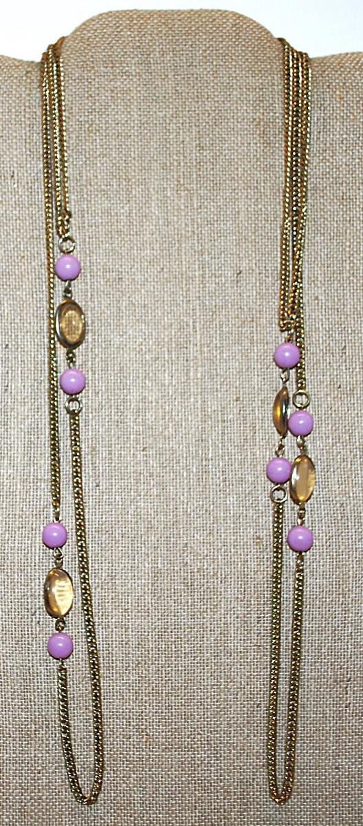 Extra Long WRAP-AROUND NECKLACE with LAVENDER Beads & Clear Oval Accents on a Gold Tone Chain and Snap Release Clasp 54" L