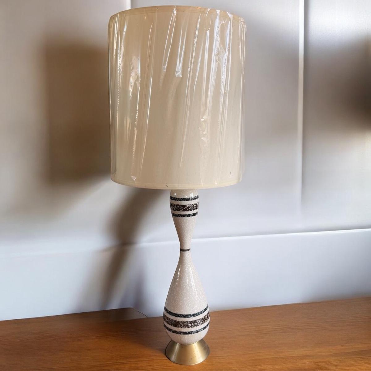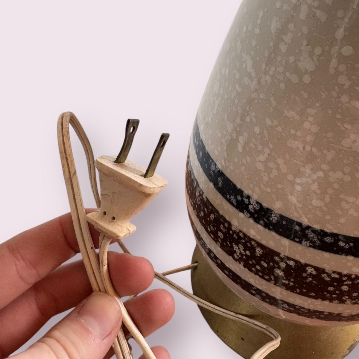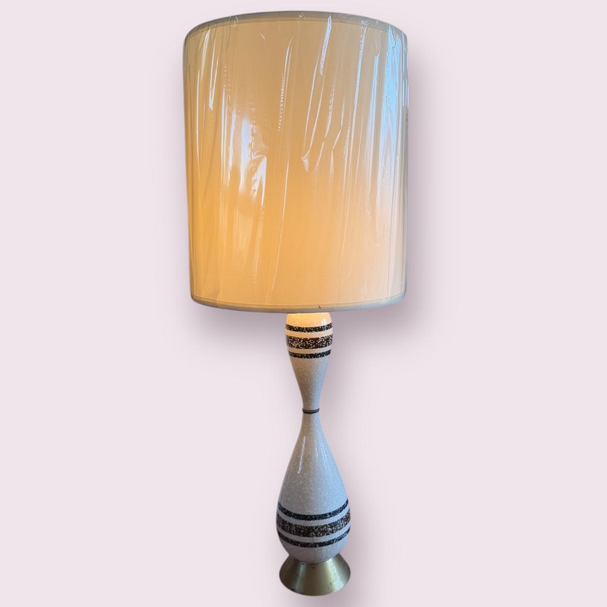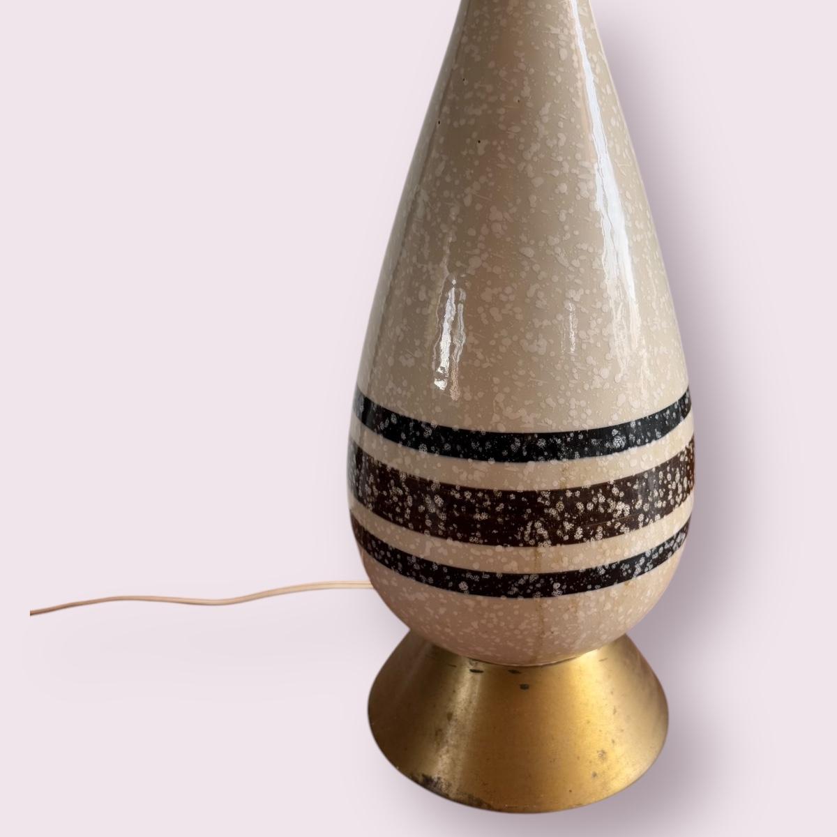 Lot includes one Mid Century style ceramic lamp. The lamp has a brass bottom with several other brass features. The lamp measures 17” x 47”H. It powered on when plugged in - see pictures included. Lamp has a on/off switch.