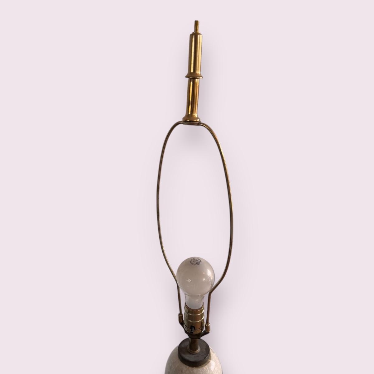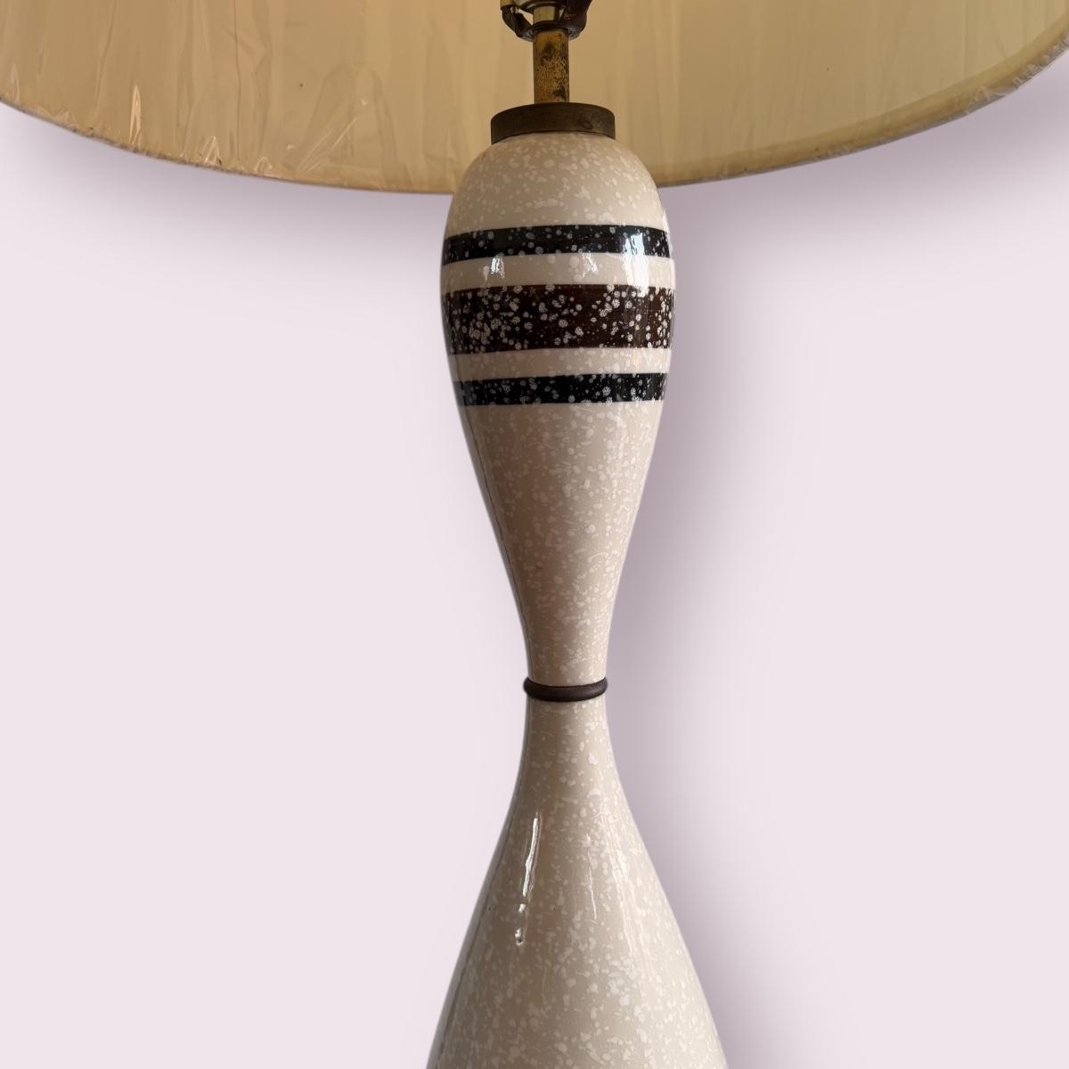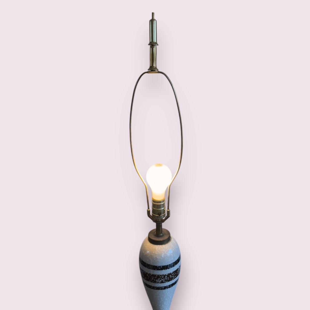 Lot includes one Mid Century style ceramic lamp. The lamp has a brass bottom with several other brass features. The lamp measures 17” x 47”H. It powered on when plugged in - see pictures included. Lamp has a on/off switch.